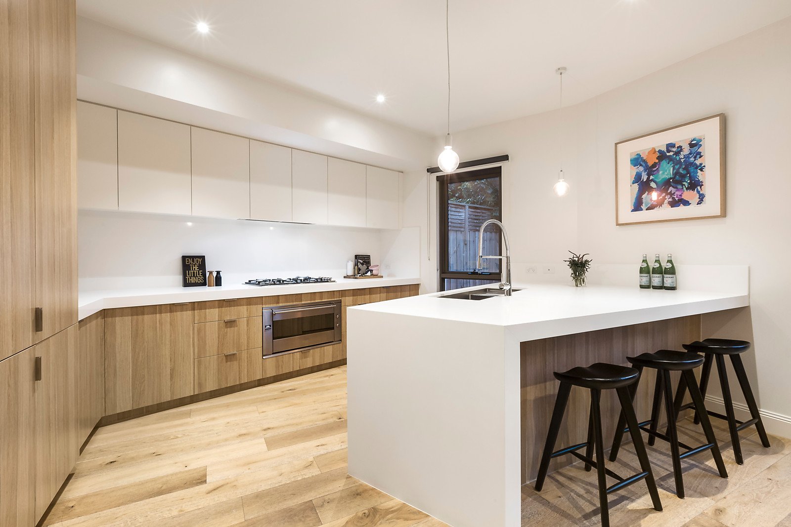 Upon entering the home, you are greeted with a spacious, ground-floor master bedroom, overlooking the park. A generous his and her walk-through wardrobe leads to the master ensuite which has been updated to suit modern tastes. As well as a designated home office, the ground floor features a formal living area and an open-plan living and dining space, fully equip with a modern, Rinnai gas heater for optimum temperature control. To ensure an abundance of natural light fills the home at all times, a generous skylight has been strategically integrated into the space.