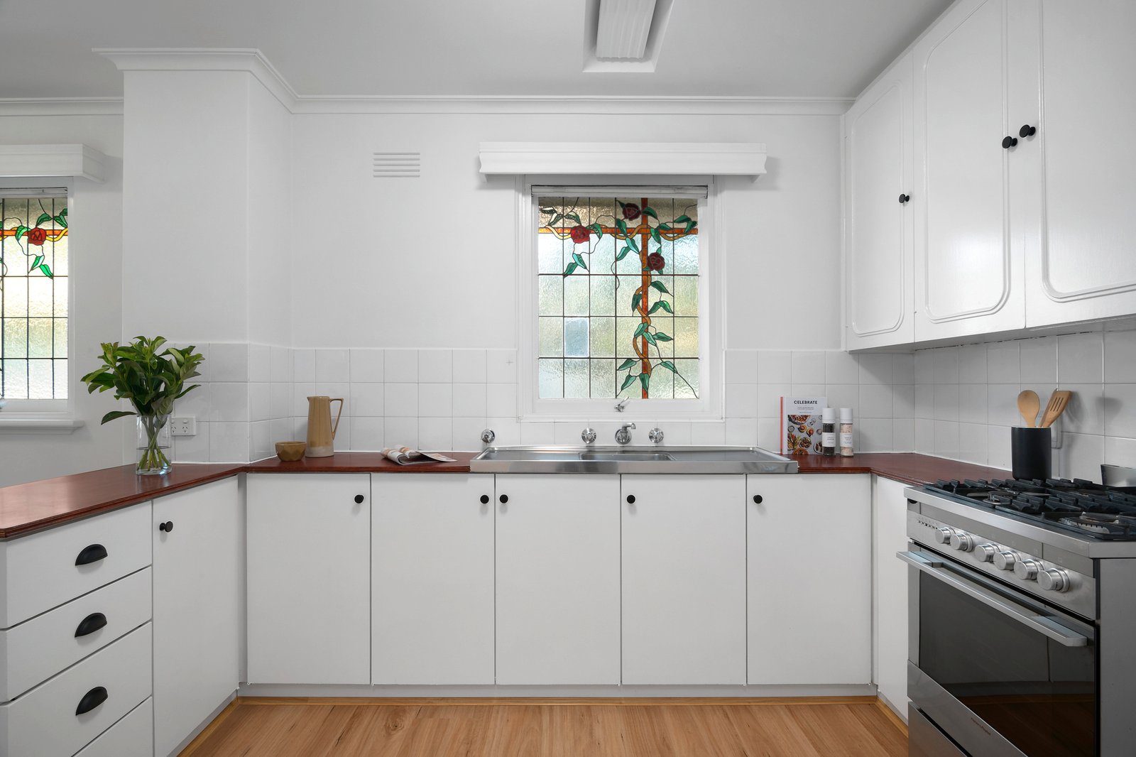 This pleasant and comfortable home is particularly well-zoned to separate its bedrooms from a generous kitchen/meals area with character stained-glass windows and an impressive lounge/dining room with delightful leafy outlooks. Each of the bedrooms is generously proportioned with built-in robes. The bathroom is fully renovated with a frameless screened shower and a full-sized bathtub, with an adjacent separate toilet. The study is the most lavishly light-filled and appealing workspace imaginable.