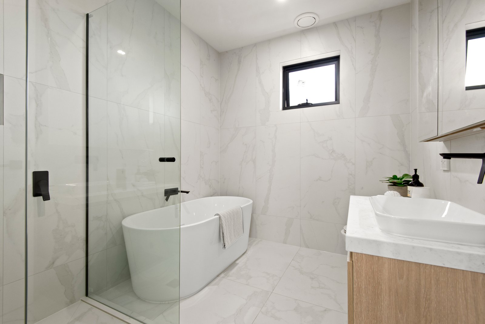 The home offers four bedrooms and three bathrooms, including a luxurious master suite with a beautifully tiled ensuite. Each bedroom features built-in or walk-in robes, ensuring abundant storage, while an additional bathroom on each level adds to the home’s practicality and comfort.