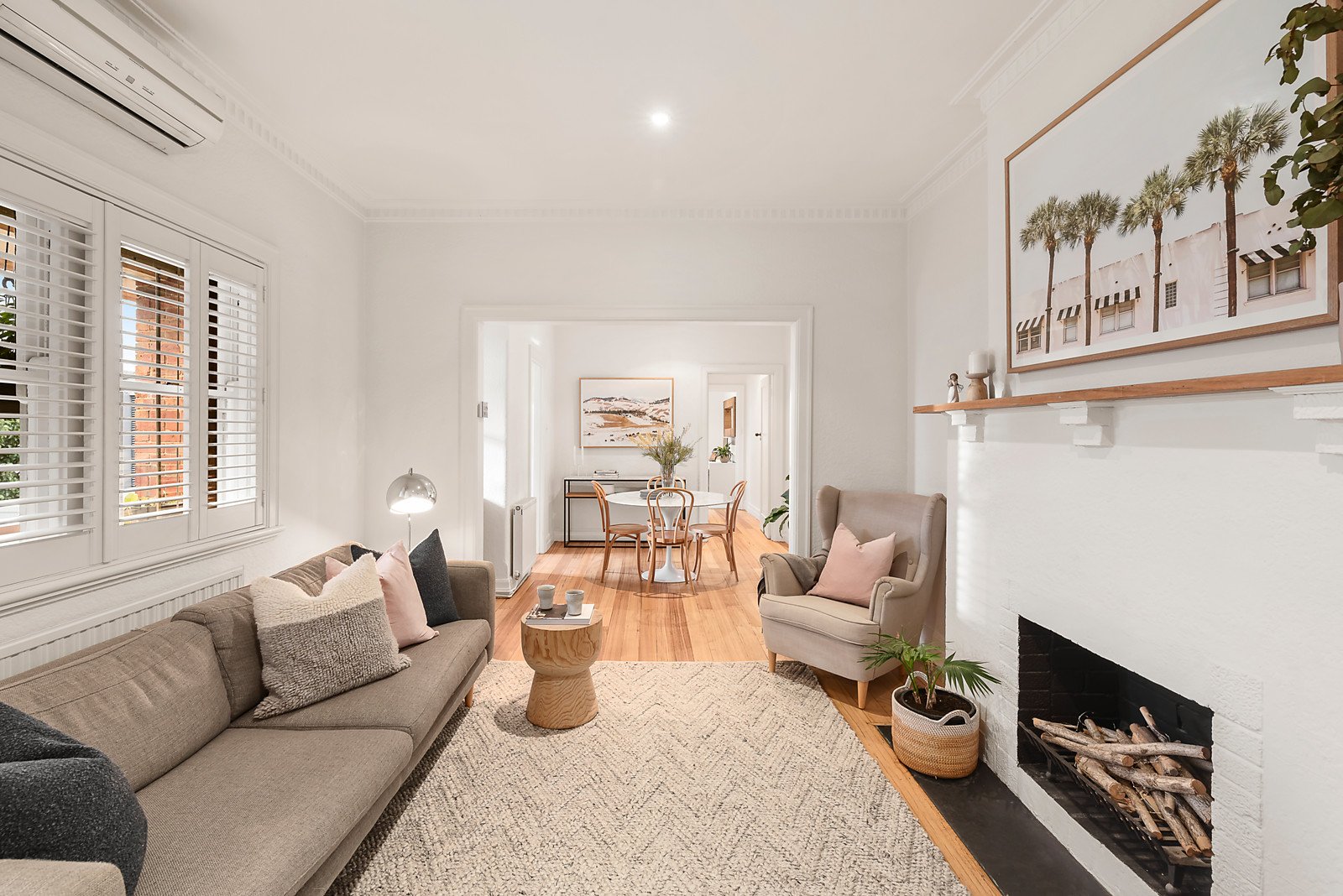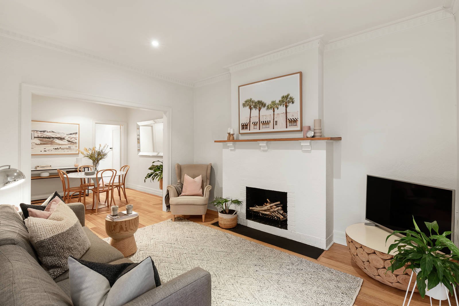 Brimming with beautifully preserved Art Deco detail, plasterwork, towering ceilings and with polished hardwood under foot, this light-filled home reveals an ambient lounge warmed by a fire place, as well as dining with a gorgeous built-in bar and a semi-attached kitchen that conveniently opens to an outdoor BBQ nook. Each of the bedrooms is well-proportioned and appointed with built-in robes, plus there is secure intercom entry, hydronic heating and plantation shutters that sit comfortably alongside the home's original character.
