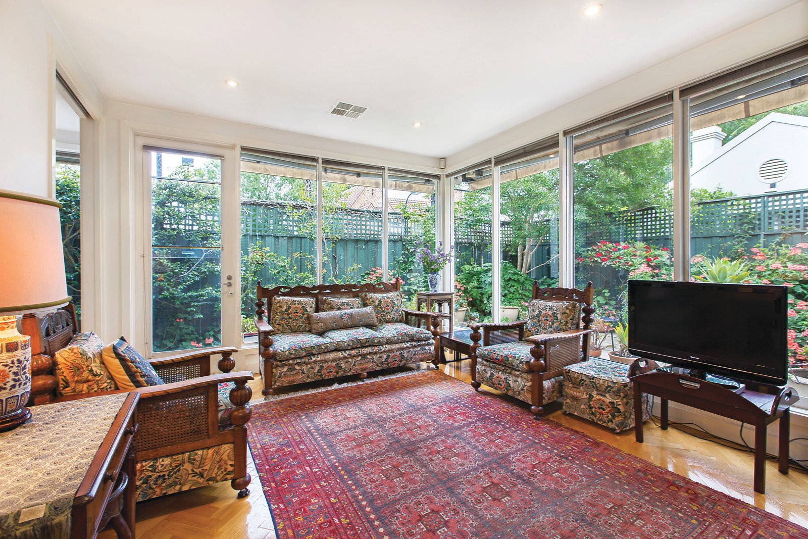 Set well back behind a beautifully landscaped garden, a gated forecourt introduces a wide central hall featuring oak parquetry floors and high ceilings. The magnificently proportioned formal sitting and dining room with a gas fireplace enjoys lovely garden outlooks. The superbly appointed gourmet granite kitchen, light-filled casual dining area and inviting living room open to a leafy private north-facing courtyard. A glorious main bedroom with ample built in robes and stylish en-suite is matched by a second double bedroom with built in robe and pristine bathroom.