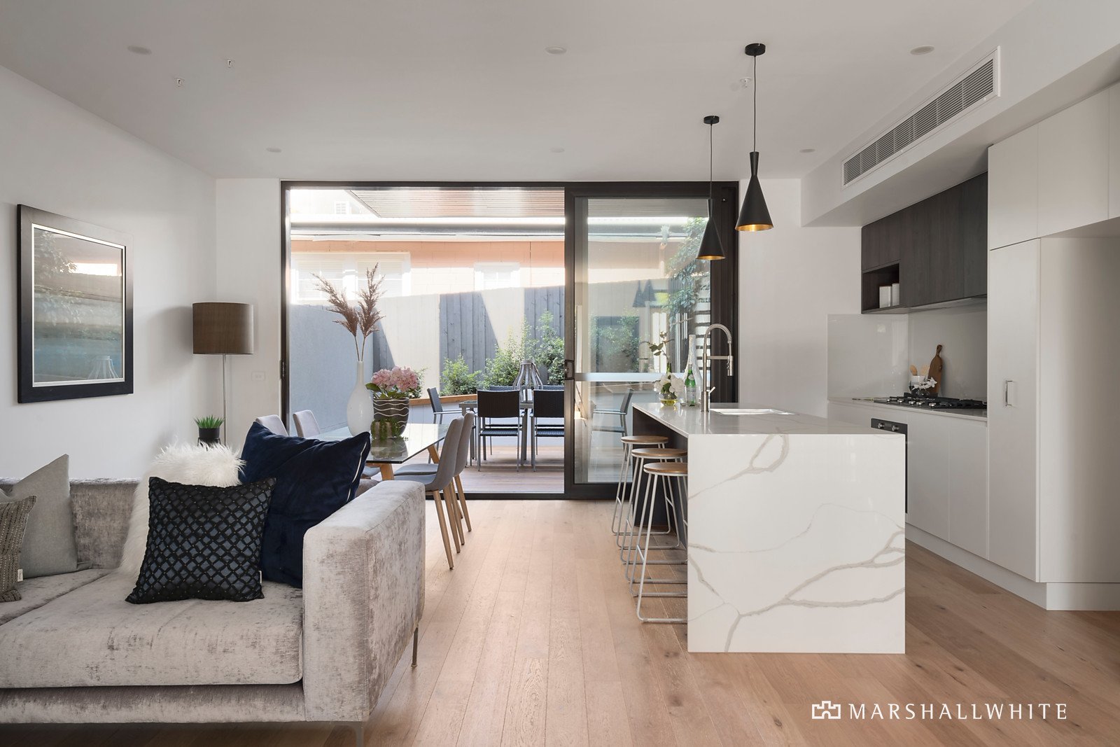 Defined by contemporary refinement, the interiors feature wide oak floors, high ceilings and expanses of floor to ceiling glass. To one side of the entrance hall, a convenient home office or 4th bedroom opens to a sunny west-facing landscaped courtyard. Spectacular in scale, the sun-drenched living and dining room with a premium kitchen boasting stone benches, Asko appliances and custom timber joinery extends out to a fabulous northeast facing private courtyard surrounded by greenery, a perfect venue for al fresco dining. On the second level accessed by lift or stairs, the generous main bedroom with lavish en suite and walk in robe is accompanied by two additional bedrooms with robes, a west-facing balcony and stylish bathroom.