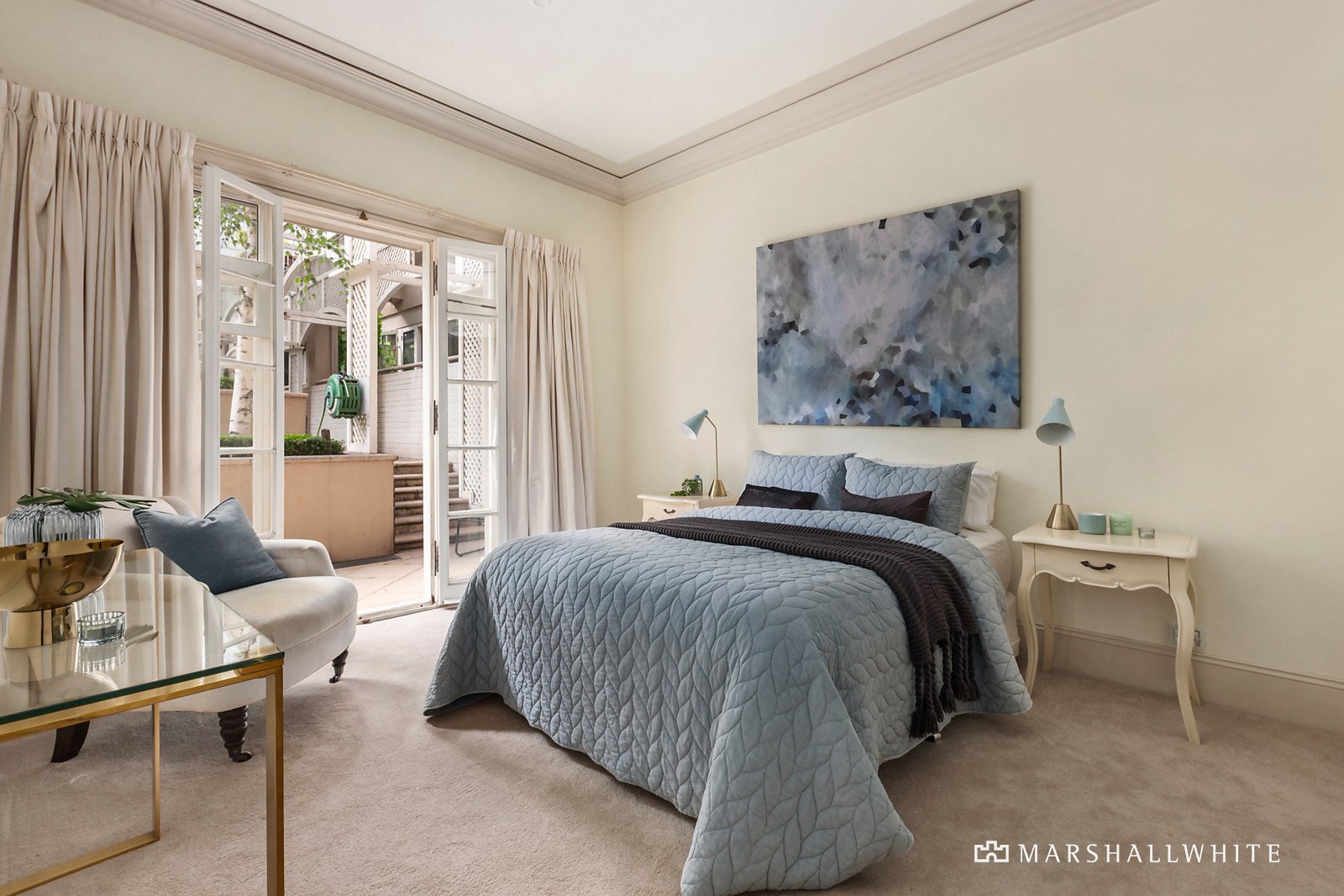 Every detail from the customized joinery to the signature French doors and traditional fixtures displays a meticulous attention to detail and superior level of quality. High ceilings accentuate the sense of space in the elegant living and dining room, home office or retreat and the separate gourmet kitchen boasting marble benches. A series of French doors open the living spaces to a private northeast terrace overlooking the beautiful and expansive common gardens. The main bedroom with a marble en suite and walk in robe, a second double bedroom with robe and a stylish marble bathroom also open to the terrace and gardens.