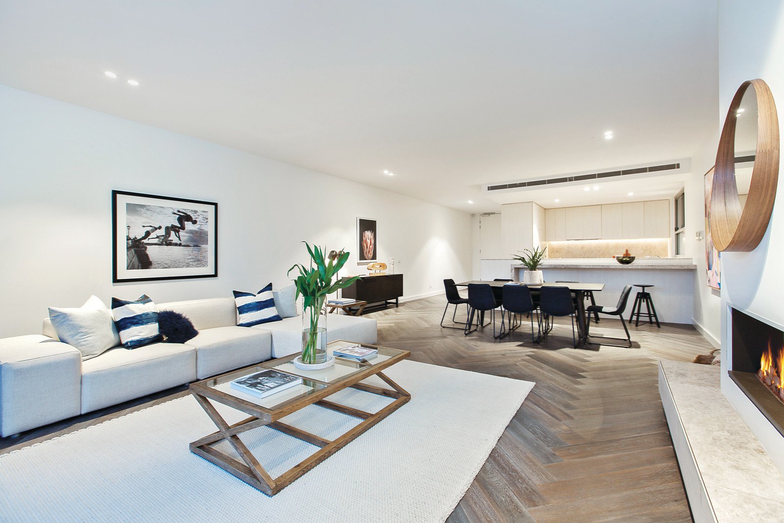 Bespoke design elements, chevron oak floors and ultra high ceilings distinguish the wide entrance hall, study or third bedroom, premium marble Miele kitchen and the generously proportioned living and dining room with a open gas log fireplace. Full width glass sliders extend the living area out to a sensational north-facing shuttered balcony or "Wintergarden". The accommodation wing comprises a lavishly scaled and appointed main bedroom with built in and walk in robes and a designer marble en-suite and a second double bedroom with built in robe and marble en-suite.