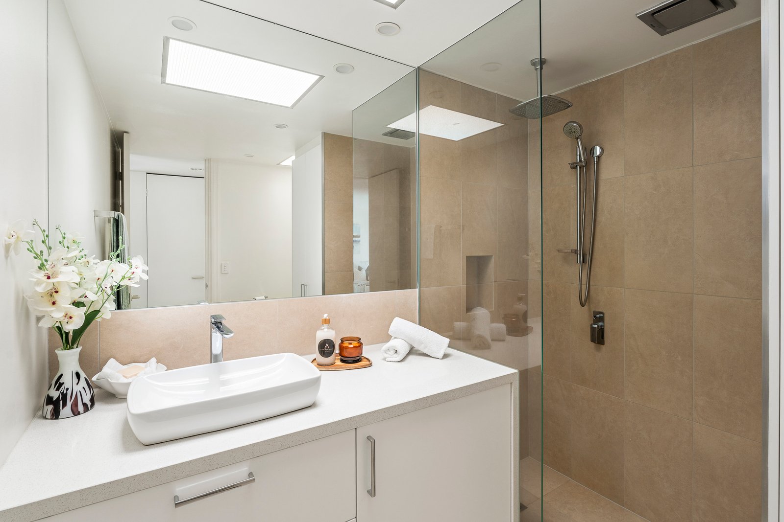 Two bright bedrooms benefit from full-wall glazing, a north-facing aspect, mirrored built-in robes and individual split-system climate control. The main bedroom opens through full sliding doors to an elevated stone-tiled terrace, one of two entirely private, north-facing alfresco spaces rarely found in apartment living. A skylit bathroom with a rain shower and quality fittings, European laundry, and a utility storage room complete the upper level with style and efficiency.