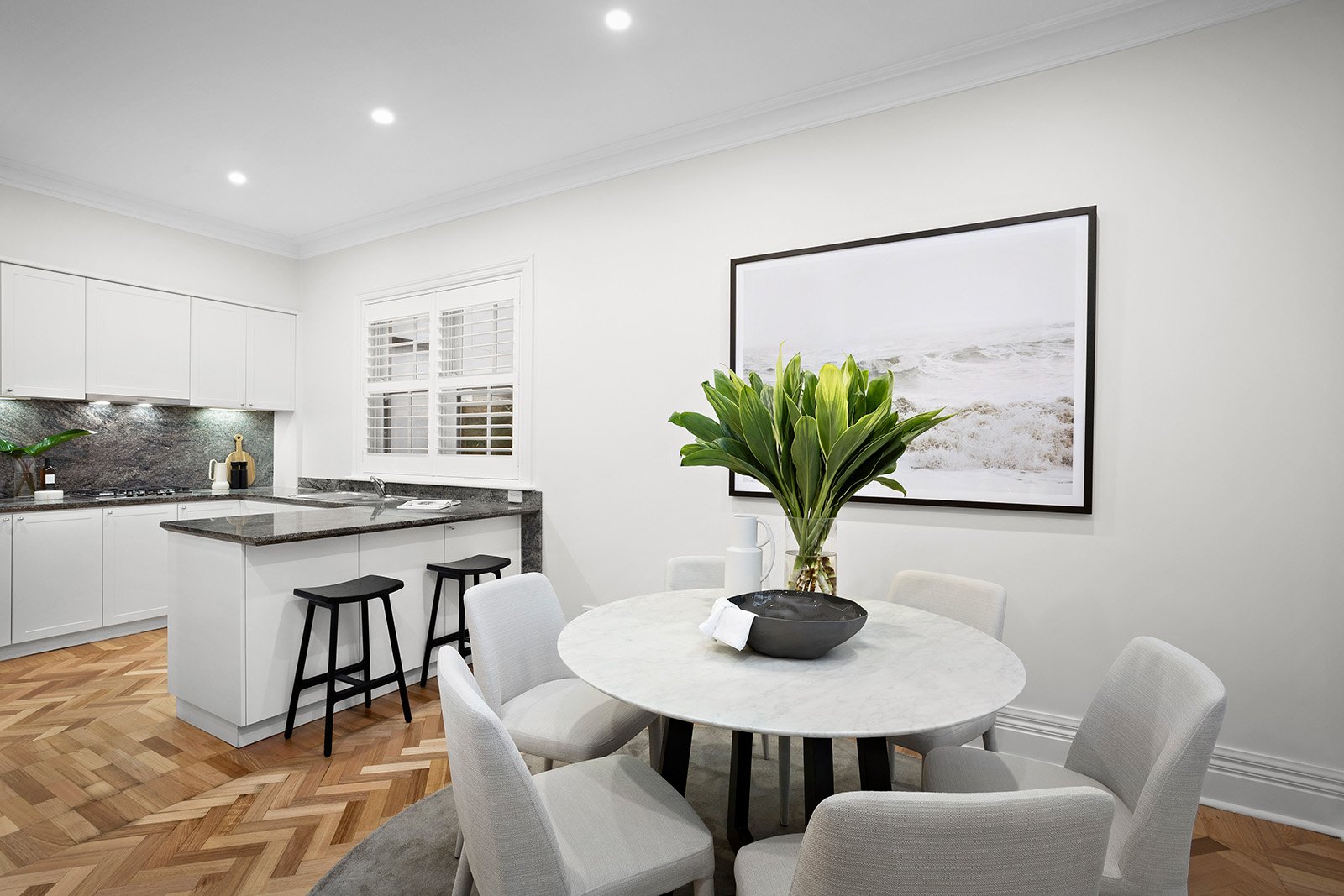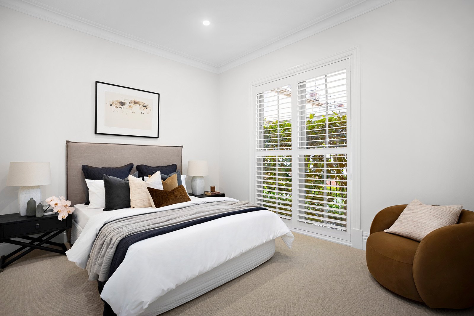 A generosity of space is accentuated inside by the high ceilings in the wide entrance hall, gourmet kitchen appointed with Bosch appliances and stone benches and the light-filled dining area featuring parquetry timber floors. Streaming with northern light, the expansive living room opens through two sets of French doors to the private north-facing leafy paved garden, the perfect venue for outdoor entertaining. Conveniently situated on the ground level, the spacious main bedroom with plantation shutters, walk in robe and lavish en suite is complemented by two additional double bedrooms and a bathroom upstairs.