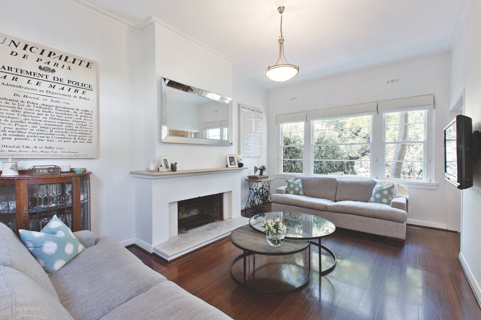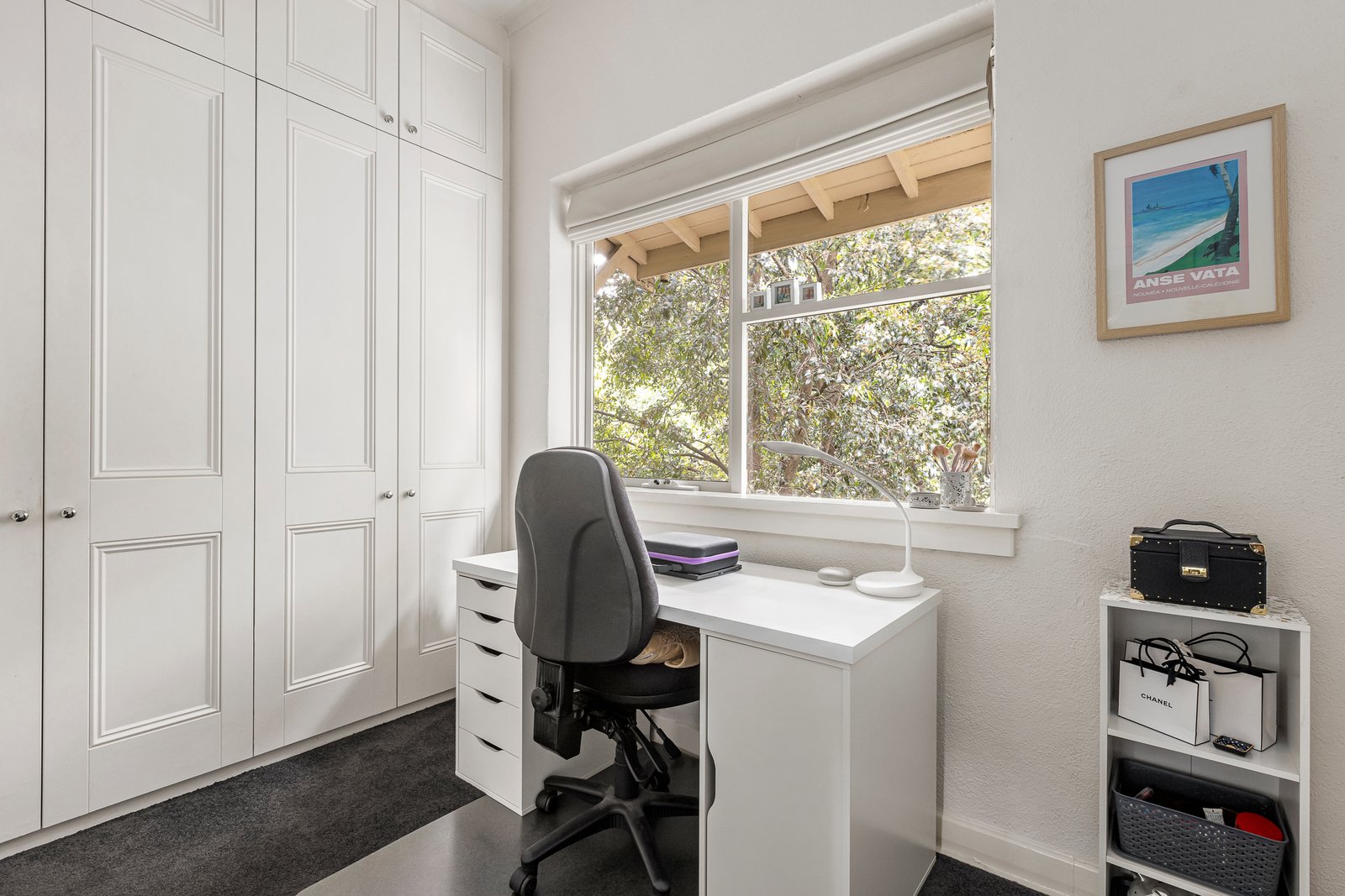 Set well back behind a leafy garden, the light-filled interior features high ceilings, dark timber floors and generous proportions through a glorious living room with open fireplace and separate dining room opening out to a private northeast deck overlooking parkland. Sleek and stylish, the gourmet kitchen is appointed with white stone benches and Bosch appliances. A downstairs bedroom is complemented by a beautifully spacious main bedroom with built in robe, a third double bedroom with adjacent study and built in robe and a chic bathroom.