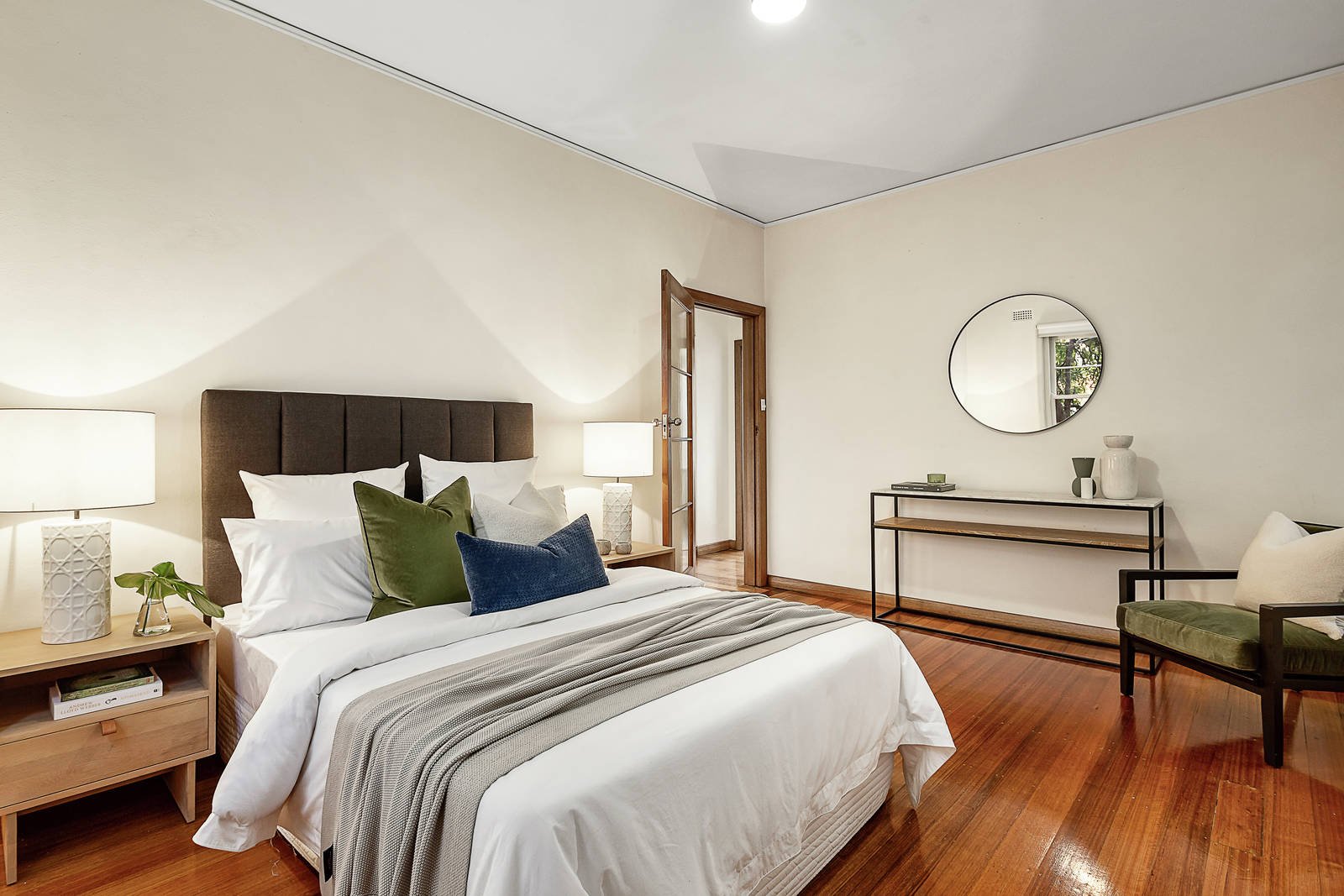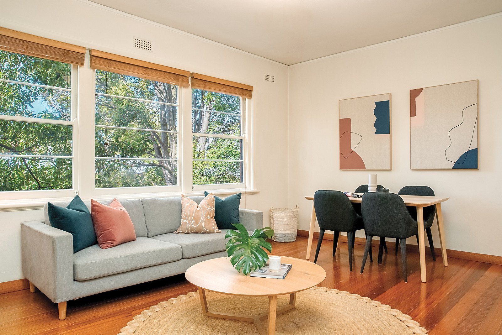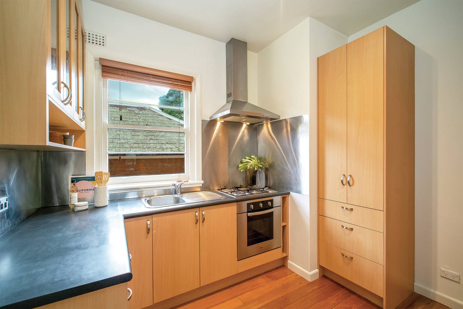 With hardwood flooring, timber skirtings and architraves to complement Deco windows and detail, the home reveals leafy tree-top vistas in all directions and a kitchen / meals that has been up-dated for durability with timber-tone cabinetry and stainless steel appliances. Meanwhile, the lounge / dining is gas-heated for ambient winter comfort, additional hallway storage is a wonderful convenience, as is a shared laundry, while a large garage with additional storage is a huge drawcard in this vibrant location.