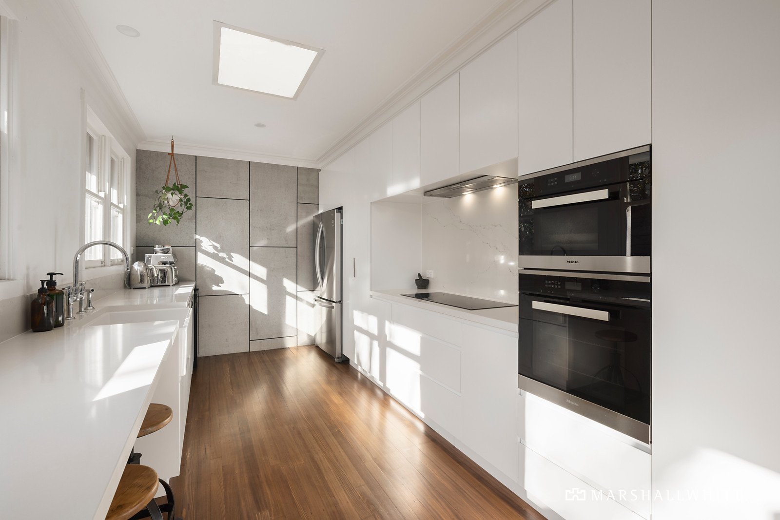 Richly stained Tasmanian Oak floors flow through the entrance hall and expansive open plan living and dining room with a Illusion gas log fire and plantation shuttered bay window. Streaming with northern light, the state of the art gourmet kitchen features white stone benches, Miele appliances and a sunny breakfast bar. French doors open the living space to a large private north-facing deck and the beautifully landscaped gardens with a tandem garage offering space for a gym. The two gorgeous double bedrooms with built in robes are accompanied by a designer bathroom with bath and separate toilet.
