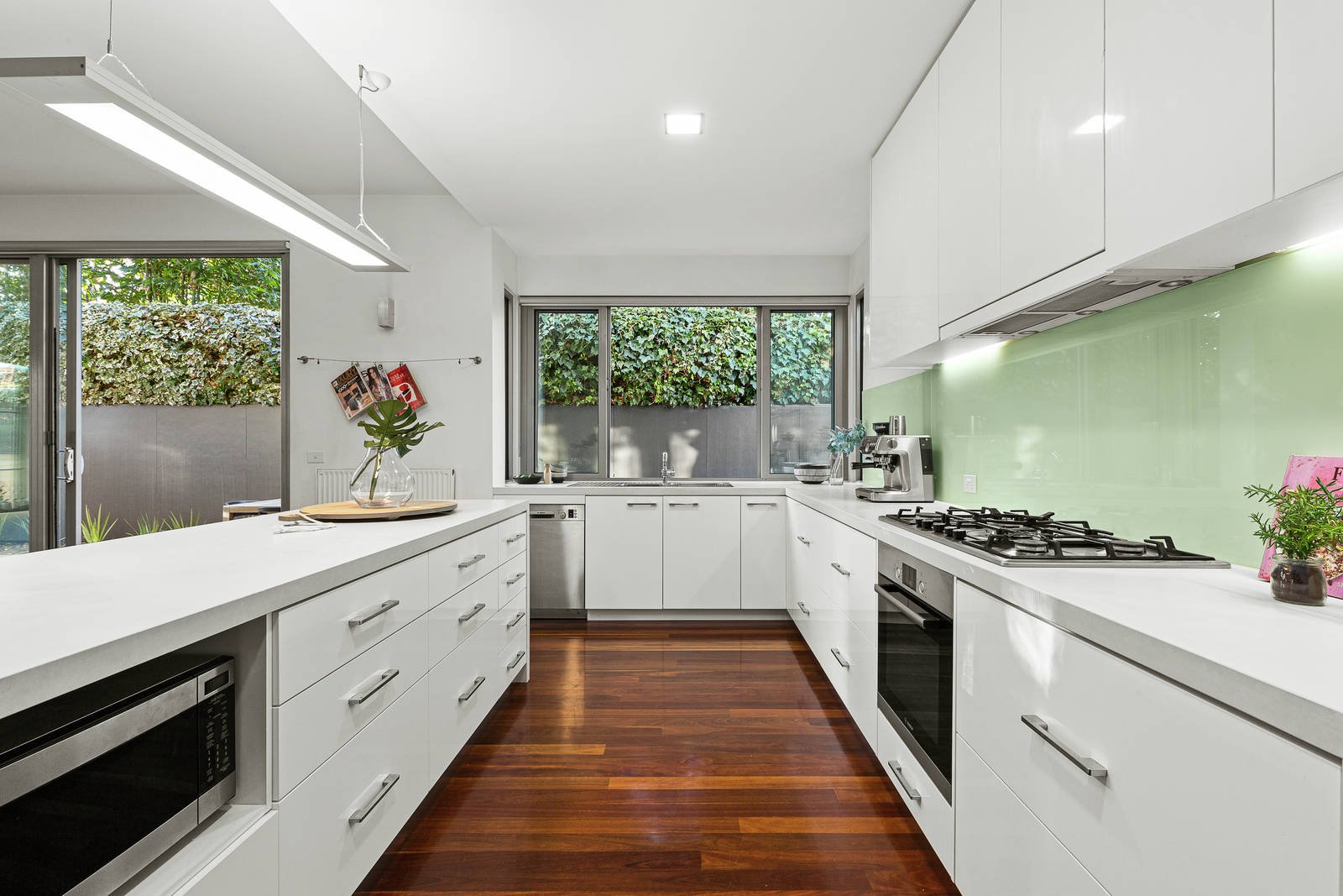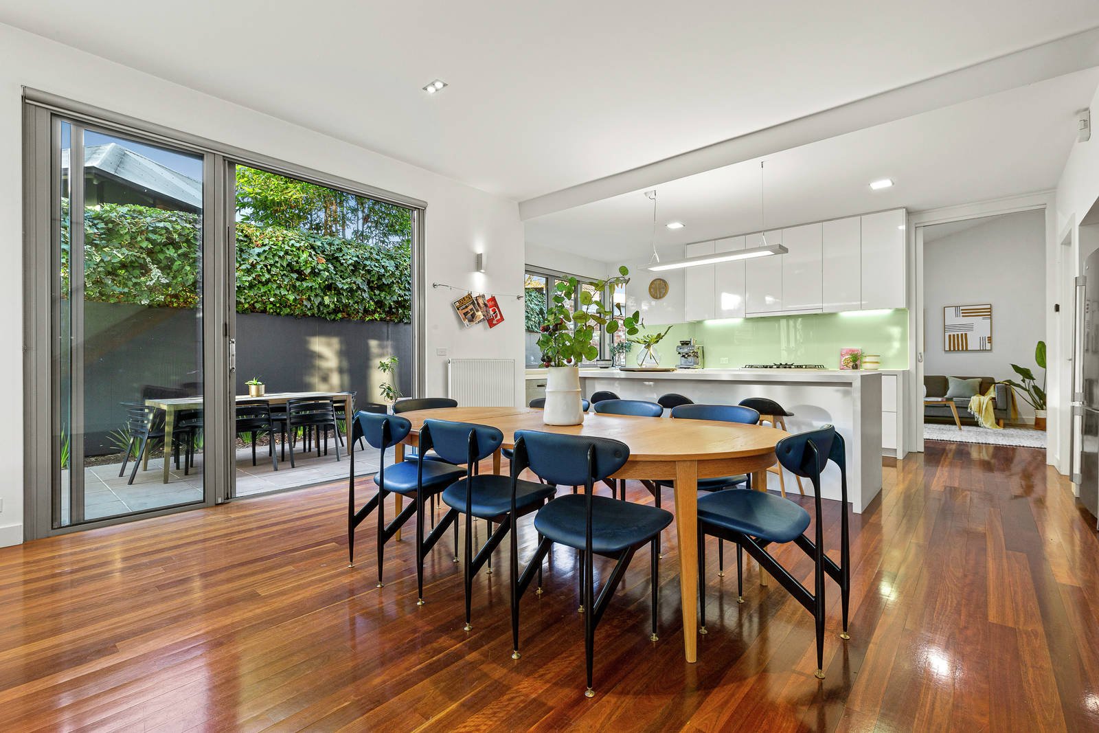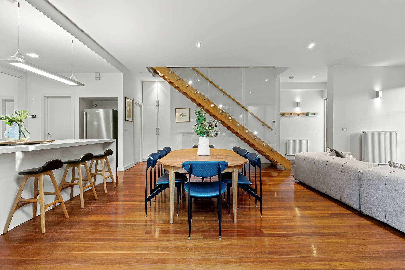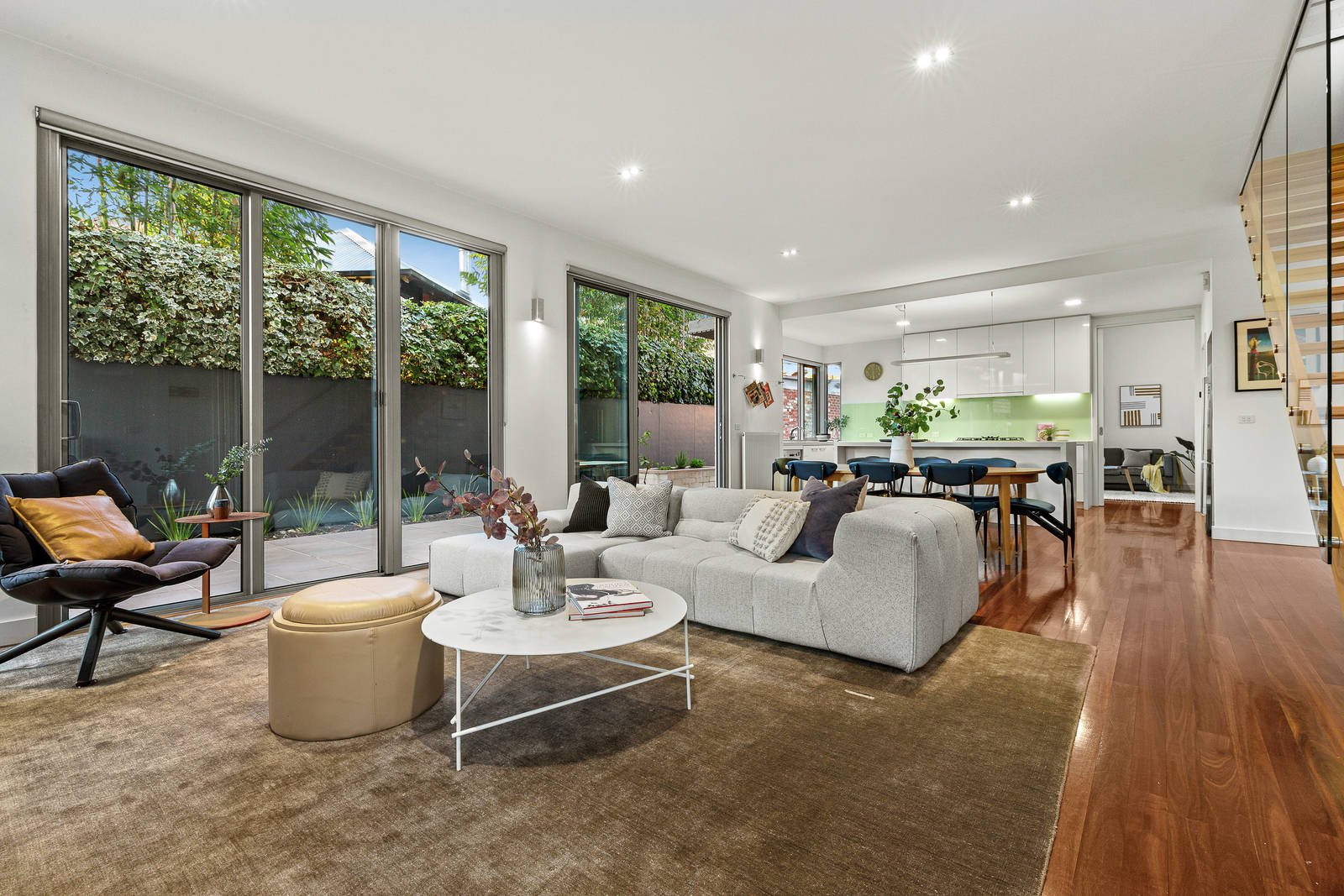 Contemporary perfection is at the heart of this exclusive home, where family-size spaciousness is light-filled and luxuriously appointed on almost 400 square metres land. Two levels of streamlined architecture deliver a large living and dining zone that opens onto a north-facing garden, a lounge/kids' retreat, four bedrooms, and a luxe kitchen with a butler's pantry. Every space reveals impeccable attention to detail, thanks to a vision for creating Elwood living at its finest near cafes, shops, the beach and St Kilda Botanical Gardens. The kitchen fitout is first-class with Stone Italiana concrete-inspired benches, a servery window opening onto the garden, Bosch appliances and plenty of storage in the butler's pantry. Bedrooms on both levels include the option of a ground-floor bedroom or study, and the main bedroom is a stylish retreat with a rainhead-shower ensuite, a long wall of custom-designed wardrobes, and raked ceilings. Love this home for its two street frontages, remote-control gates and a double garage accessed from Ruskin Street. Eco-friendly features include double-glazing, solar-boosted hot water, hydronic heating and inverter reverse-cycle air conditioners. See how the open-tread staircase merges form and function, and love having two well-appointed bathrooms plus powder room, spotted gum floors, contemporary carpet, concealed insect screens on sliding doors, Boral Evolution plywood external cladding, and a plumbed water tank. Enjoy summers in the lawned and paved garden, perfect for kids to play outdoors as well as al fresco entertaining and growing your own produce. A rare opportunity in a prized street, walk to Elwood Village and Acland Street shops, close to trams and schools.