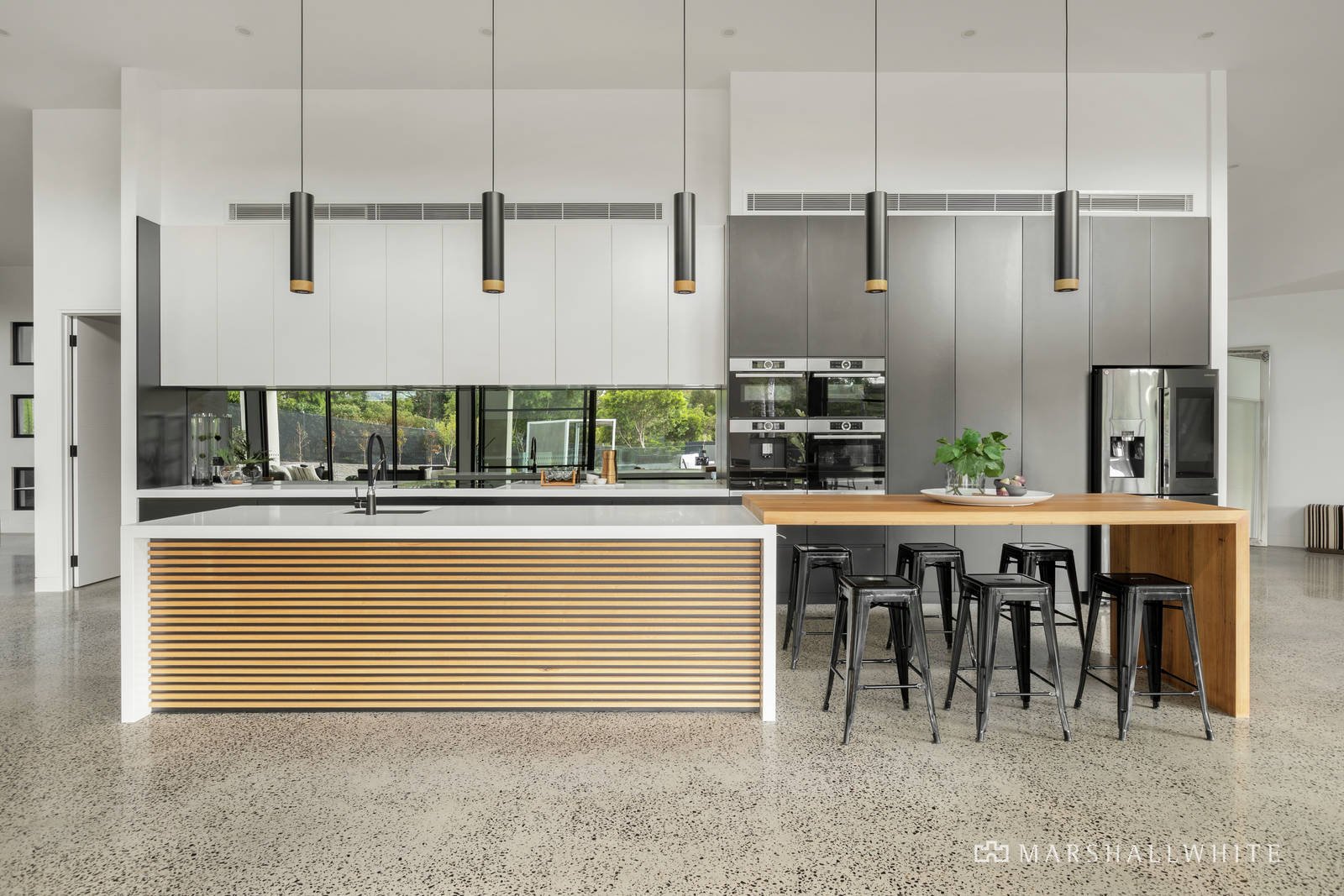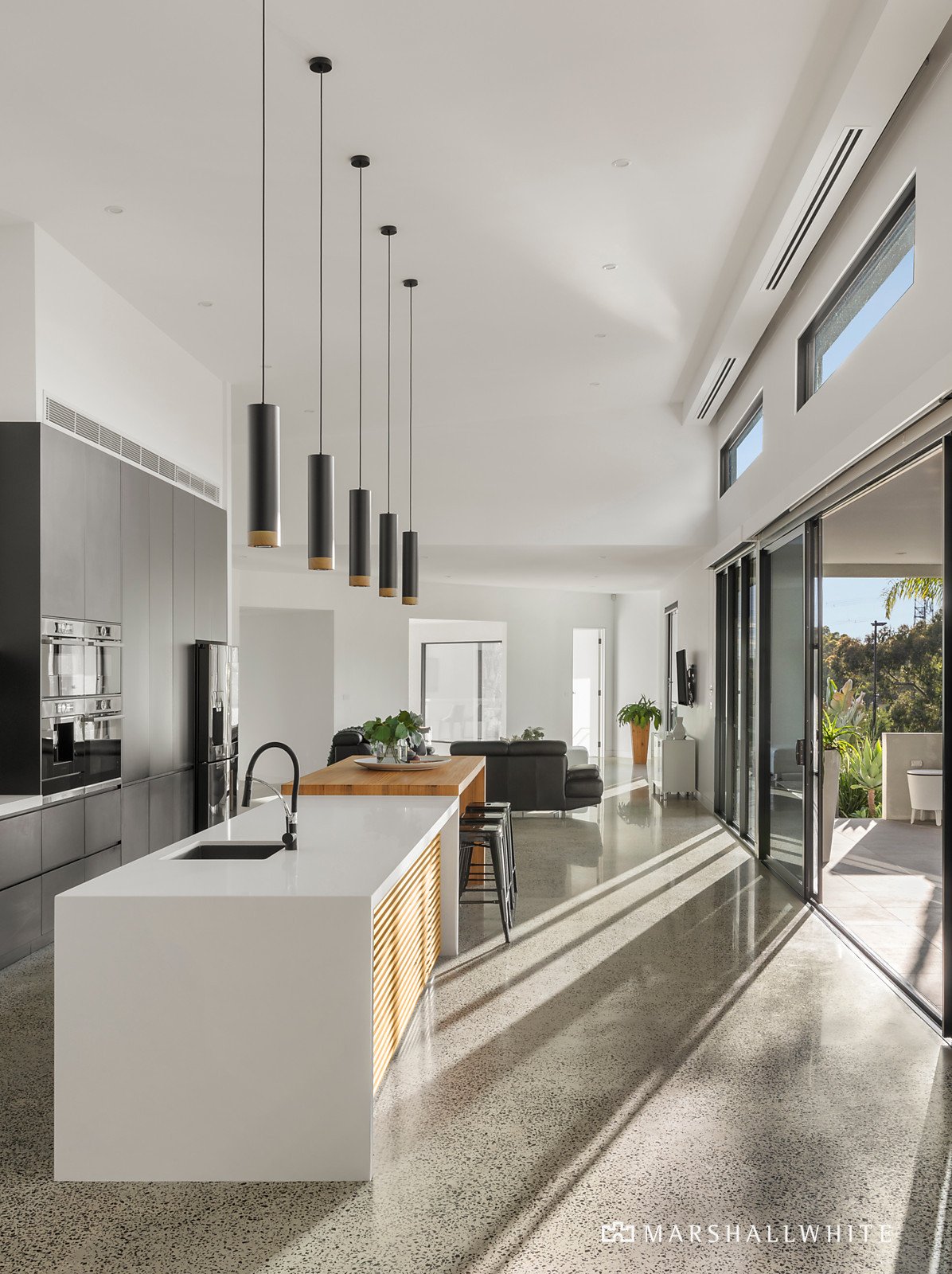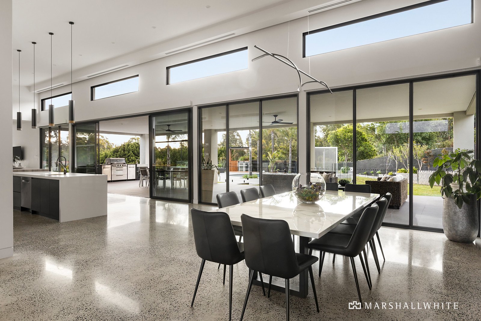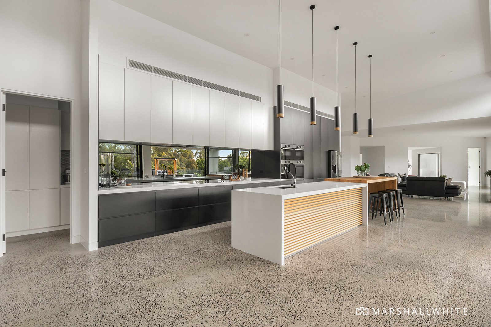 Instantly creating a theatrical sense of occasion, the home's entrance hall gives way to an extraordinary open-plan area under soaring ceilings that rise from an impressive 4.5 metres to a stunning 7 metres, and where entire walls of double-glazing create the sort of seamless indoor-outdoor connection entertainers can only dream of. Huge stone benches are complemented by a suite of Bosch appliances - comprising an induction cooktop, pyrolytic oven, microwave/oven, steamer/oven, warmer, coffee maker and two dishwashers - as well as a butler's pantry in a kitchen that is chef-standard.