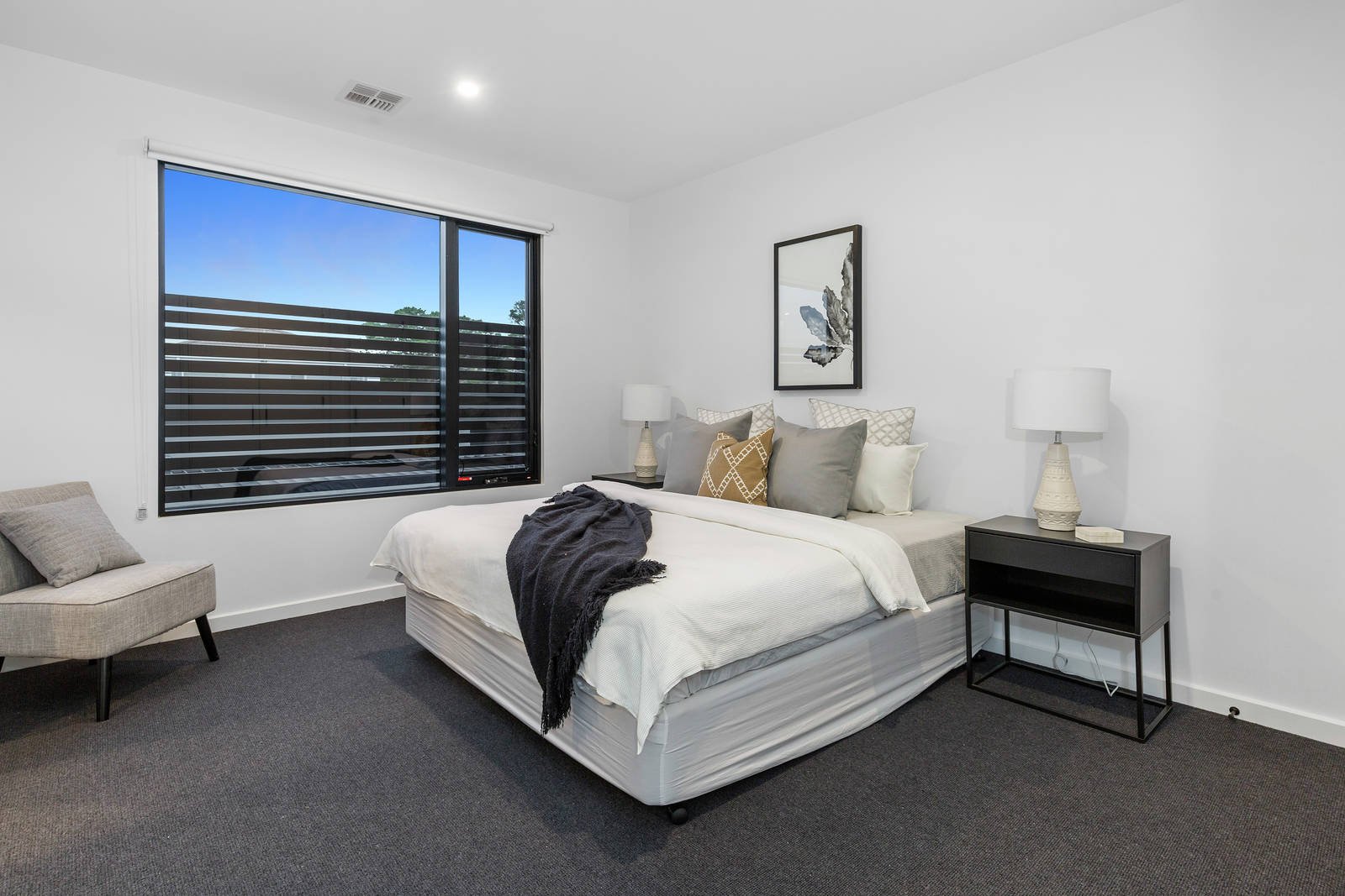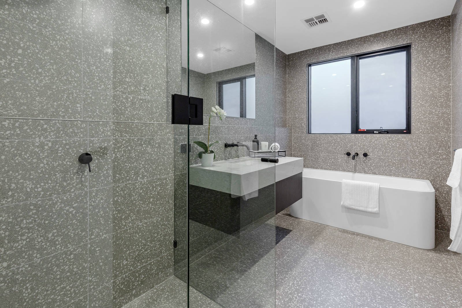 Additional luxury inclusions; two-car garage with access to laundry, double glazed windows throughout, timber flooring to all living areas & entry, soft-close drawers throughout, quality Miele appliances ( 2 ovens, induction cooktop & rangehood, integrated dishwasher, fridge & freezer), under tile heating to bathroom & ensuite, separate guest W/C downstairs, Daikin concealed reverse cycle heating/cooling throughout, Jetmaster gas fireplace and exposed aggregate driveway.