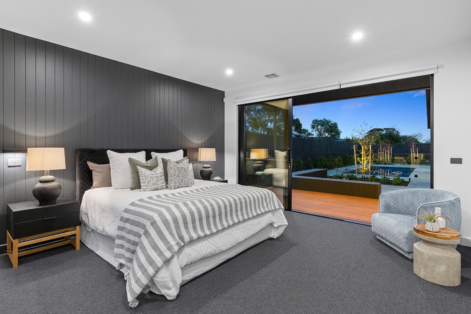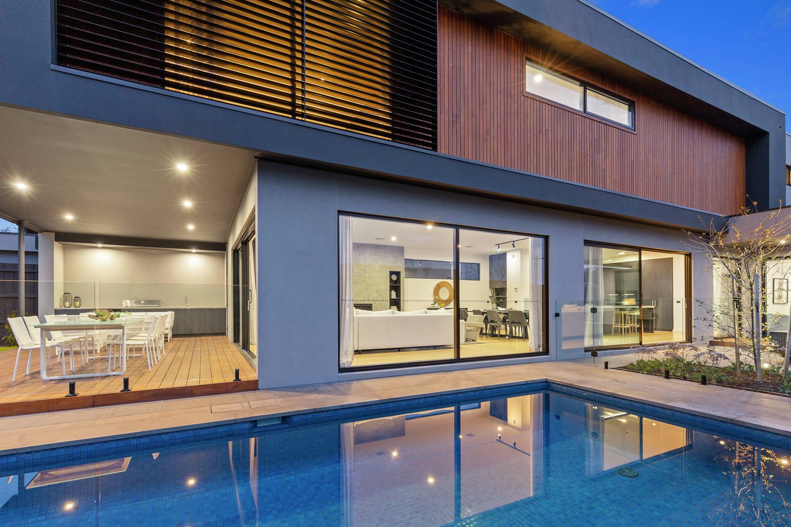 This entertainer's delight boasts multiple paved outdoor areas designed for year-round entertaining, including a sizeable covered alfresco encompassing an impressive outdoor kitchen, luxury solar heated swimming pool, modern fire pit, and low maintenance landscaped gardens. The grandeur continues up on the second level with additional accommodation, further enlightened living and working spaces, and magnificent bay views.
