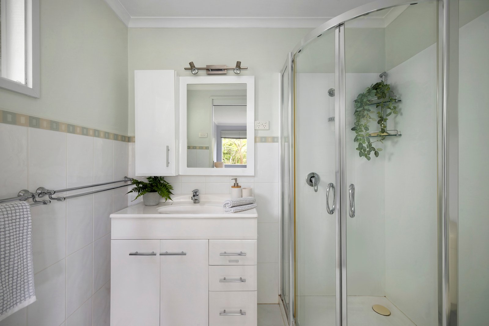 The upper level has an external staircase to an impressive wide board deck that wraps around to a secluded alfresco area near the outdoor spa. Bathed in warming sunshine, the main floor enjoys a relaxed open plan living and dining area with limed floorboards, a bright white kitchen featuring an atrium style window, 4 spacious bedrooms including the main with fitted robes and modern ensuite, a classic bathroom and large laundry. The lower level is a configuration of 2 generous rooms – one being used as a bedroom with an additional bed platform, the other more open plan with the option to create an additional sleeping area behind some robes plus a casual living space. There’s an external bathroom that services this lower level and acts as an after beach bathroom to wash off the sand.