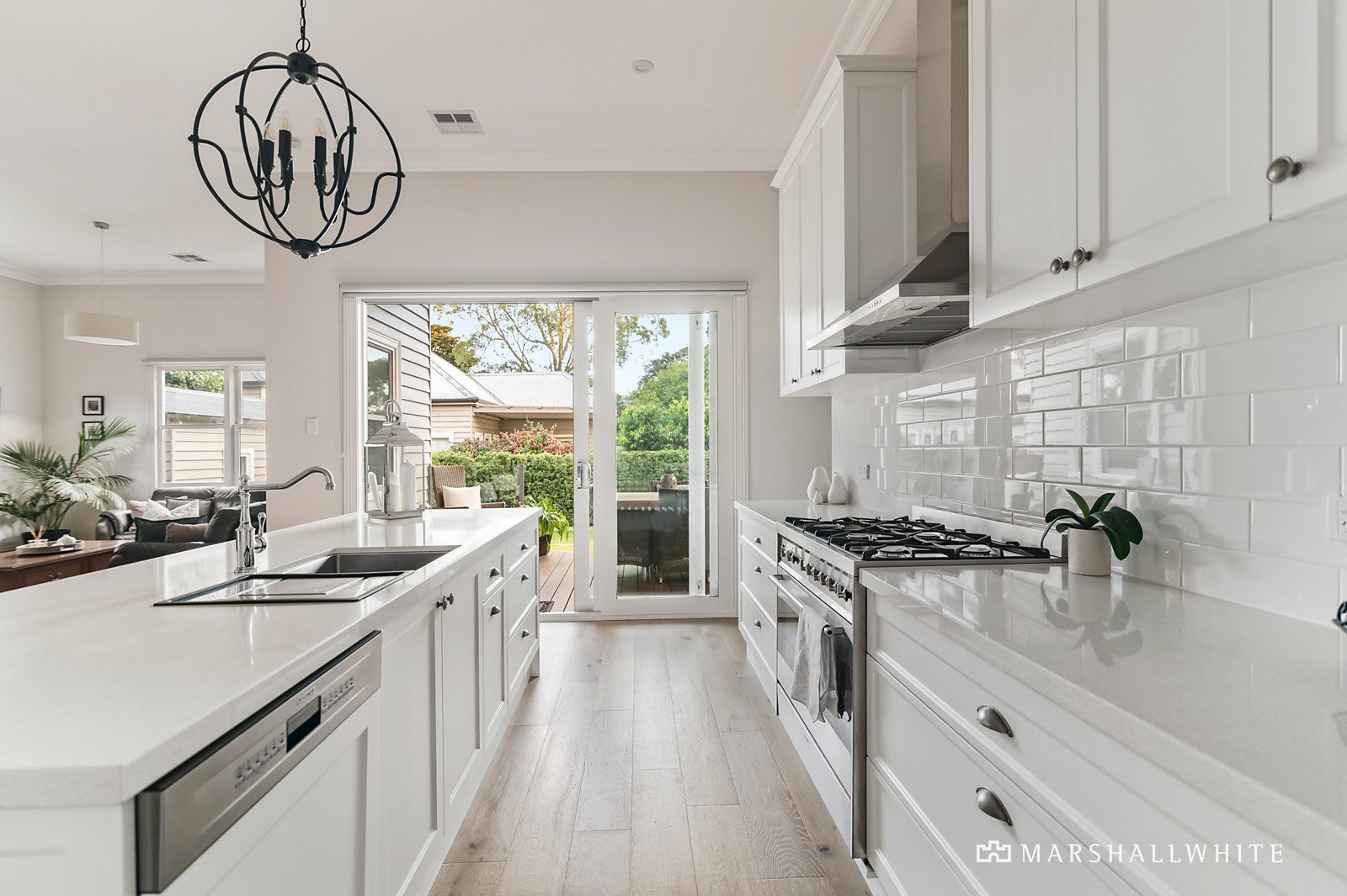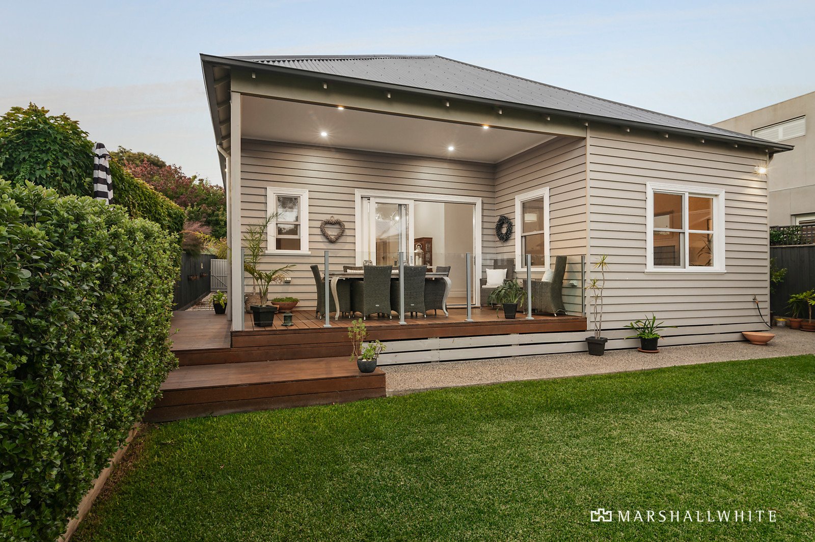 Behind the appealing exterior profile, washed French oak floors flow through the wide central hall to a gracious sitting room with open fire, the beautiful main bedroom with designer en suite and walk in robe, three additional bedrooms with robes, a home office or 5th bedroom and stylish bathroom with clawfoot bath. The oak floors and high ceilings continue through the expansive light-filled open plan living and dining room with a sublime gourmet kitchen boasting stone benches, 90cm Smeg oven and a butler's pantry. Stacking glass sliders open the living to a large undercover deck and the picturesque private landscaped garden with a versatile studio/gym or workshop.