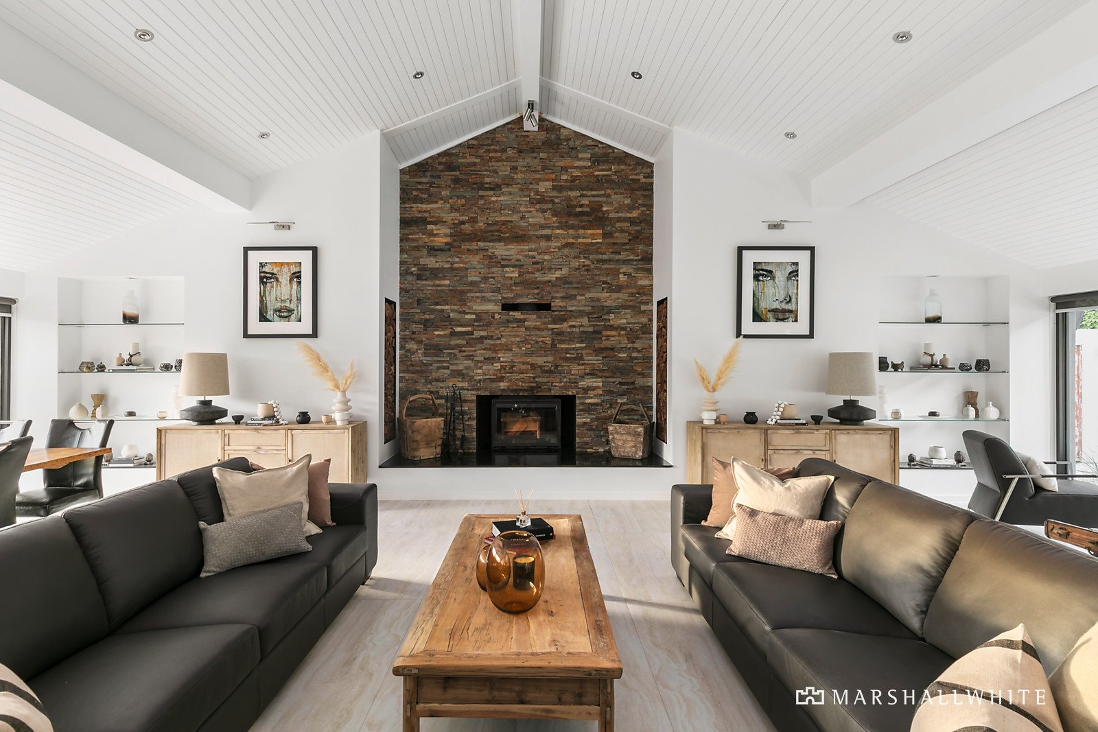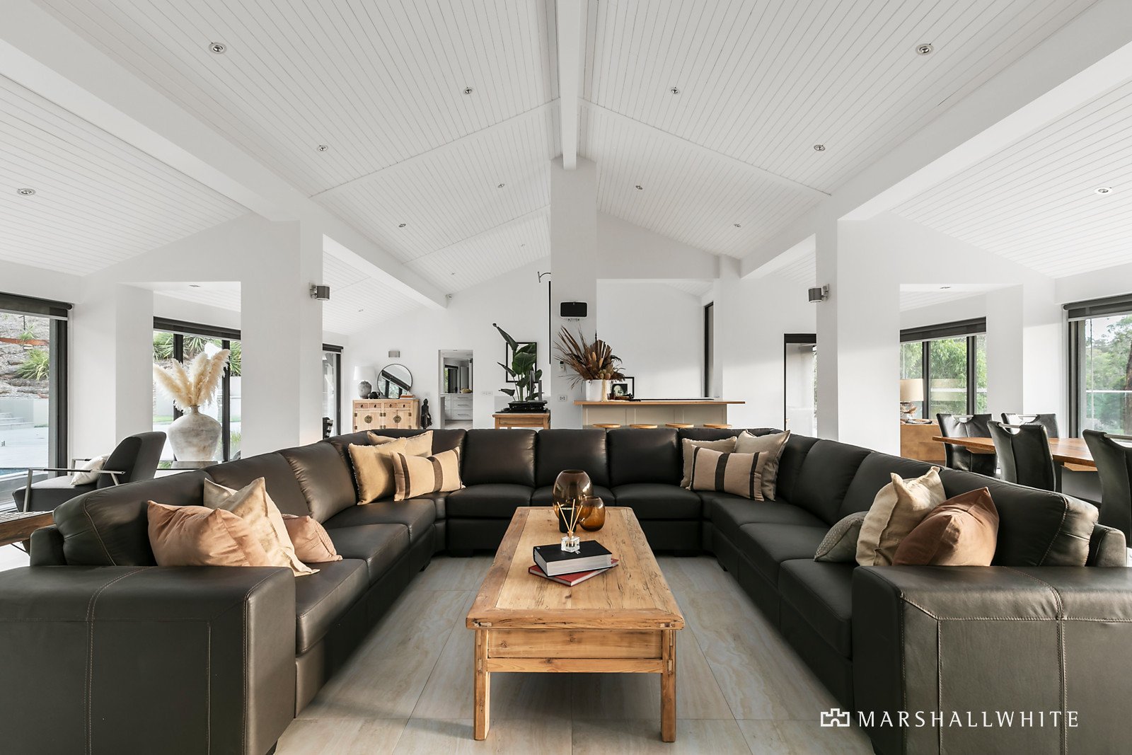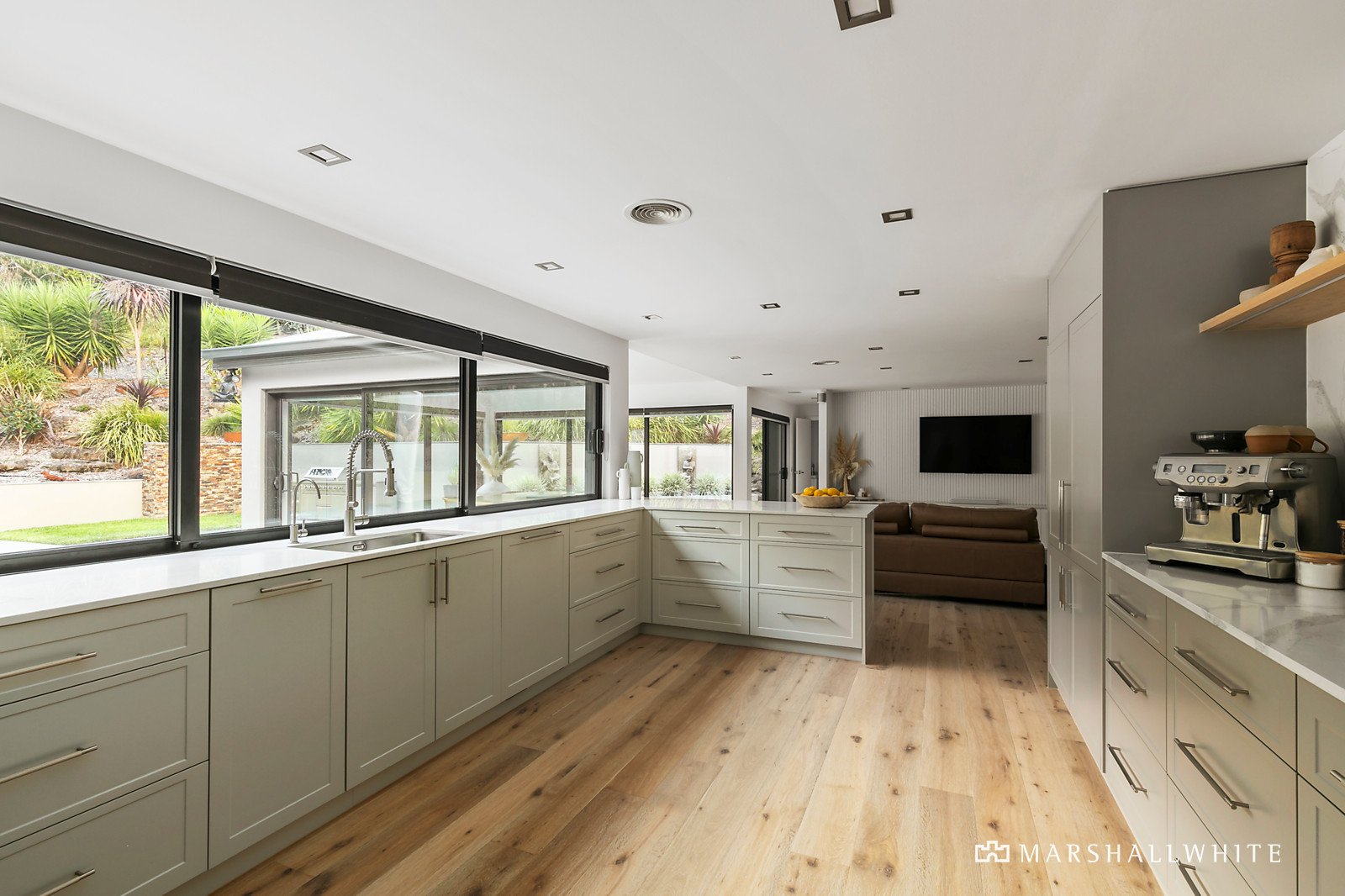 With an almost-theatrical sense of occasion, the home flows to vast living spaces, in which entire walls of windows create an extraordinary connection to both the bluestone-paved surrounds of the swimming pool and to a fully landscaped garden of indigenous and native flora. The kitchen is flawlessly appointed with stone benches, a comprehensive suite of stainless-steel appliances, a fully-integrated Liebherr refrigerator and volumes of Blum soft-close cabinetry, whilst sliding cafe-style windows and doors open to create effortless flow from family meals and living to outdoor entertaining.