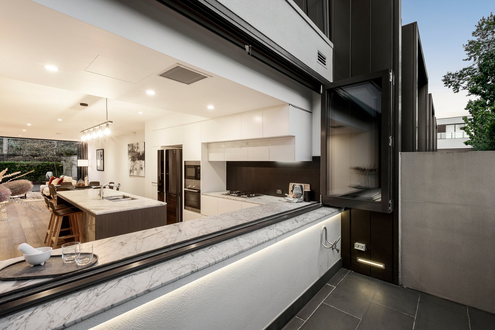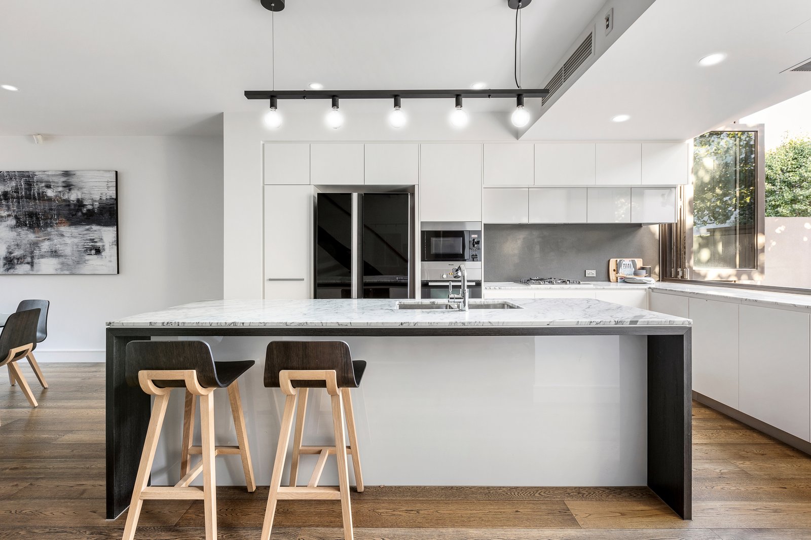 A sun-drenched domain for seamless indoor-outdoor living and entertaining, the exceptionally generous open plan living and dining room features a built in bar, oak floors, high ceilings and a sublime gourmet kitchen appointed with marble benches, Miele appliances and bi-fold servery windows. A set of bi-fold doors opens the living completely to a captivating private north-facing decked courtyard planted with lush greenery. The beautiful main bedroom suite with walk-in robe, lavish en suite and huge north-facing terrace enjoys the serenity of its own level, while on the floor below there is a second bedroom with designer en suite and walk-in robe, two additional robed bedrooms, two balconies and a stylish bathroom. The basement level comprises a spacious retreat/media room with powder-room, storeroom and double garage.