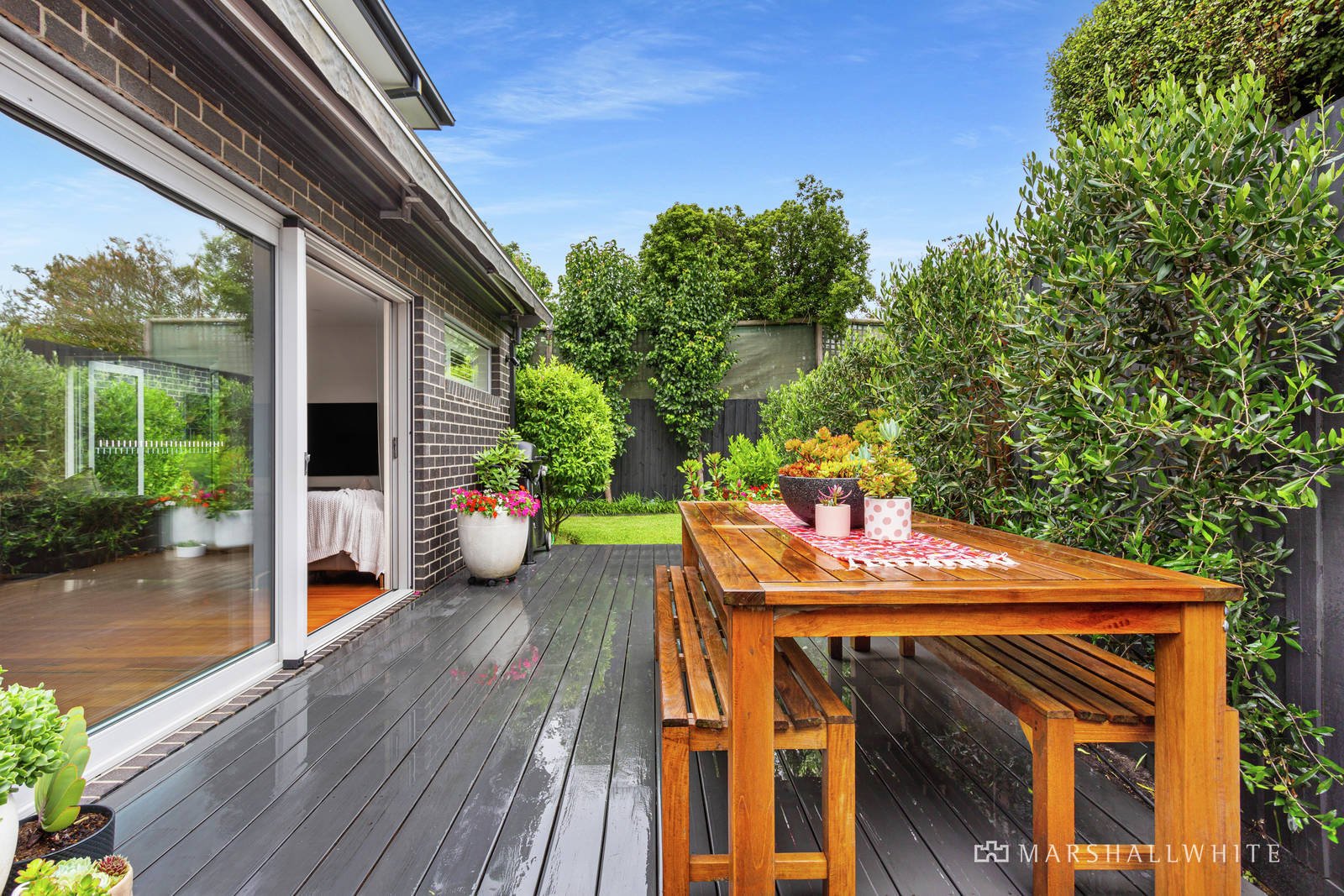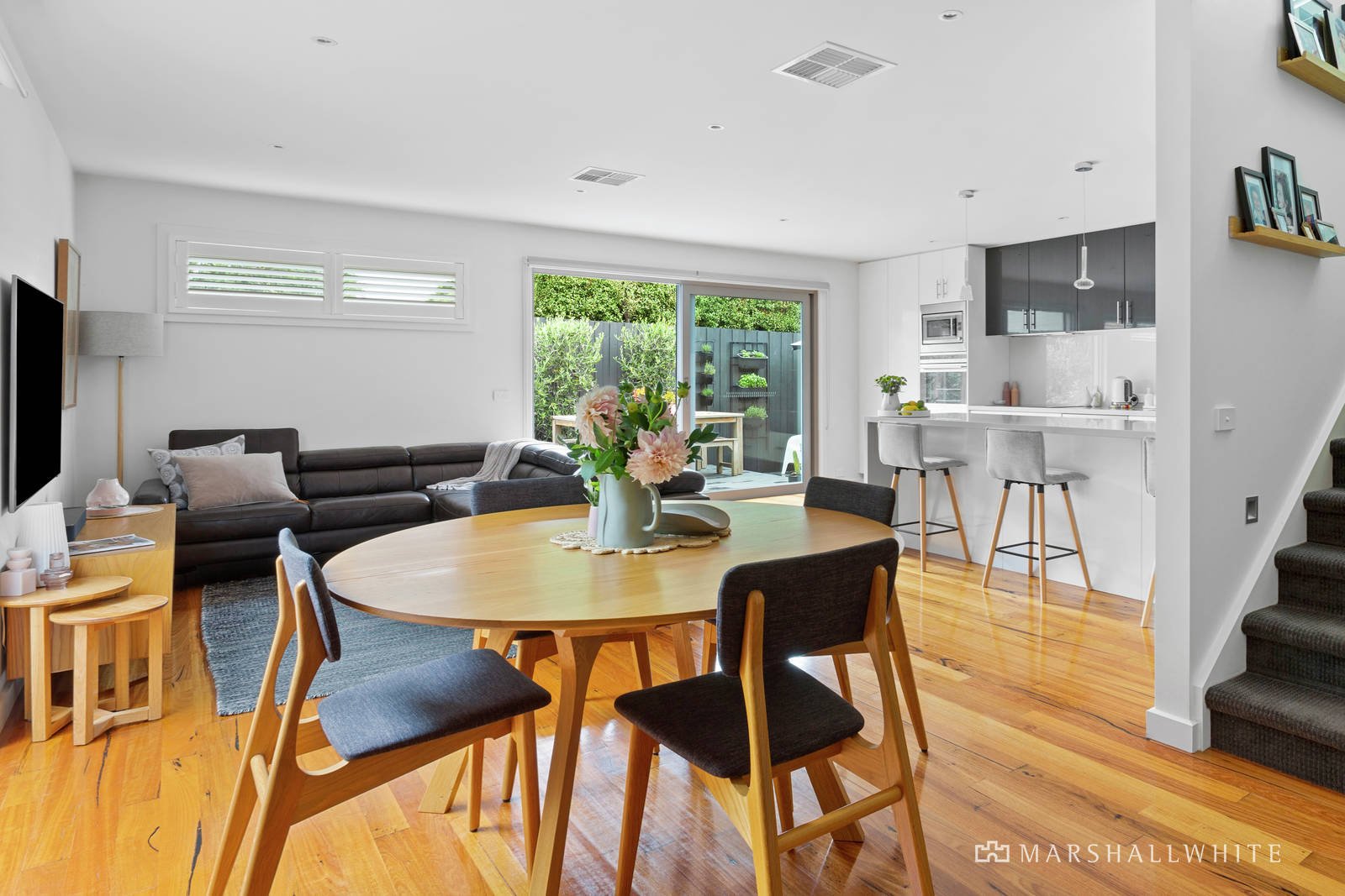Luxury finishes with a focus on privacy and easy living, this home includes polished timber floors throughout, complemented with quality carpet in the bedrooms and ceramic tiles to all wet areas. Double glazed windows complete with plantation shutters feature in the home office and bedrooms. This well-appointed home will delight from the moment you enter, the front door opens to the home office with it's natural warm finishes. The open plan design hosts a dining and living space with large French and sliding doors that lead to the private and peaceful well-maintained North facing garden and outdoor entertaining area complete with rollout electric awning.
