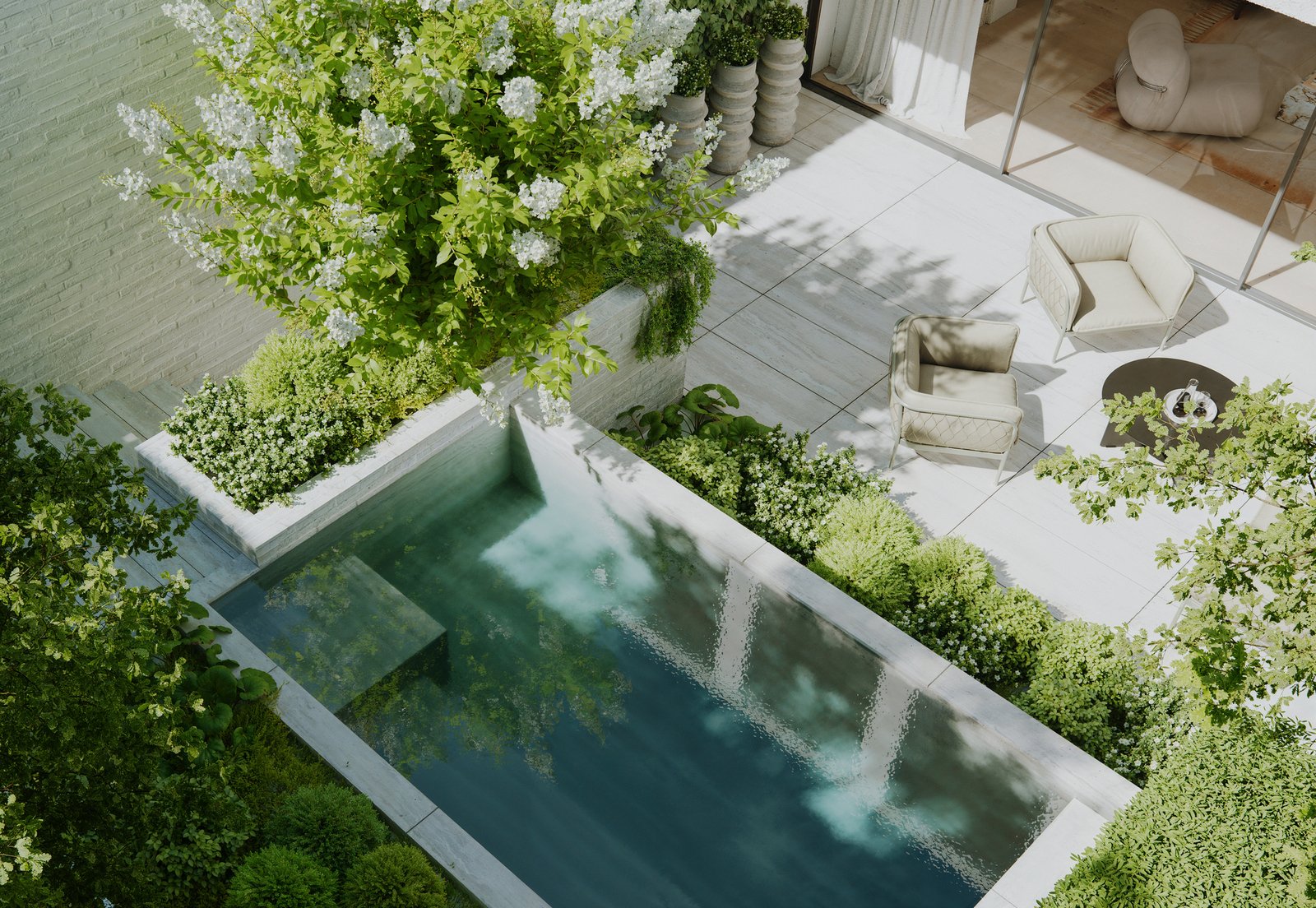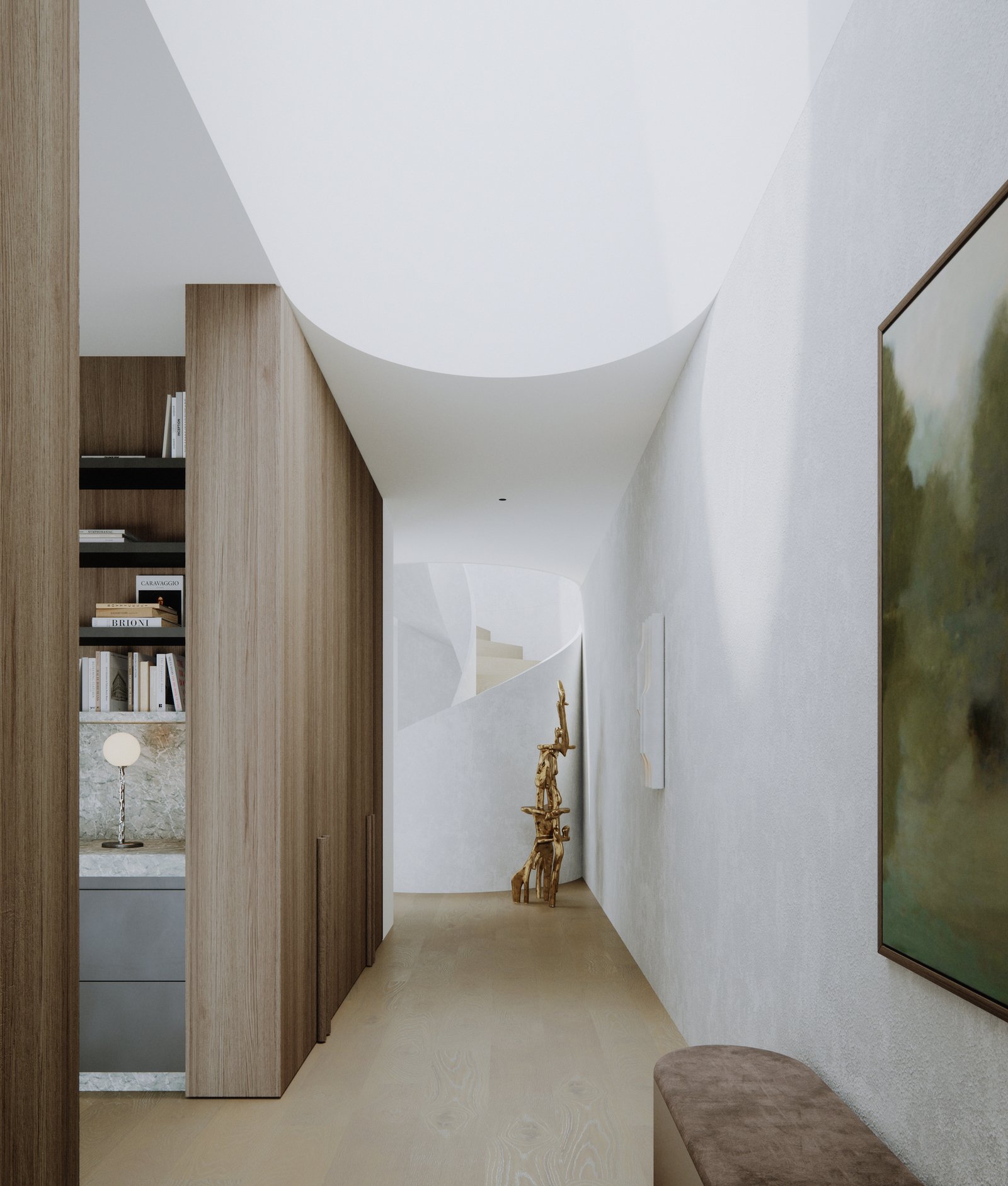 On entry, a soaring double-height void with a skylight fills a private home office with natural light. A wide hallway leads past the curved feature staircase and powder room to the private lift, before opening to an expansive living and dining domain. Here, seamless indoor-outdoor integration creates the perfect entertaining environment, complete with a built-in BBQ kitchen, lush Nathan Burkett–designed gardens and the option of a stunning tiled pool.