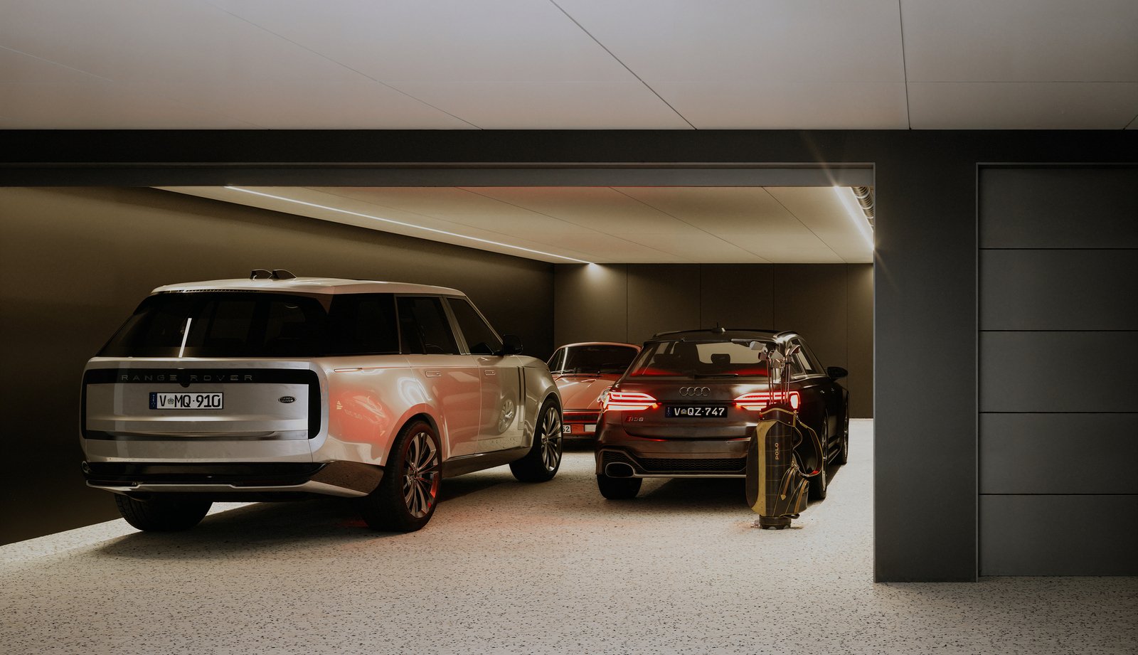Secure basement garaging accommodates four cars behind an automated door, with EV charging provision.