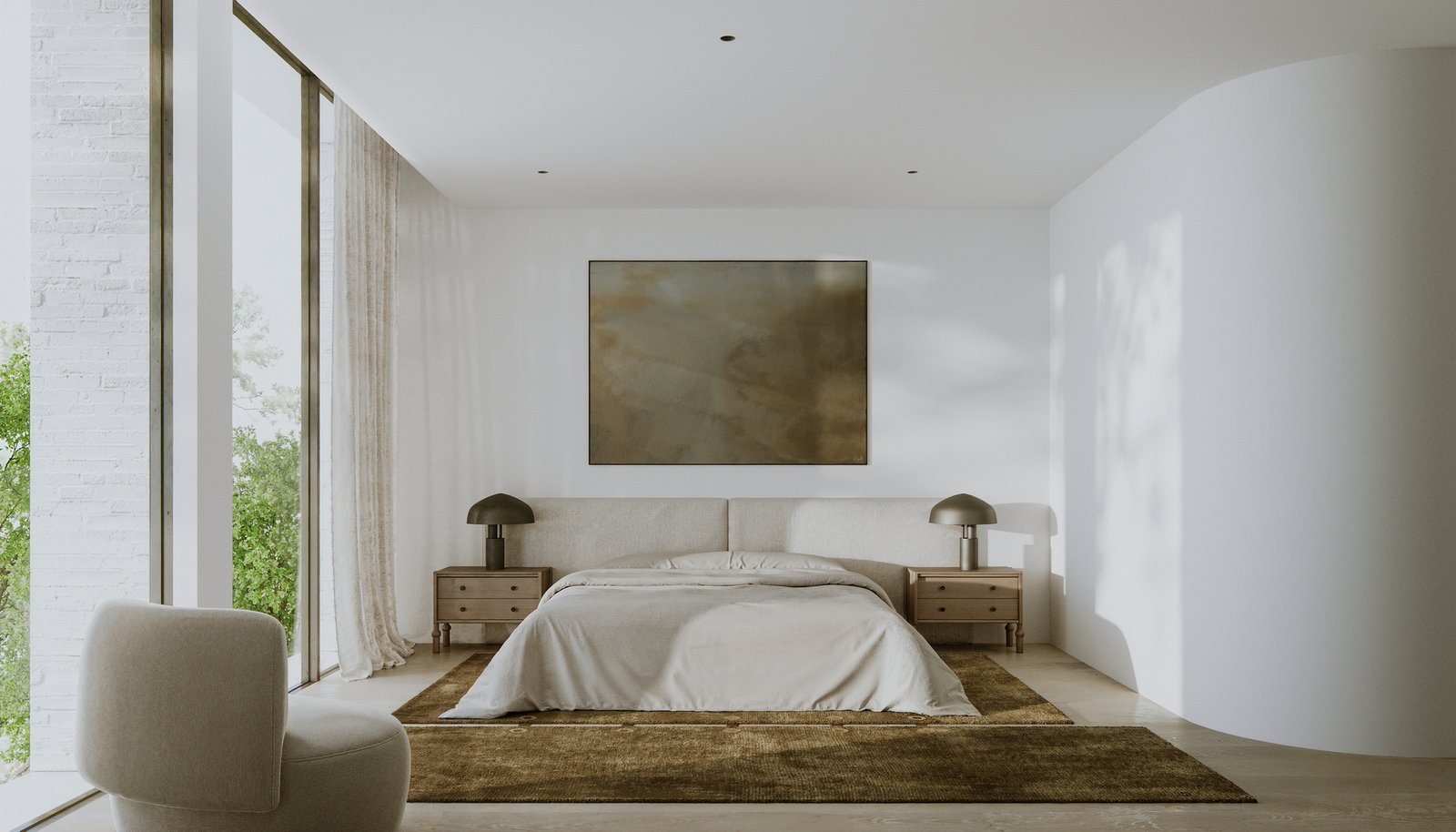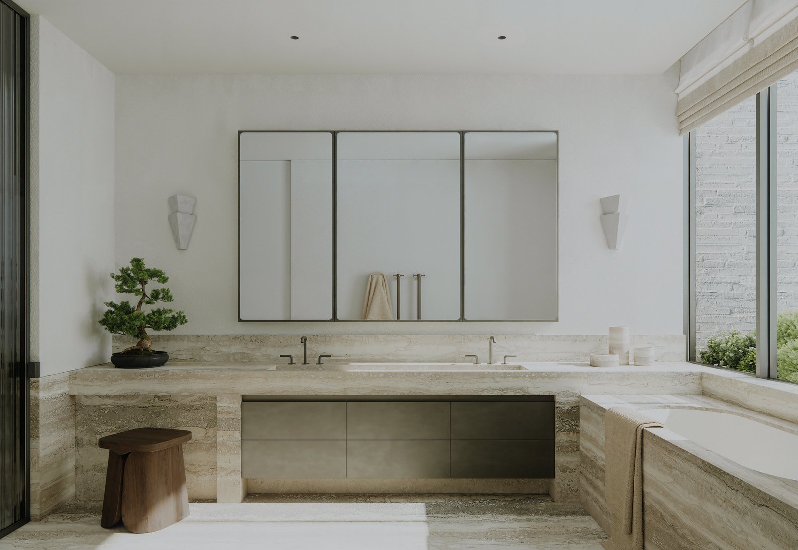 The interior palette is warm and layered, blending bagged brick, antique satin brass, European Oak, stone and travertine. Full-height doors and a central light court introduce light and scale, while solid columns and finely crafted thresholds provide subtle delineation without interrupting flow.
