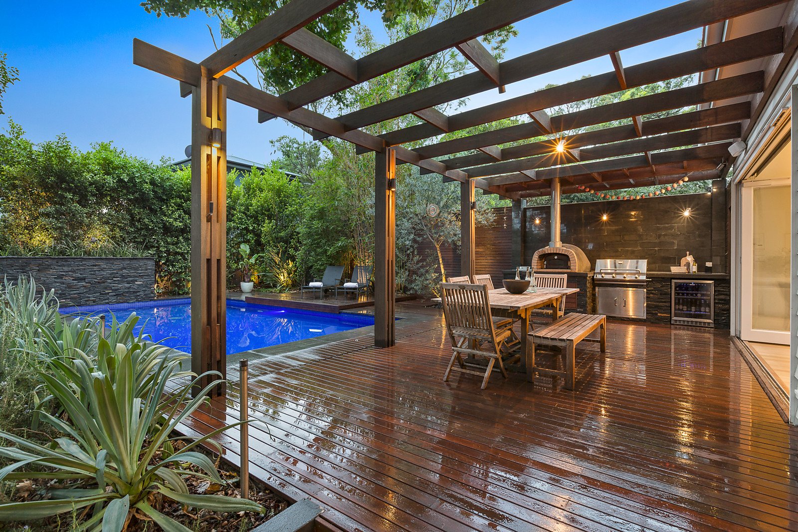 Framed by a beautiful garden, the wide entrance hall featuring timber floors introduces an inviting sitting room, four double bedrooms, including generous main bedroom with walk in robe, chic en suite, and stylish bathroom. The open plan living and dining room with built in bar is served by a stunning gourmet kitchen appointed with stone benches, Zug appliances, hot/cold/sparkling water tap and an integrated Liebherr fridge/freezer. Bi-fold doors extend the living out to a large entertaining deck with full BBQ kitchen including gas hob and pizza oven, picturesque heated pool and the deep private garden shaded by a magnificent oak tree.