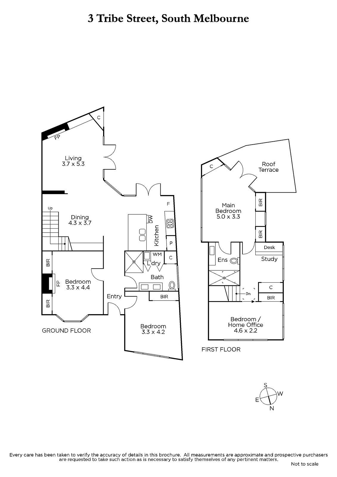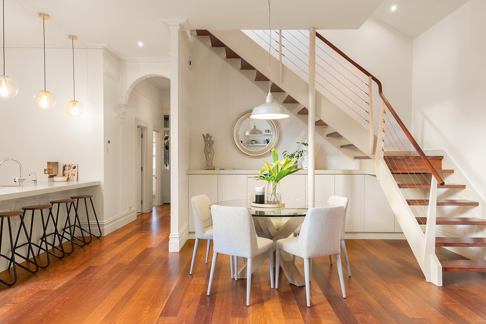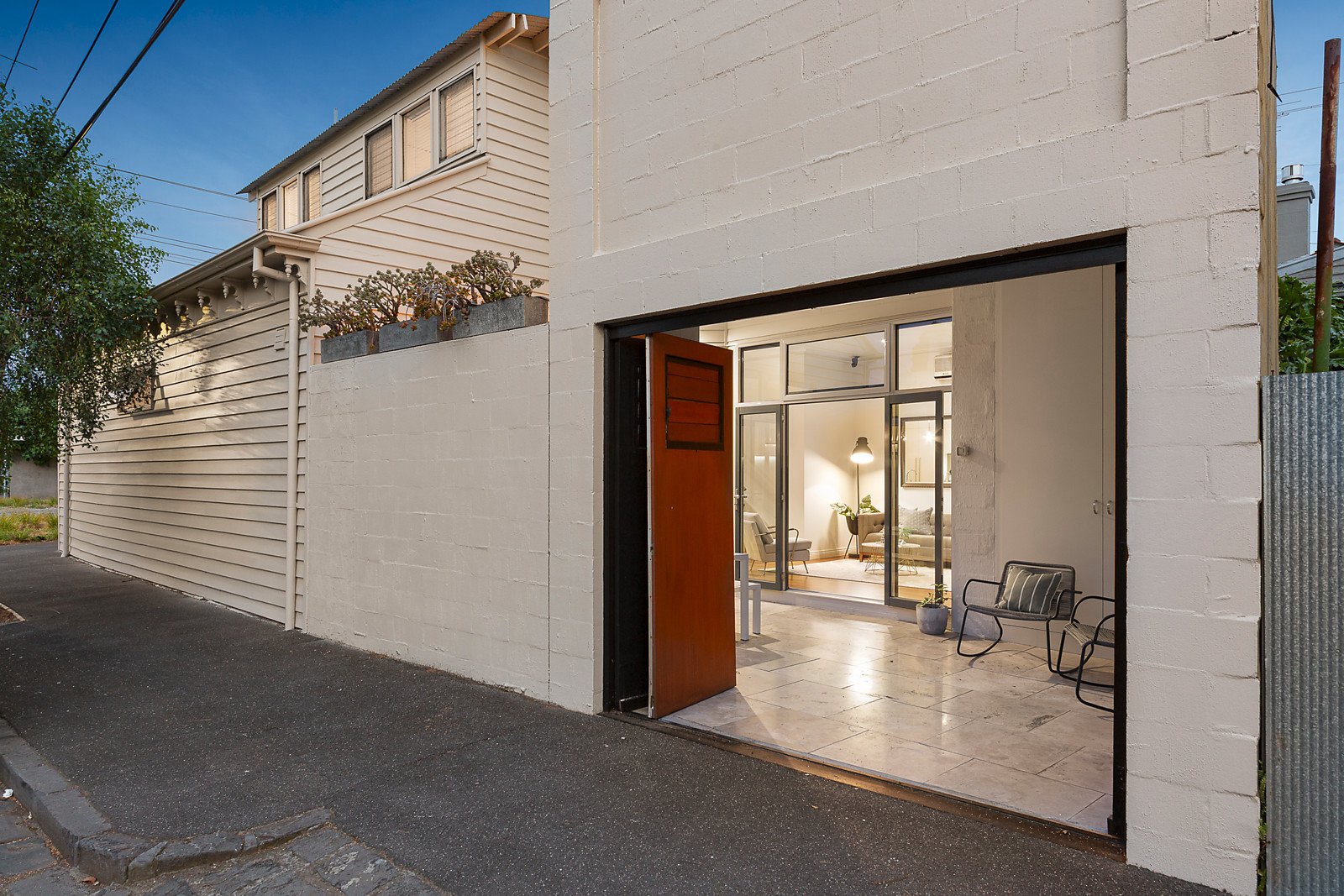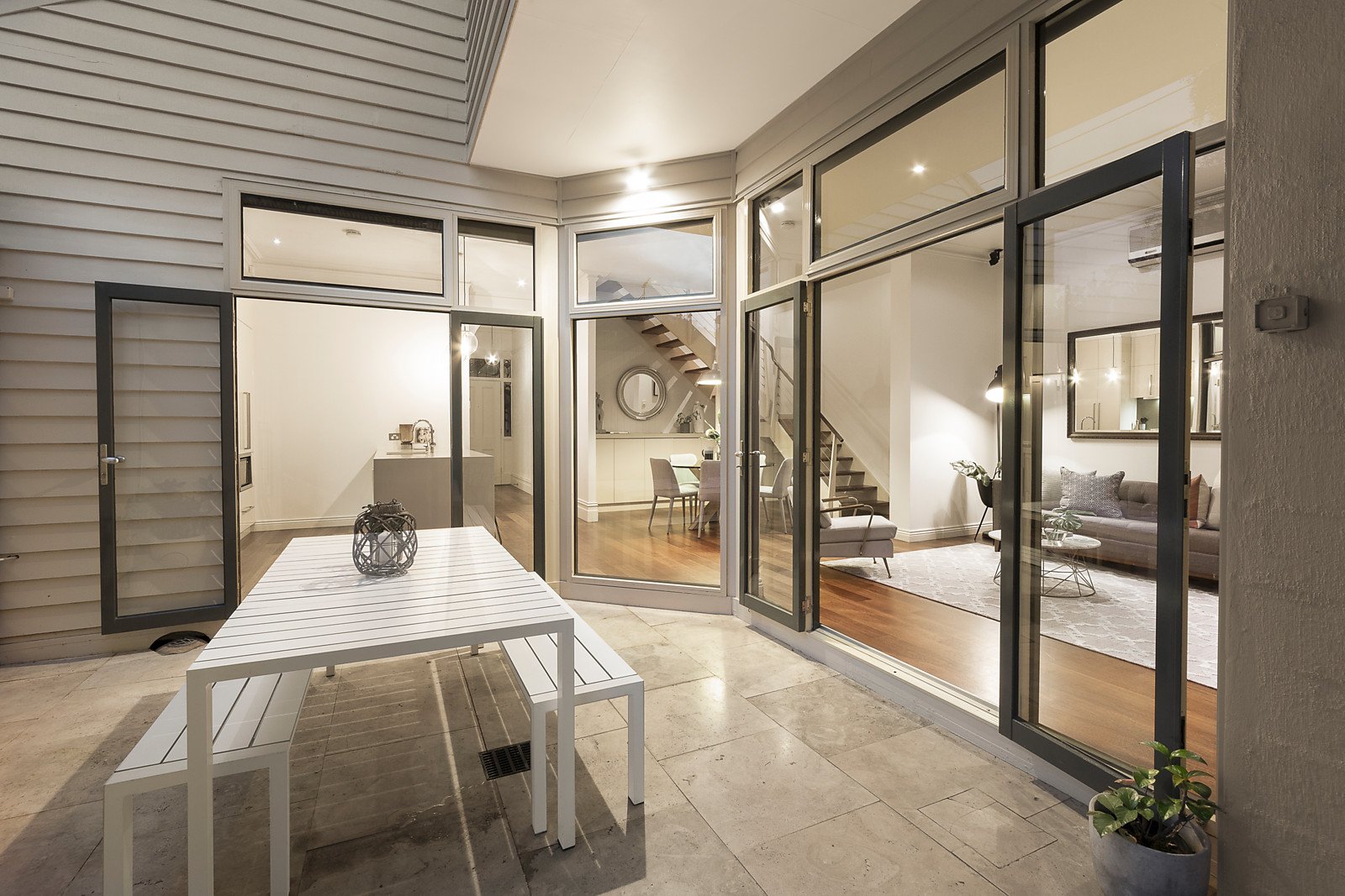 Distinguished by ornate leadlight windows and high ceilings, the central arched hall introduces two generous bedrooms with BIRs and plantation shutters, one also with an open fireplace and bay window; in addition to a stylish, fully tiled bathroom with dual sinks, Japanese style soaking tub and European laundry. The sleek gourmet kitchen appointed with stone benches and Ilve oven and is conveniently adjacent to the bright and inviting dining and living spaces, warmed by a gas log fire. Two sets of French doors open the living out to a private paved low-maintenance courtyard with covered area for year round outdoor dining; with bi-fold doors that access Smith Street and also offer OSP. Upstairs, the third bedroom or home office boasts city views and a sunny northern aspect as well as BIRs. Combined with an addition study nook and spacious main bedroom with BIRs, contemporary en suite and secluded sun deck overlooking the Melbourne skyline.