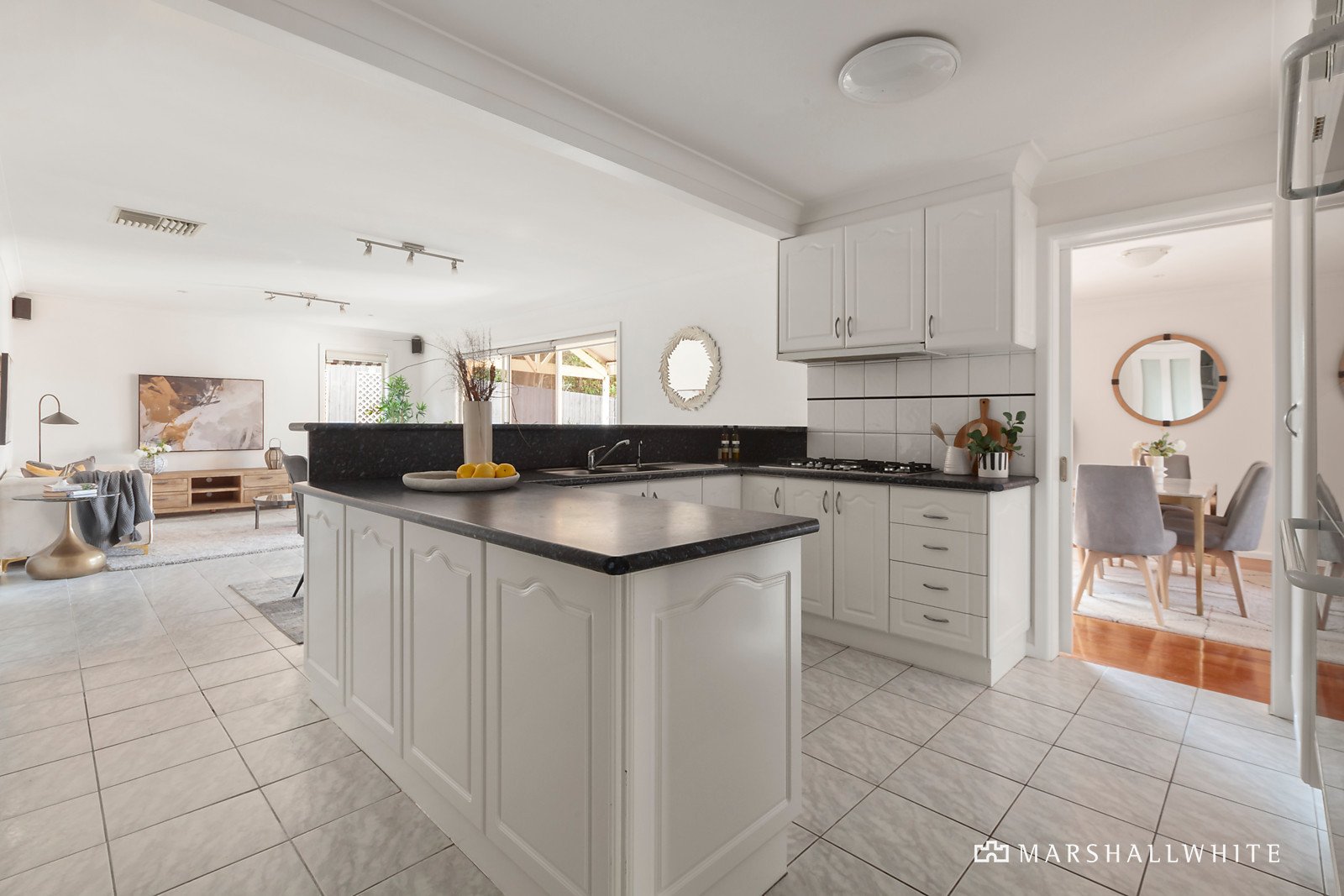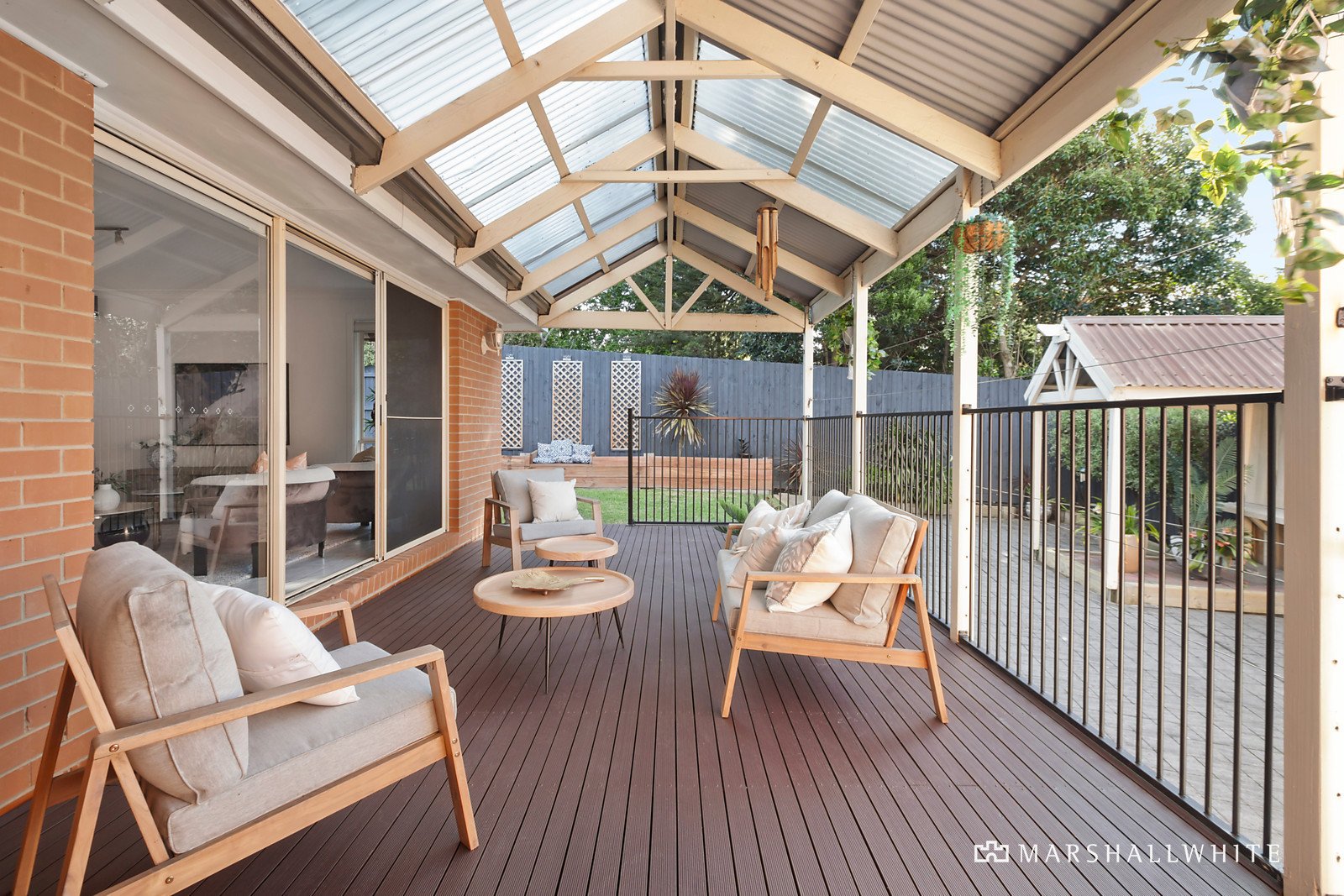 The heart of the home is its well-appointed kitchen, complete with ample storage, a dishwasher, a 90cm gas cooker, double wall ovens, and a brand-new range hood. This kitchen seamlessly connects to a generously sized family room, which opens up to a large covered north-facing timber deck, creating the perfect setting for year-round entertaining while overseeing the low-maintenance backyard.