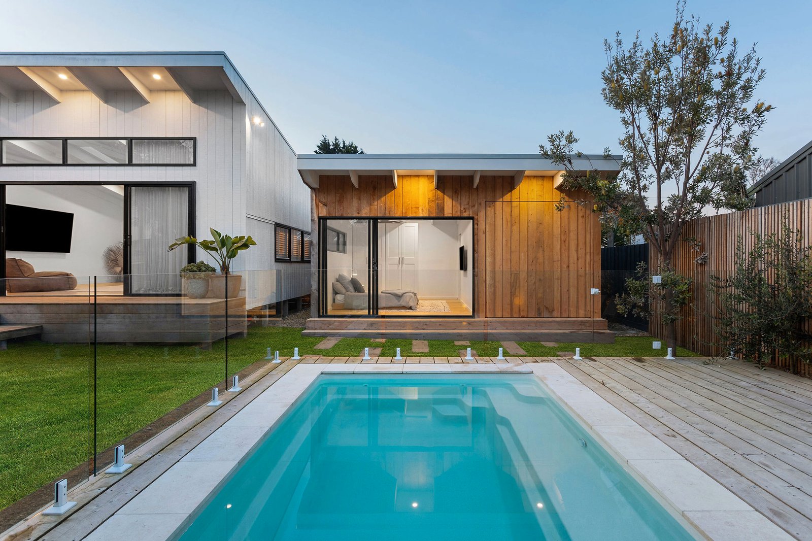 A newly constructed split-level extension contains the home’s expansive second living area/rumpus room with sheer-linen curtains and pool outlooks. The zoned main bedroom suite will impress with a large dressing room/walk-in robe and Skandi-inspired ensuite with a custom timber vanity, brushed nickel tapware, and a glass-ceilinged walk-in shower. Outside, the undercover alfresco zone has a wood fire heater and automated awnings can fully enclose the space to allow for all-season entertaining, whilst the multi-level cypress decking wraps around the fully fenced pet-friendly backyard and incorporates the recently built studio with ensuite, a storage/utility room and outdoor shower.
