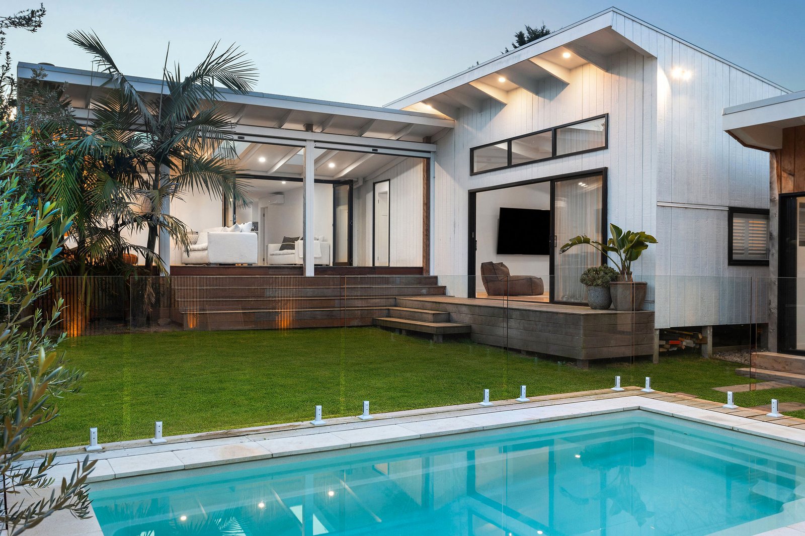 Privately and securely set behind automated gates, with newly landscaped coastal-inspired front gardens, the home’s flowing open layout incorporates a stone/Smeg kitchen, and indoor/outdoor living spaces that extend towards a sparkling heated swimming pool and sun deck.