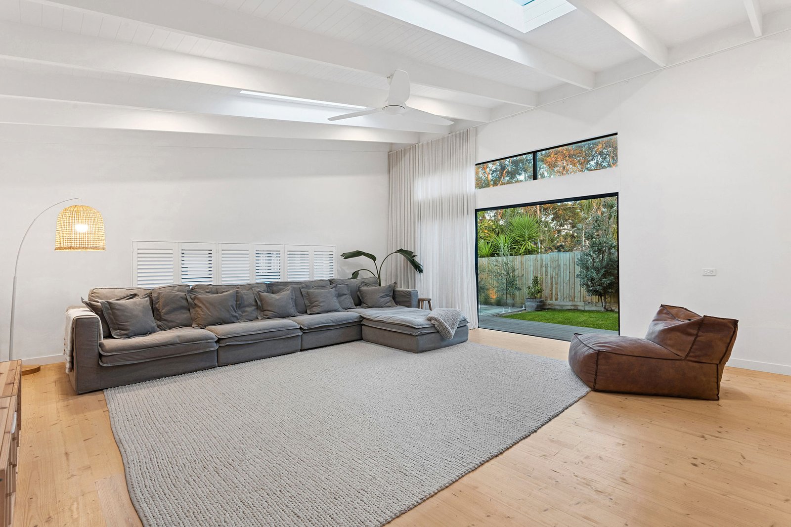 Lime-washed timber flooring is capped by high ceilings lined with a series of obtuse-angle Velux skylights, which flood the spaces with natural light. Hydronic heating, including units above bathroom towel rails, beautifully boosts the home’s health and comfort levels, and 9.3kw rooftop solar panels reduce the home’s energy usage bills, including for the electric heat pump system that can heat the pool to 40 degrees.