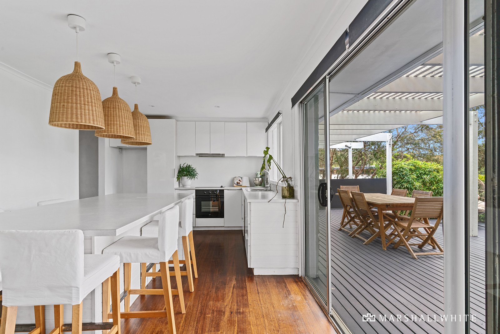 Set on almost a quarter of an acre (993 square metres approx.) and surrounded by established coastal gardens, the rustic abode is warm and inviting with polished hardwood floors and a wood fire heater in the living area, which wraps around to the family/dining and kitchen zone that features a large central island bench/breakfast bar, and is equipped with quality appliances. Glass sliding doors open out to the expansive multi-level alfresco entertaining deck, partly covered with a pergola, where far-reaching bushland views and bay glimpses through the treetops will leave you in no doubt of your prime Peninsula position.
