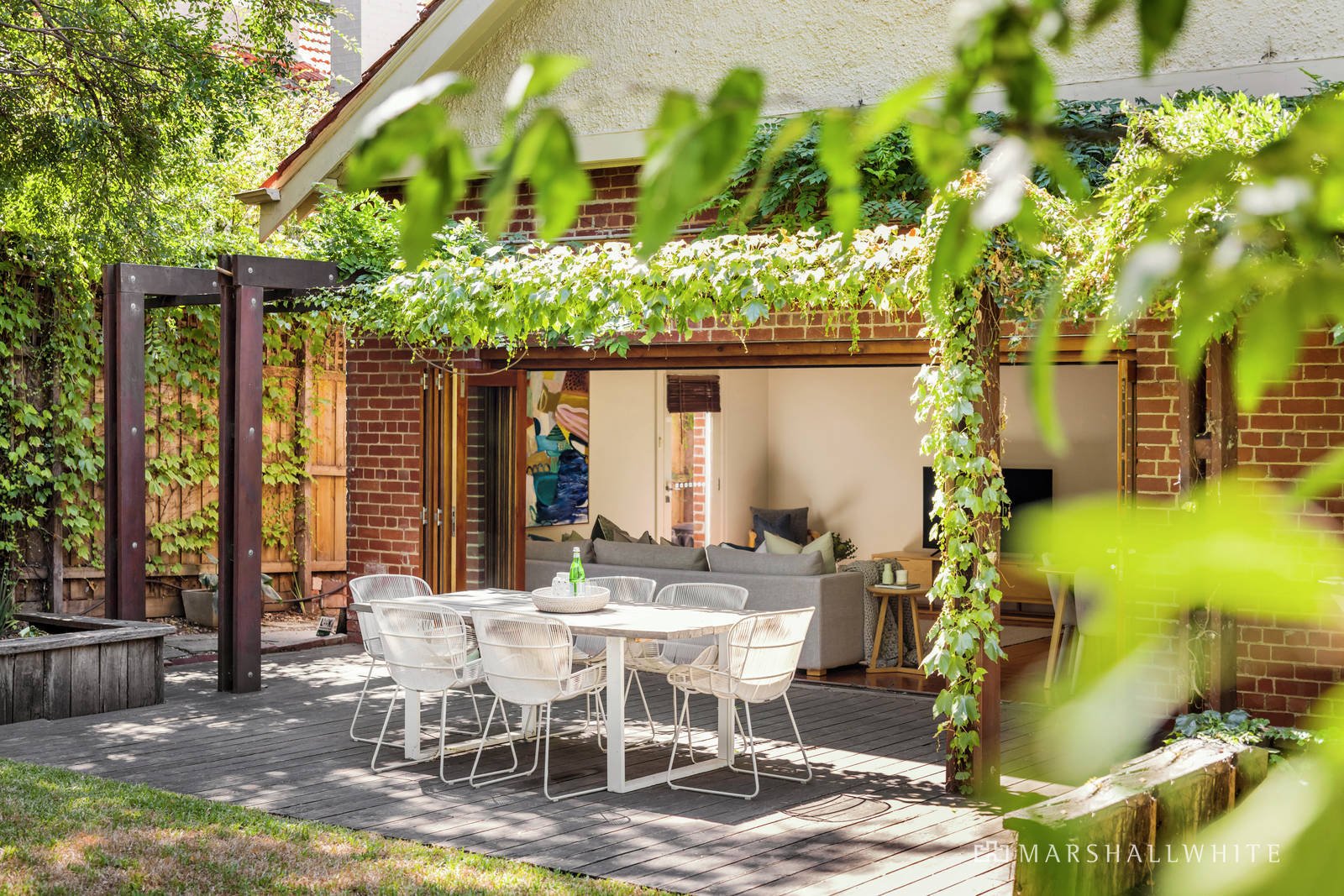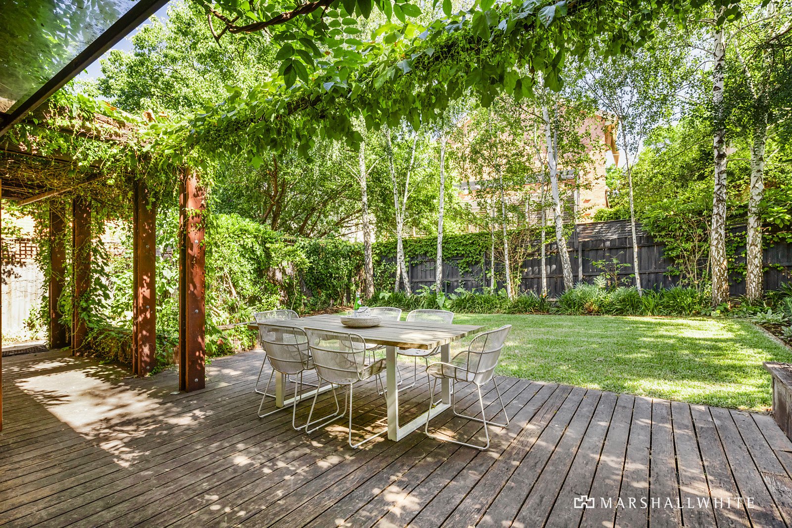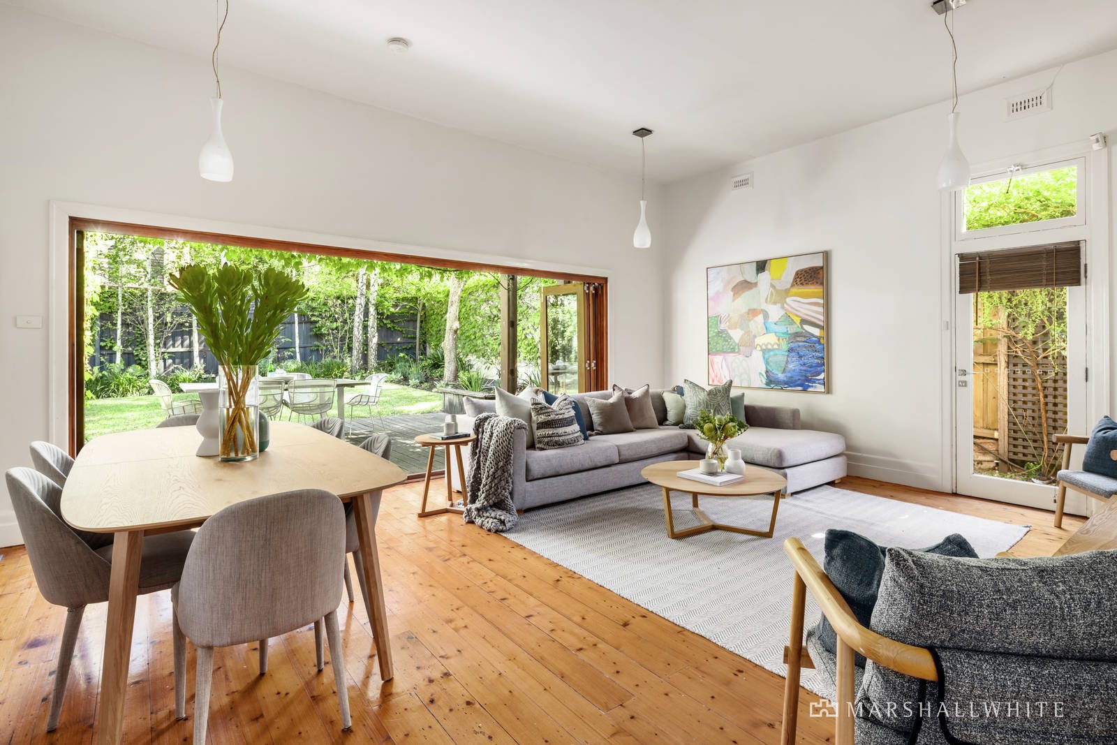 Baltic pine floors flow through the central hall, gracious sitting room with an open fire and a home office. Beneath a soaring ceiling, the superb Miele/Neff appointed kitchen and expansive open plan living and dining room opens through bi-fold doors to a vine covered deck and the private leafy garden. Two double bedrooms and a stylish bathroom on the ground level are matched upstairs by three additional bedrooms with robes, a retreat and chic bathroom with bath.