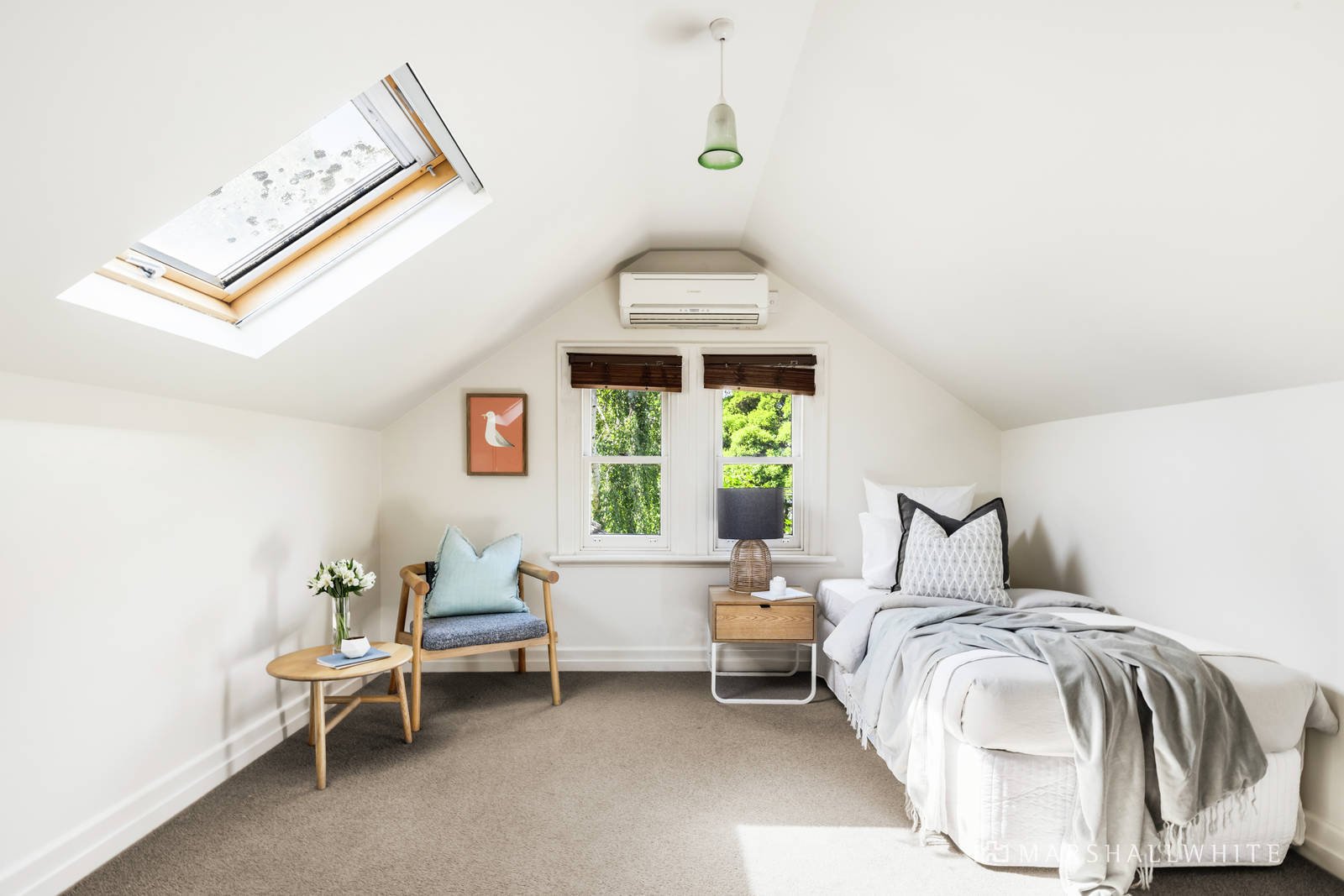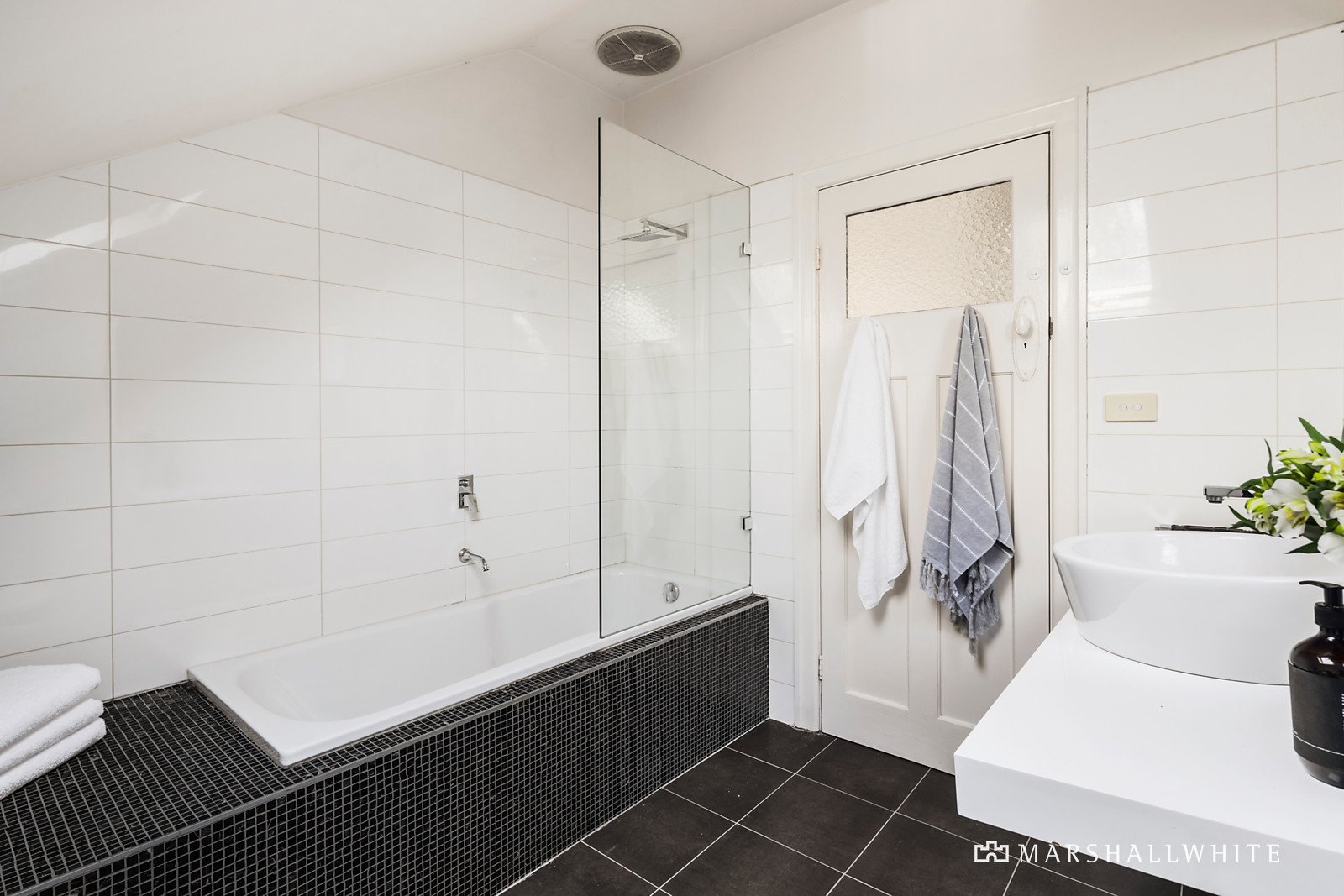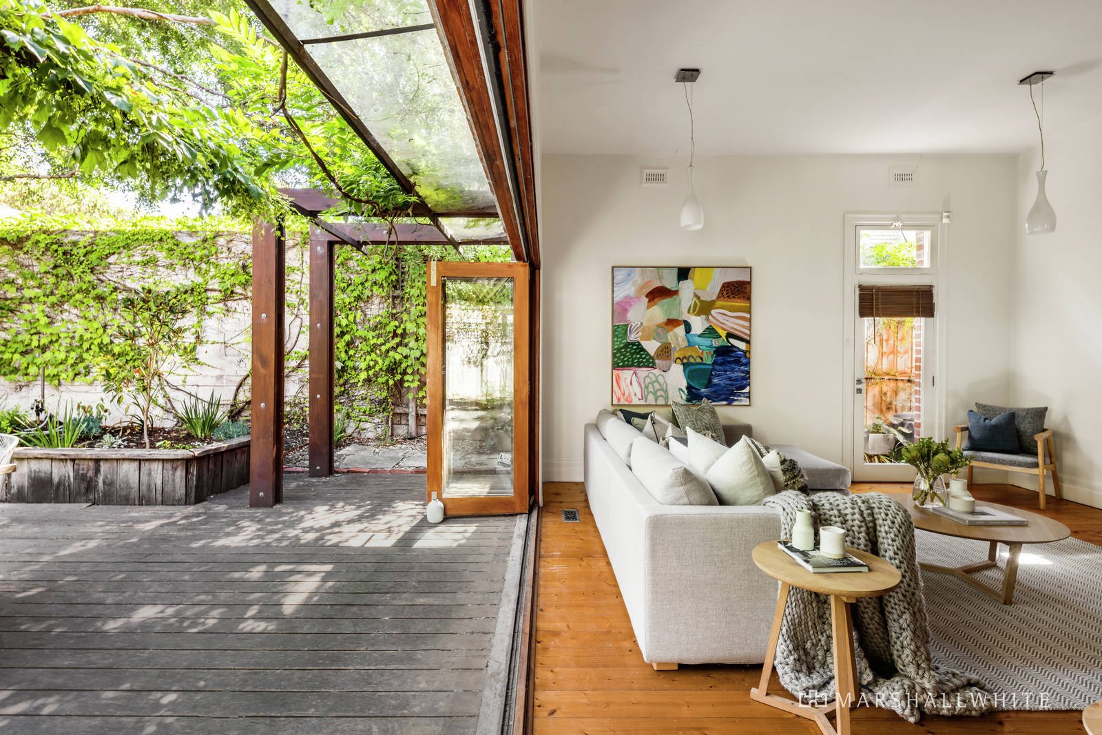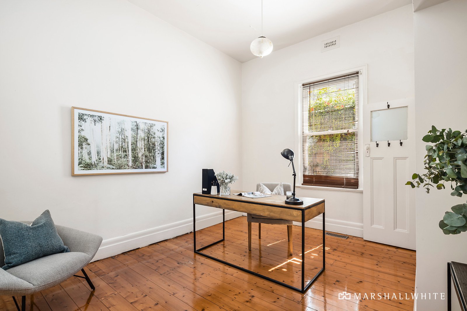 Baltic pine floors flow through the central hall, gracious sitting room with an open fire and a home office. Beneath a soaring ceiling, the superb Miele/Neff appointed kitchen and expansive open plan living and dining room opens through bi-fold doors to a vine covered deck and the private leafy garden. Two double bedrooms and a stylish bathroom on the ground level are matched upstairs by three additional bedrooms with robes, a retreat and chic bathroom with bath.