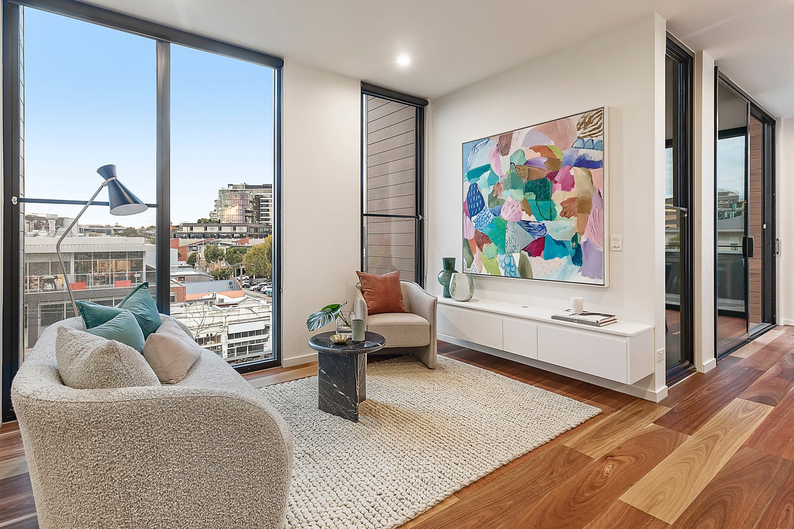 Hardwood timber floors flow through the wide entrance hall, sleek gourmet kitchen boasting white stone benches and Ilve appliances and the generous living and dining spaces, all bathed in northern light. The living areas open to a wrap-around northeast-facing terrace, ideal for entertaining and enjoying the picturesque views. The gorgeous main bedroom with fitted walk-in robe, study alcove and designer en suite complements two additional bedrooms with built-in robes and a stylish bathroom.