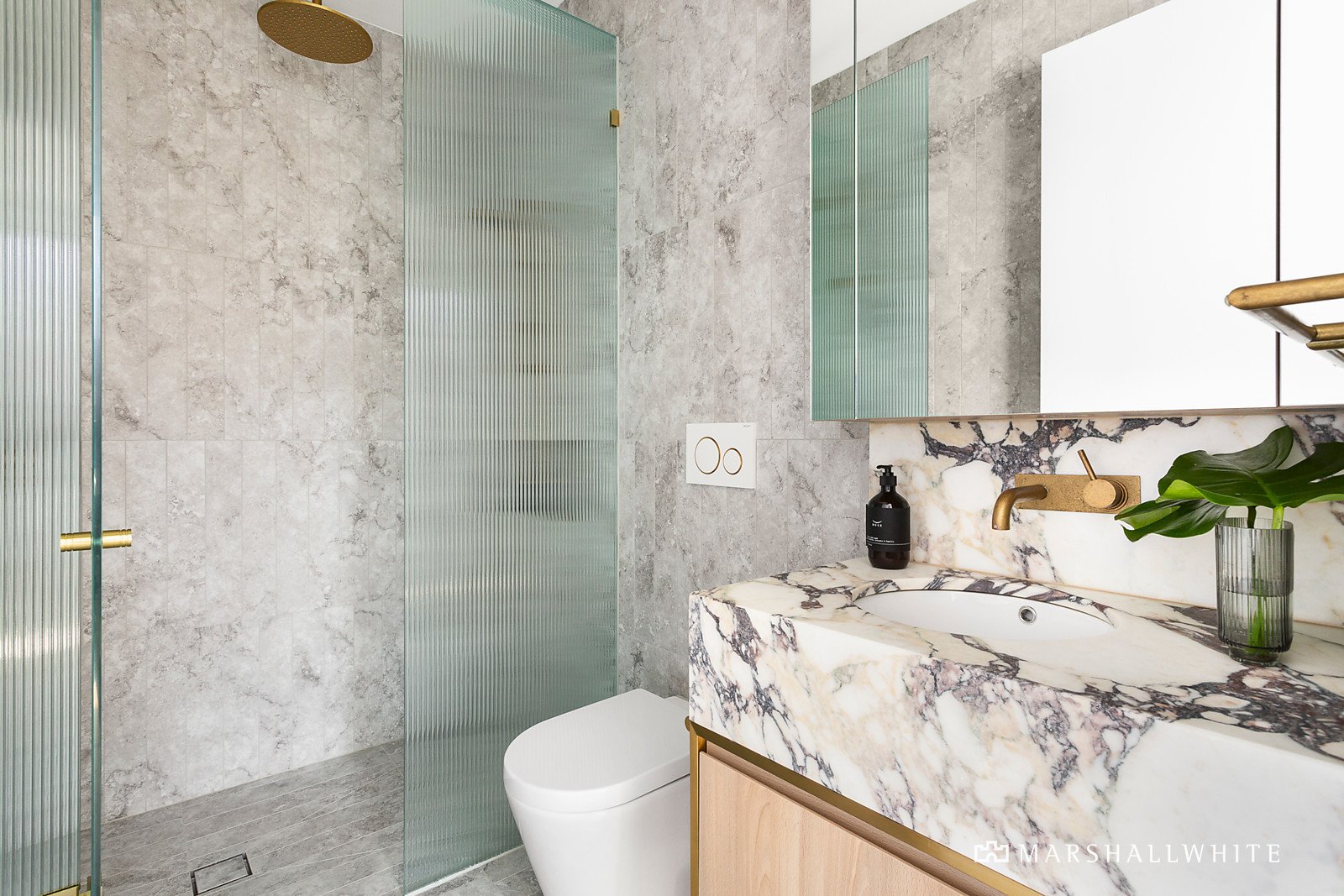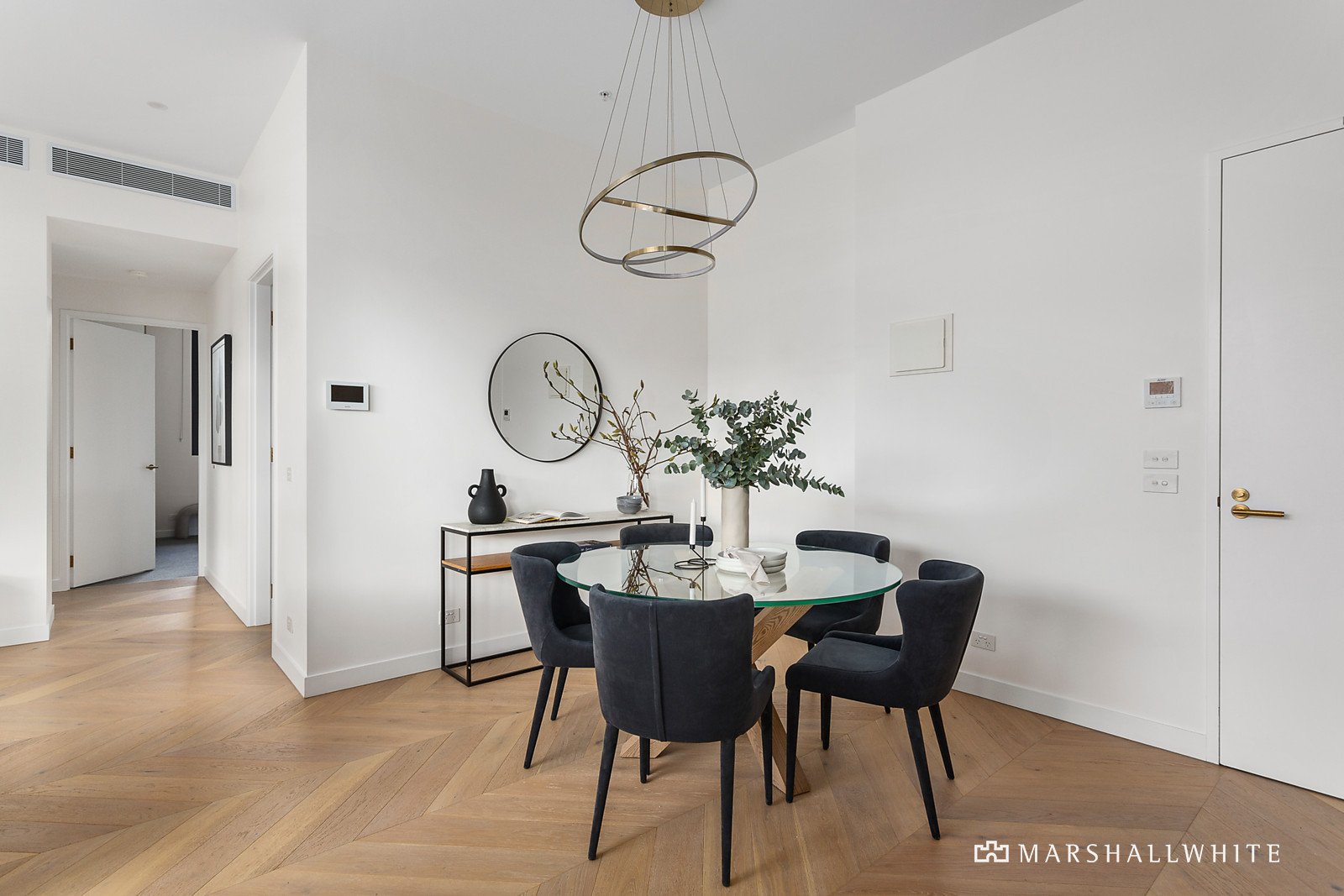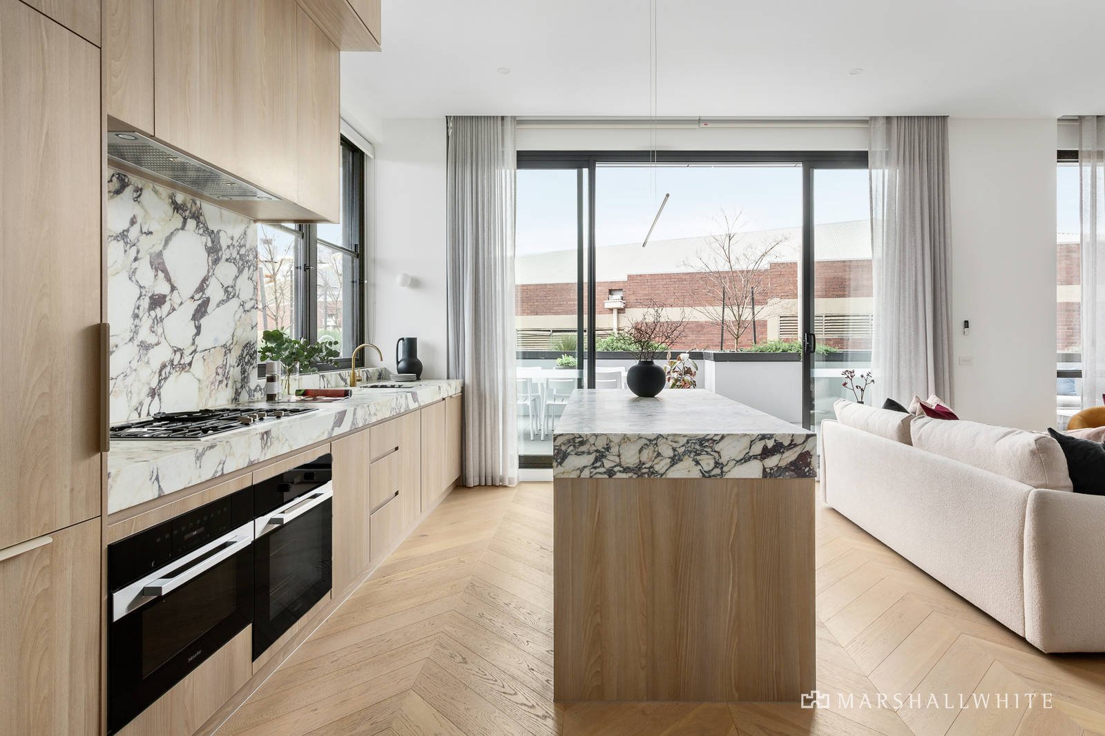 The design by Pitch Architects highlights natural light, a sense of space and absolute privacy throughout. Bespoke finishes including Calacatta Viola marble, oak chevron parquetry floors and designer light-fittings in addition to the 3.2m ceilings enhance the luxurious ambience of the generous living/dining room and the premium Miele kitchen with integrated fridge/freezer. Full height glass sliders extend the living out to the sensational private terrace with BBQ kitchen and garden surrounds providing an idyllic venue for enjoying sunsets and the NYE fireworks. The main bedroom is complete with a deluxe en suite, Toto automatic toilet and built in robes. A second double bedroom with robes and fitted study both open to the terrace. There is also a second stylish bathroom and Euro-laundry.