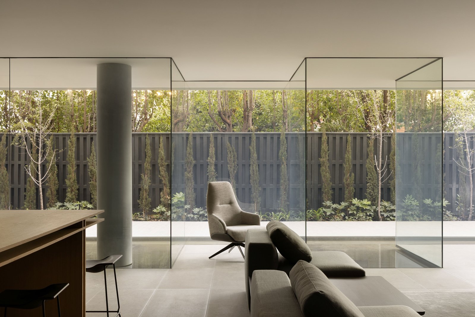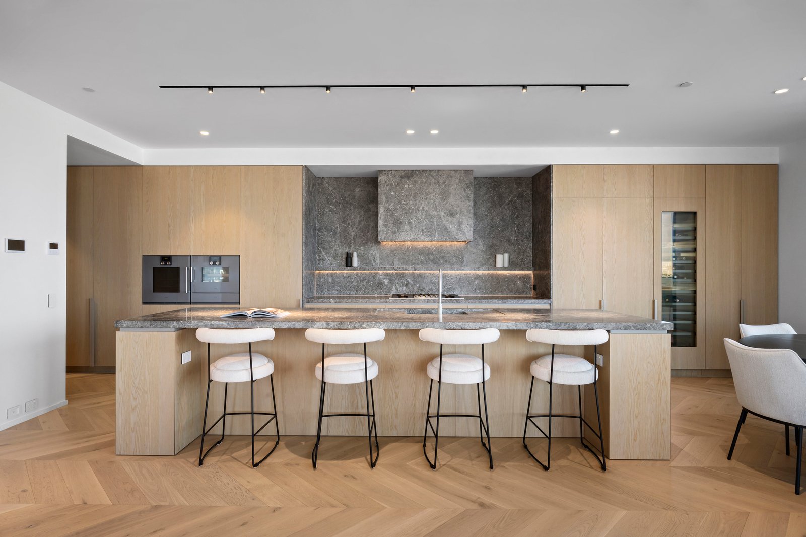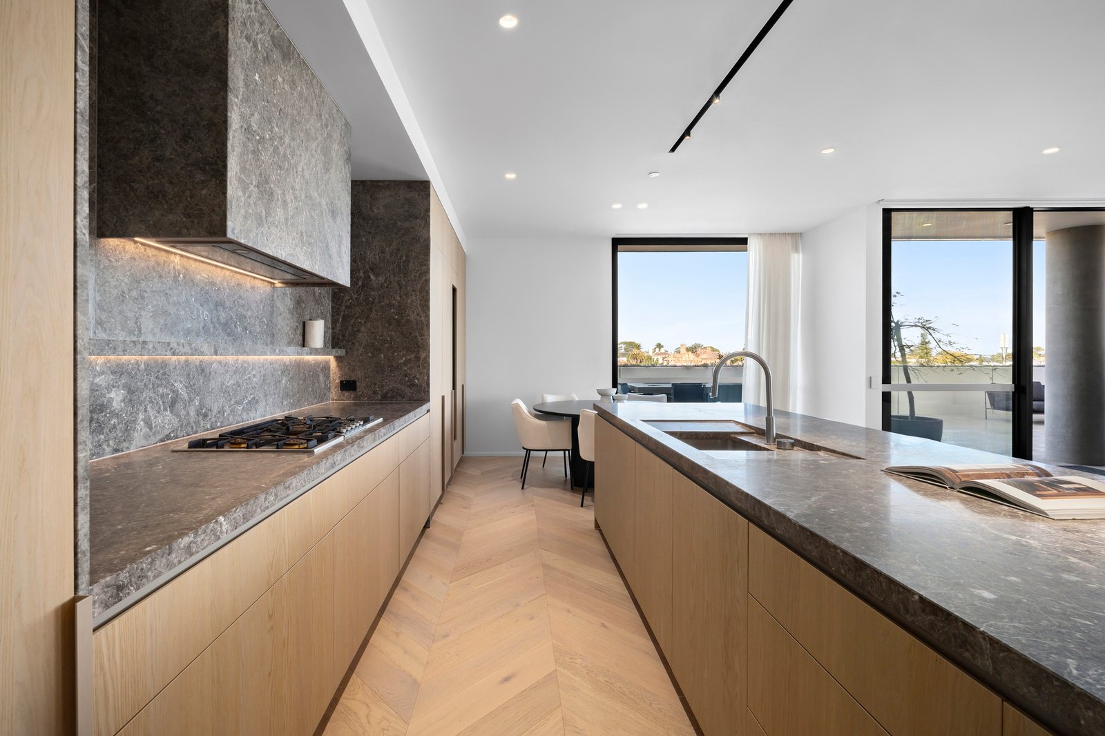 Harmoniously and cohesively fitted-out with European Oak herringbone flooring, pure wool carpets, and exquisite natural timber and stone joinery, the light-filled layout unfolds along an extra-wide entry hall that wraps around to the expansive open-plan living area, anchored by a gas log fireplace. Defined by a stone island bench, the epicurean kitchen, which extends to a butler’s pantry with Zip tap and stone-backed appliance garage, is magnificently equipped with a Liebherr integrated French door fridge/freezer, and a suite of Gaggenau appliances including a five-burner gas cooktop, two multi-function ovens, a dishwasher and an integrated wine fridge. Offering superb indoor/outdoor connectivity, sliding walls of glass open to the expansively tiled garden-edged wraparound entertaining terrace with a built-in Beefeater barbecue kitchen, and plenty of space for celebrating epic sunsets over the Bay before the sparkling city skyline is illuminated before you.