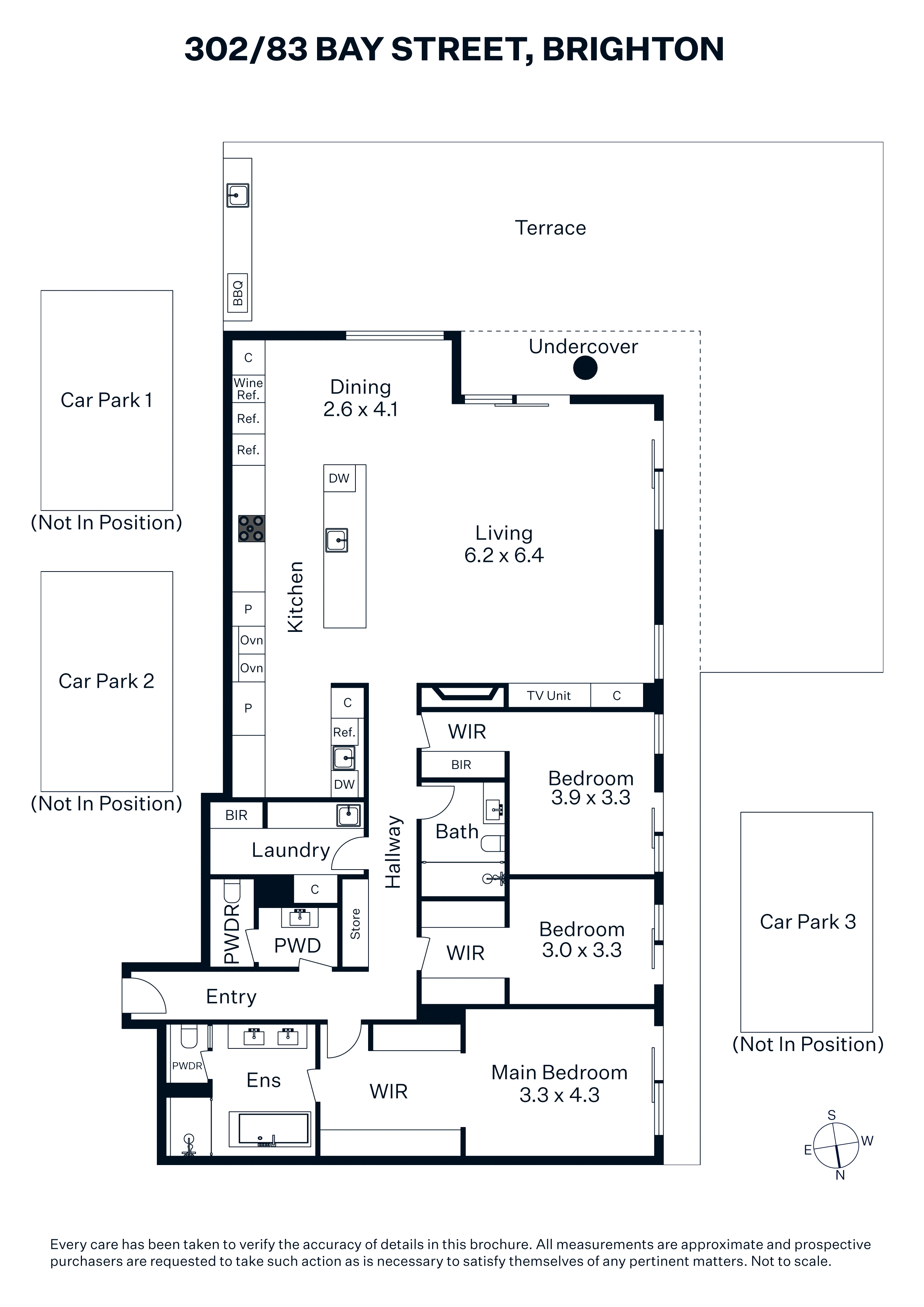 The breathtaking views can also be enjoyed from each of the three bedrooms, which have sliding door access to the balcony, including the indulgent main bedroom which is enhanced with a luxury fitted walk-through robe/dressing room and lavish ensuite with freestanding bathtub, walk-in shower room and twin vanities and Broadware tapware. Additional features include a luxuriously appointed powder room and main bathroom, a full-sized laundry room with an abundance of built-in storage cabinetry and drying racks, central zoned heating/cooling with individual room controls, automated blinds, video security entry, three basement car parks, plus basement storage.