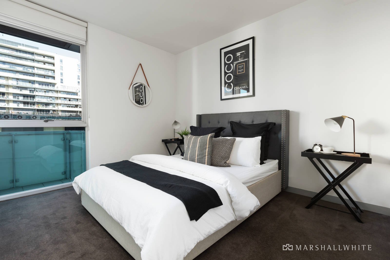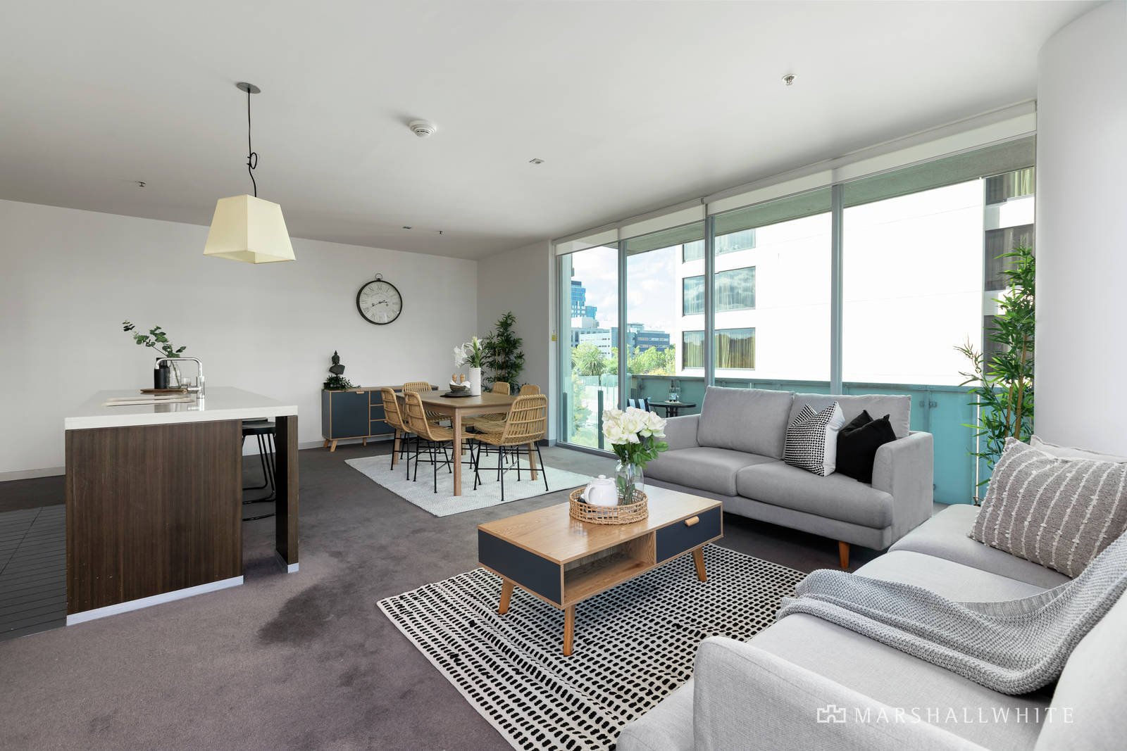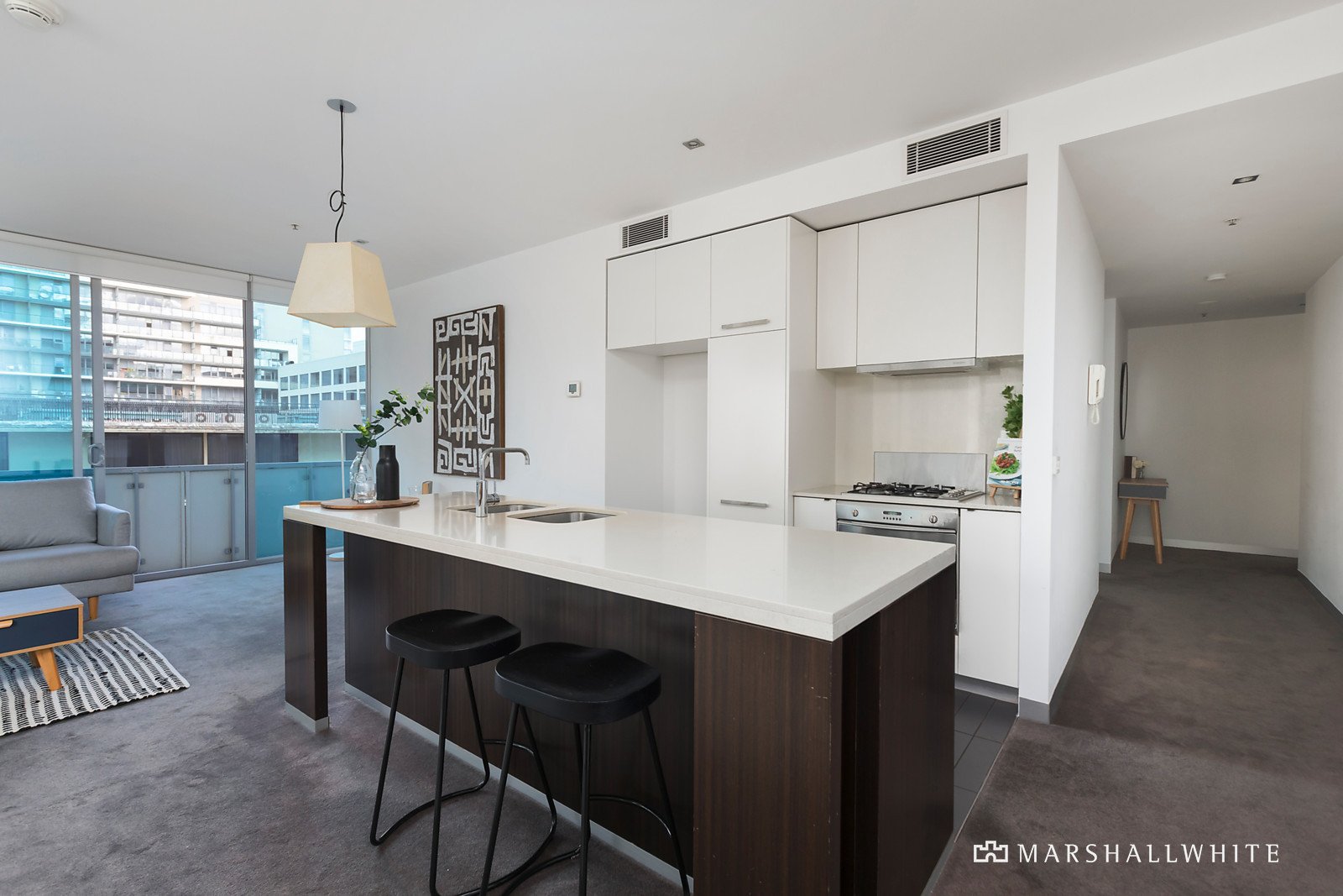 Huge floor-to-ceiling windows create a captivating connection to its urban surrounds and a wrap-around balcony from a vast open-plan living area that is underpinned by a SMEG-equipped kitchen and a central island bench of stone. Meanwhile, the master bedroom features an ensuite completed in stone, whilst both bedrooms have been appointed with substantial built-in robes, plus there is a central bathroom, a laundry, central heating and air conditioning.