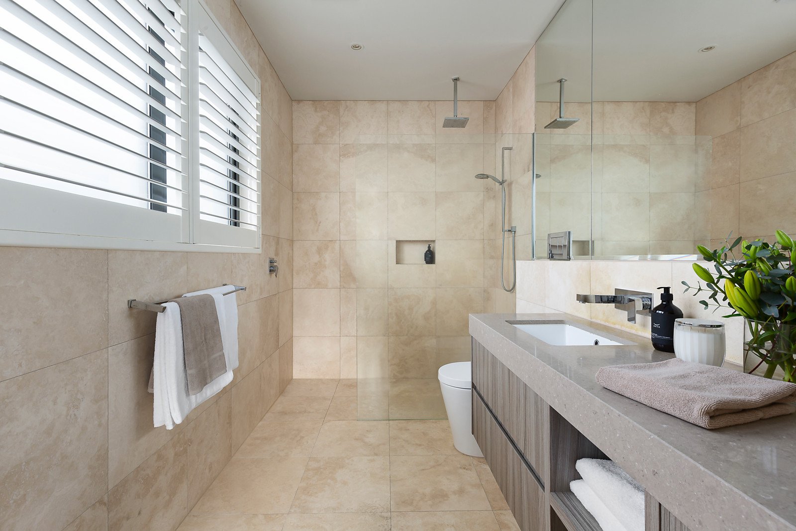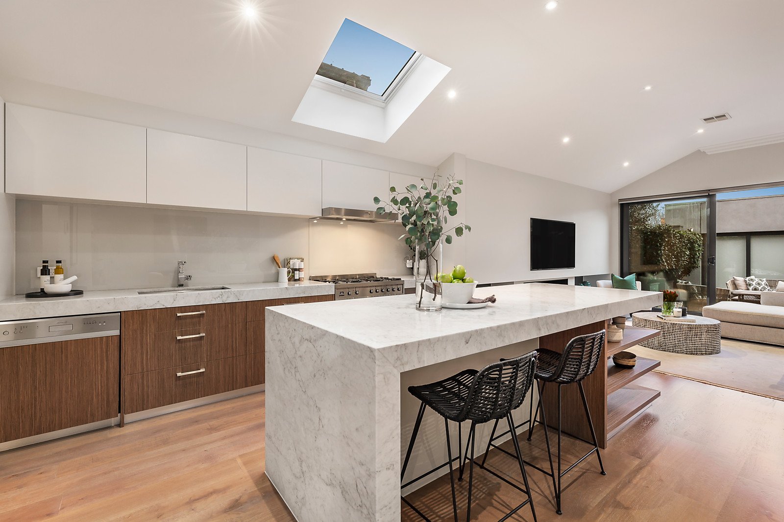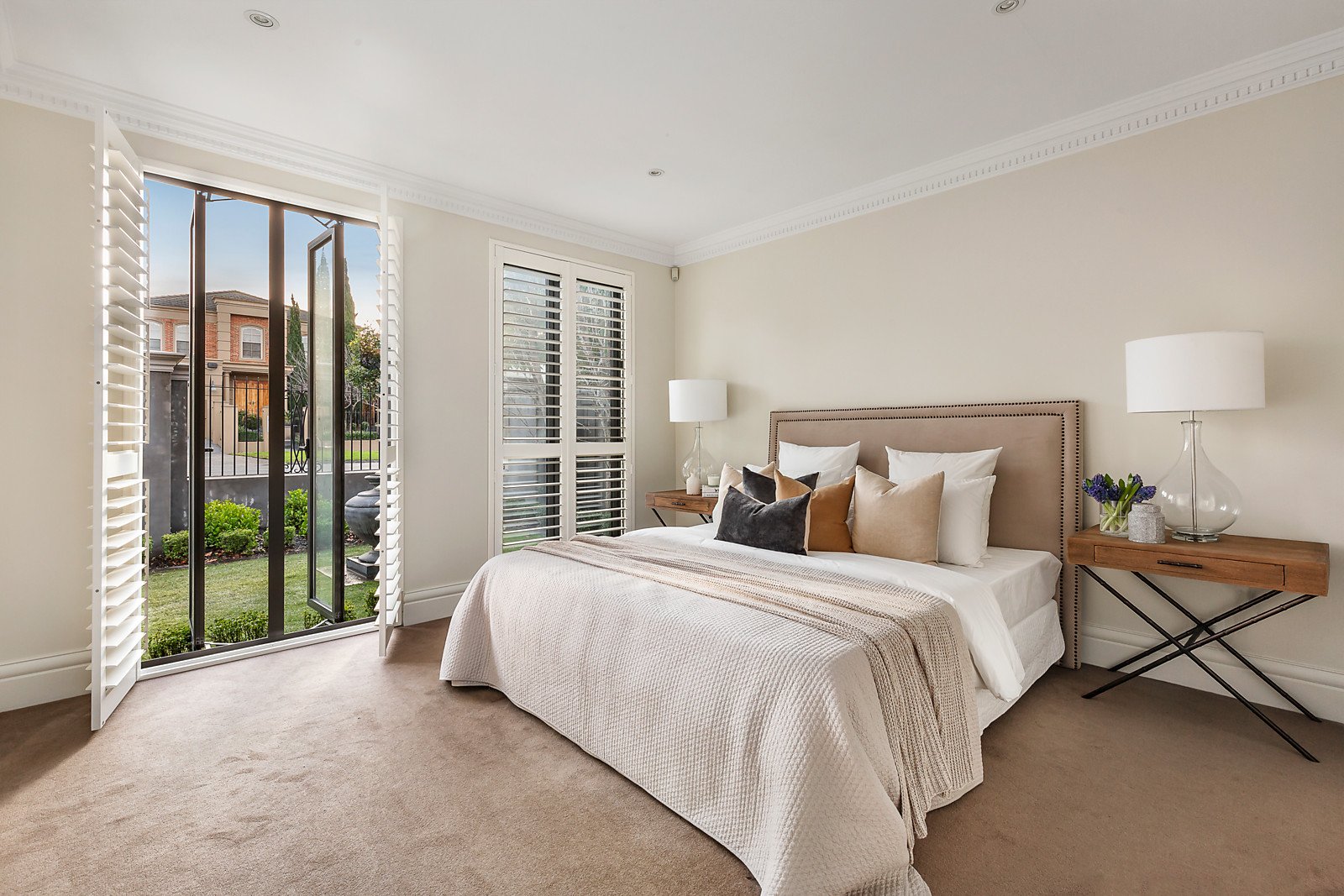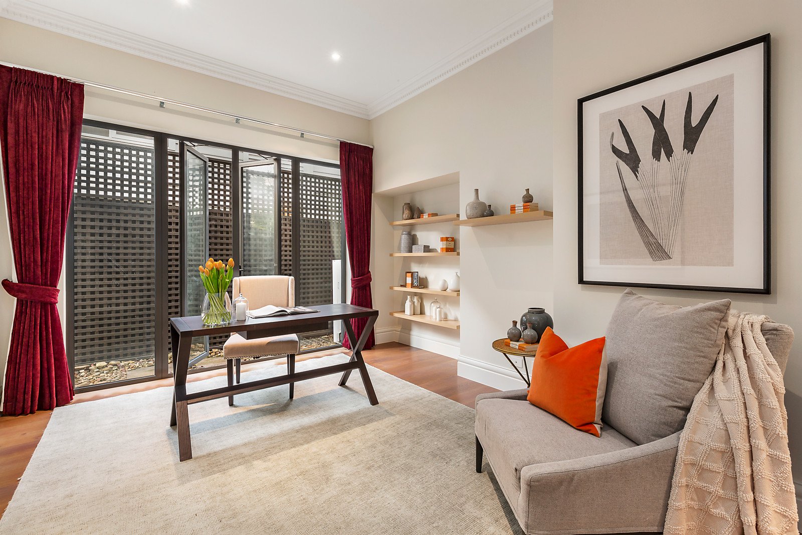 A magnificent custom-made wrought iron door reveals an exceptionally wide entrance hall with high ceilings and oak floors and an inviting sitting room or home office. Spectacular in scale, the open plan living and dining room includes a gas pebble fireplace and sublime gourmet kitchen appointed with Carrara marble benches, Smeg appliances and a butler's pantry. Full width sliding doors open the living area to a landscaped private northeast facing courtyard, an ideal venue for al fresco dining served by a clever kitchenette or bar accessed through bi-fold doors. The beautiful main bedroom with designer en suite and premium walk in robe enjoys its own space downstairs while a fabulous retreat upstairs comprises two double bedrooms with robes and a stylish shared en suite, a 4th bedroom with robe, a deluxe bathroom with freestanding bath and sunny retreat.