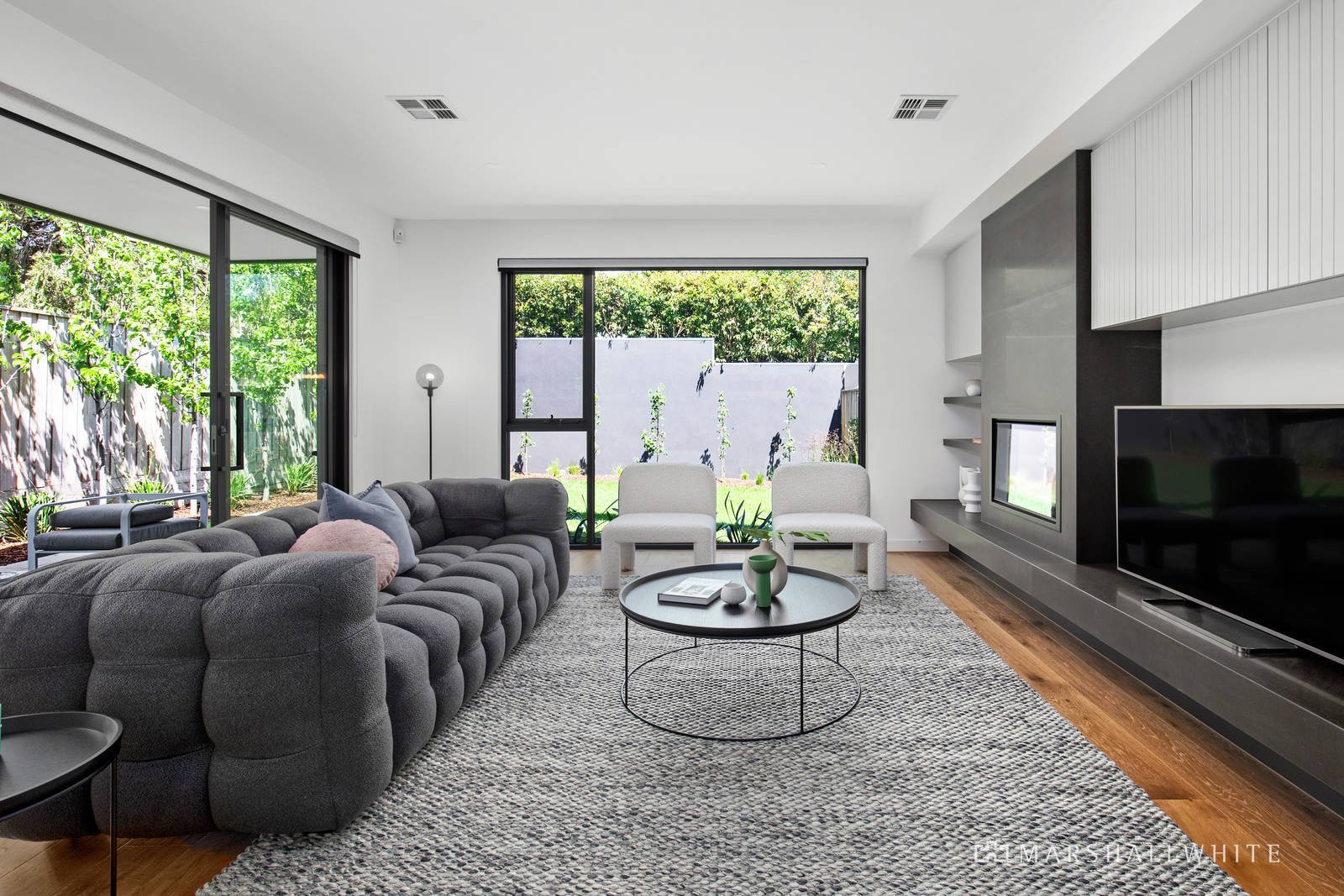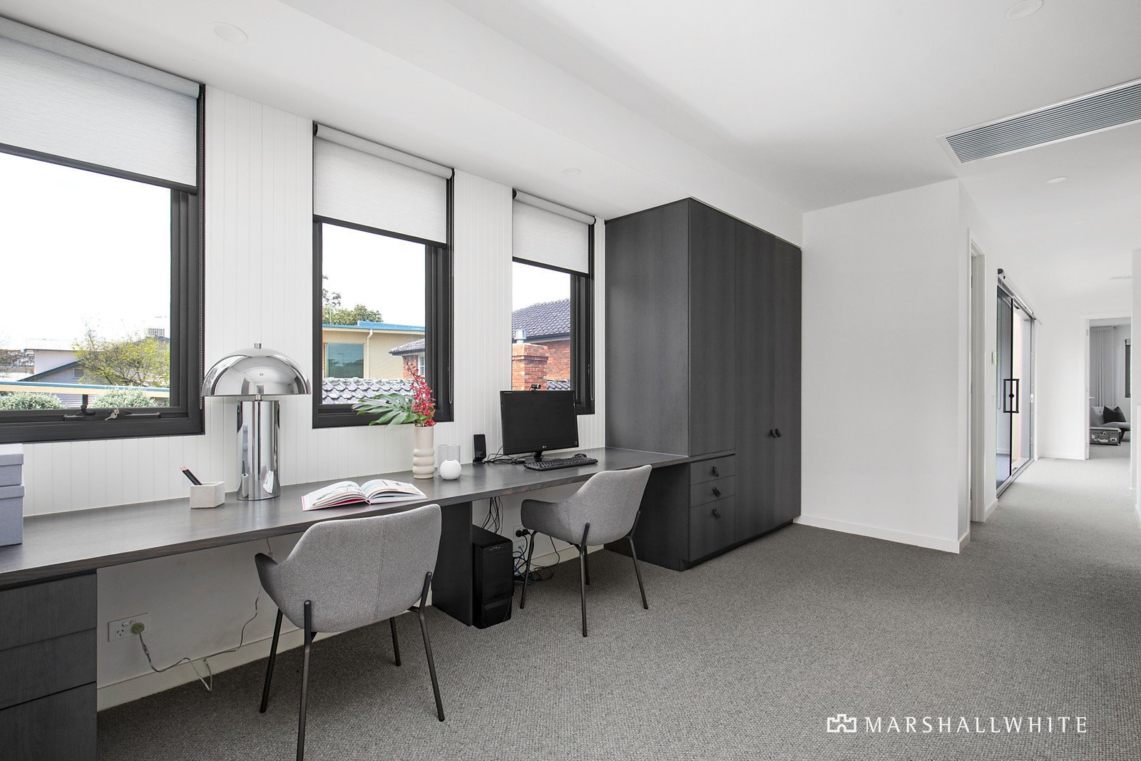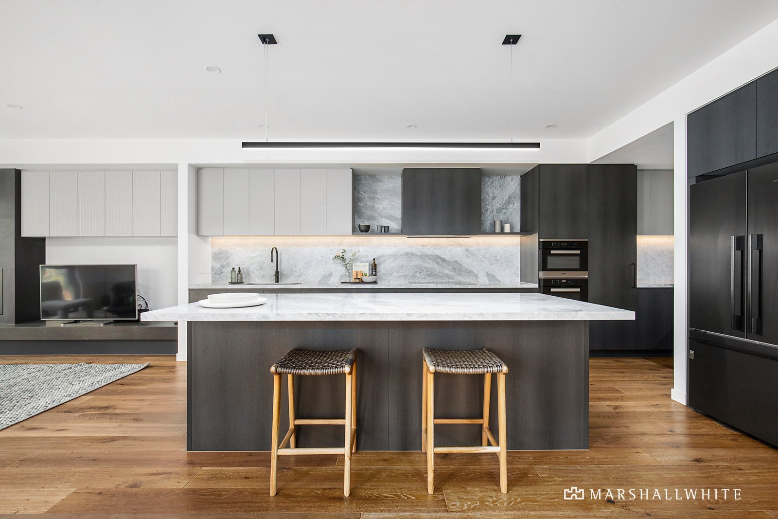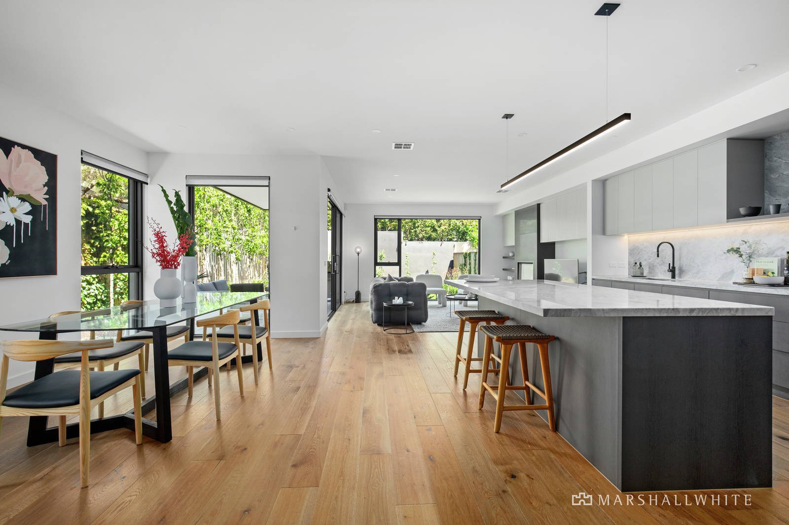 State-of-the-art collaboration between award-winning Fine Line Building Design and Austin Design Associates brings contemporary perfection to the heart of Black Rock. This impresses on so many levels, from the signature street appeal to the four-bedroom and study interior enhanced with a bay view and a sense of luxury. One look tells you this is something wonderful. Step inside and see how this works as a fine family home or indulgent hideaway, with a spacious ground-floor living and dining zone, upstairs retreat with a terrace for relaxing outdoors, and bedrooms on each level. The features and fittings are inspired. The kitchen and butler's pantry have exquisite pale grey marble splashbacks and benches, a Miele induction cooktop and two ovens, and two high-end ensuites and a bathroom impress with Rogerseller fittings. Enjoy seeing the bay from dawn to dusk from upstairs, and work from home in the well-designed study zone with a two-seater built-in desk. You can see the attention to detail and care that has gone into merging form and function, with a generous amount of storage, low-E double glazing, oak flooring, leather-tab drawers, heated towel rails, sheer curtains and blockout blinds. Outdoors is just as well-planned with an undercover dining area, low-maintenance landscaped garden, and a double garage. Sought-after address is an easy walk to the beach, close to Black Rock's cafes and shops, and Royal Melbourne Golf Club provides hectares of greenery at the end of the street.