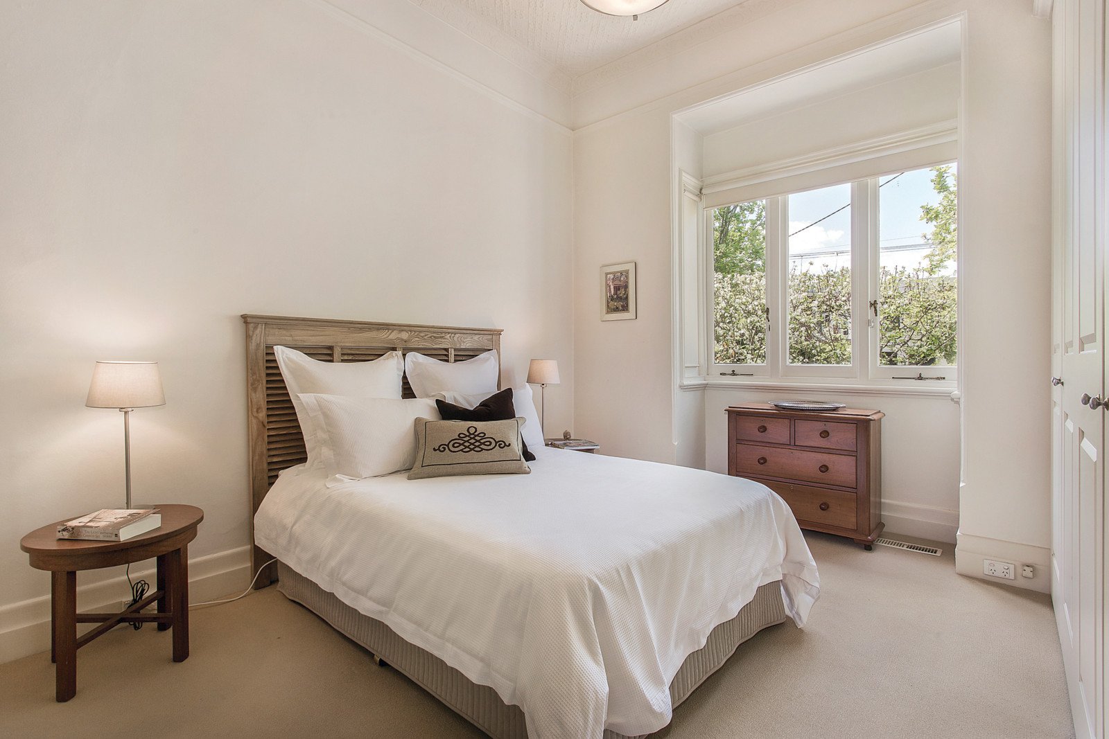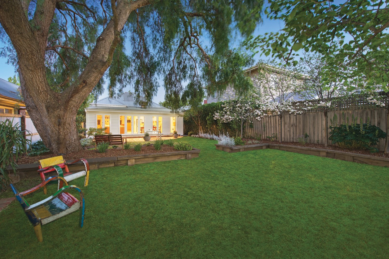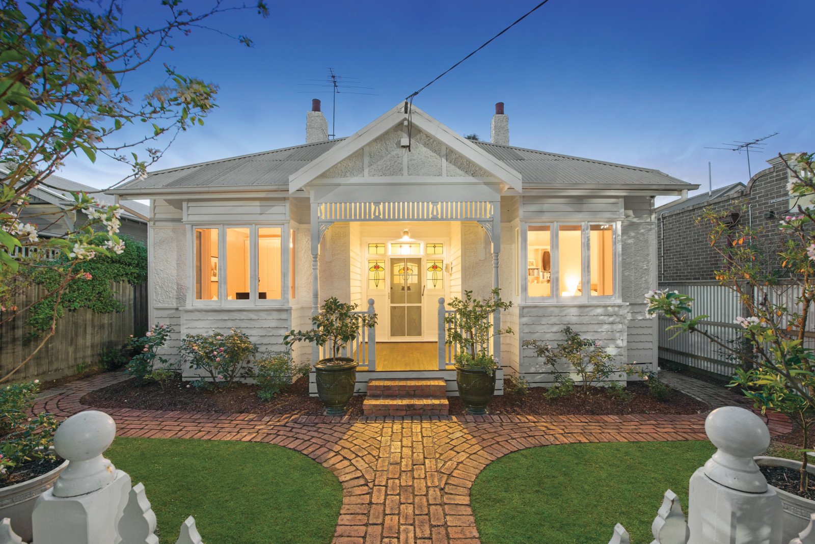The enchanting façade framed by a gorgeous garden reveals an interior of equal charm with pressed metal ceilings featured in the central hall, beautiful sitting room and two double bedrooms also boasting open fireplaces and built in robes. Two further bedrooms with built in robes are complemented by a stylish fully tiled bathroom. The gourmet kitchen with stone benches and stainless steel appliances and the light-filled living and dining room open out to a deep northwest facing leafy garden with rear right of way.