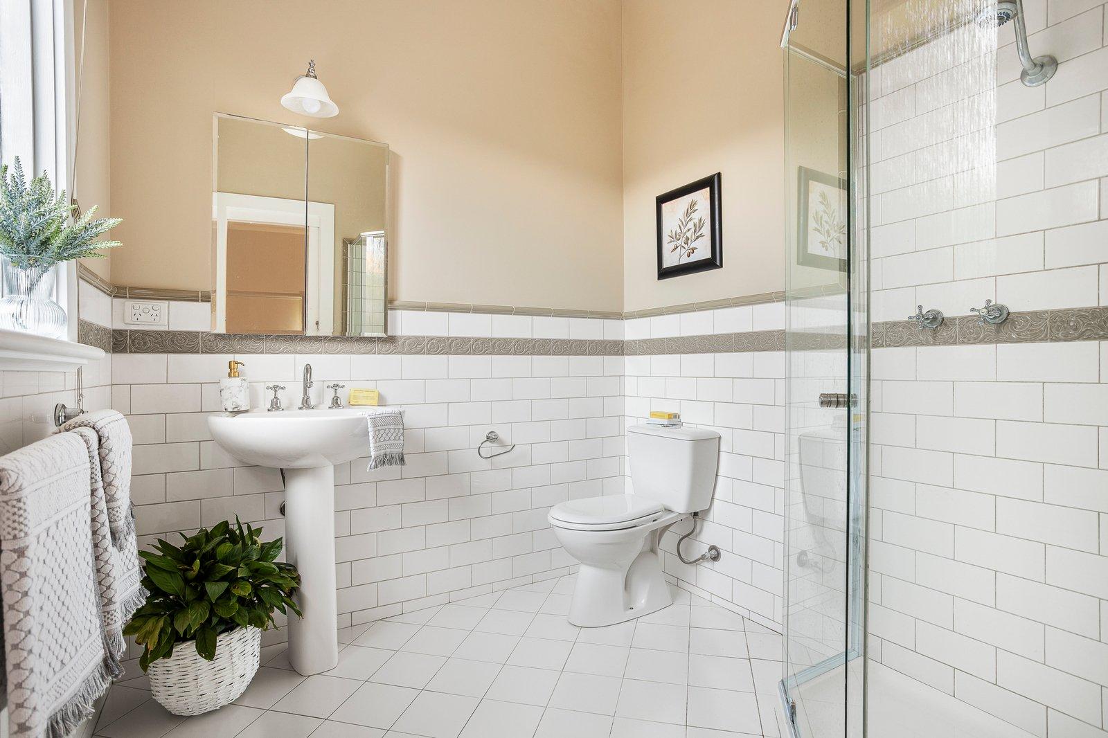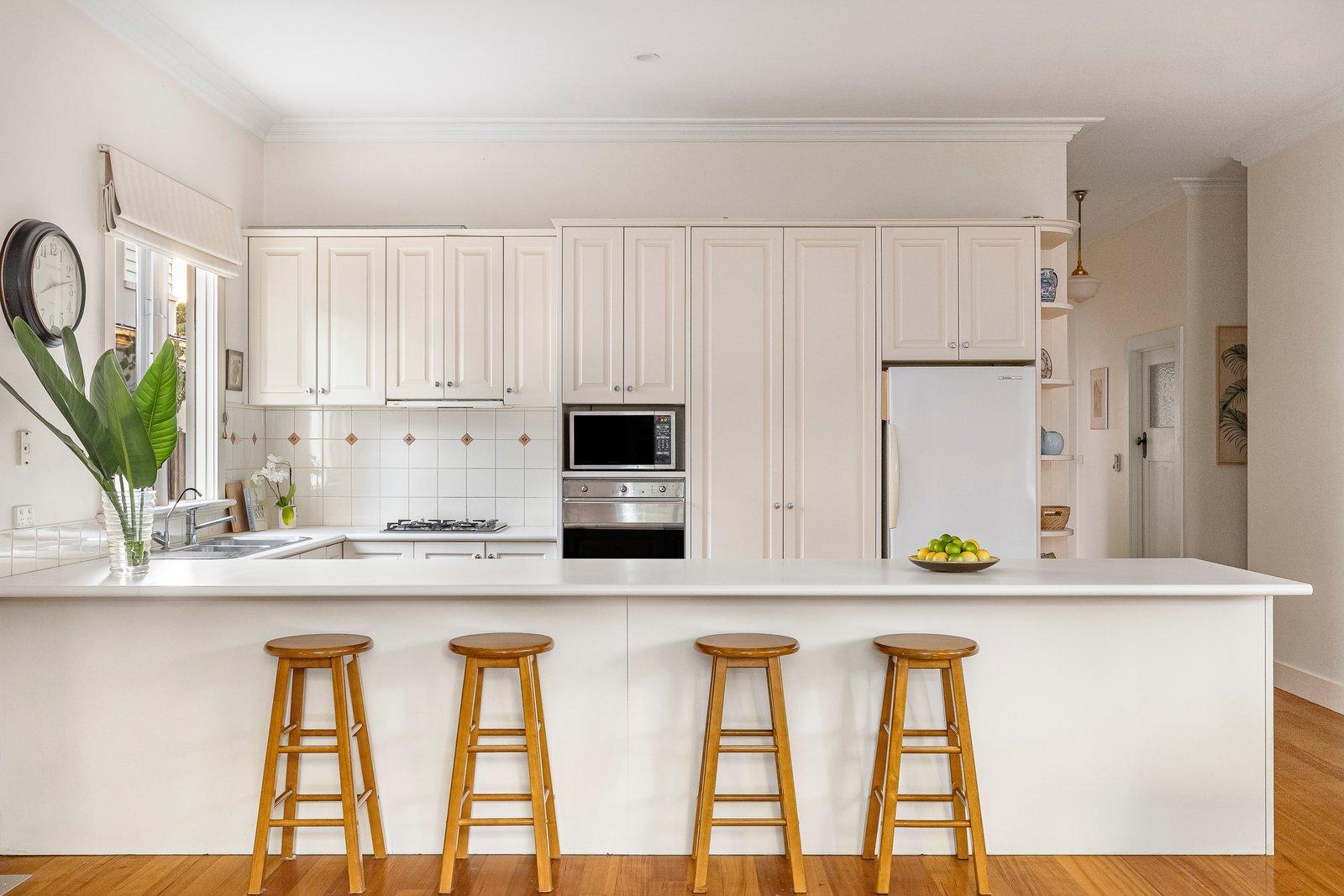 Ornate ceilings, timber floors and leadlight windows add rich character to the wide central hall and gracious sitting room with a fireplace and sunny study alcove. The generous main bedroom with walk in robe and ensuite is complemented by three additional double bedrooms and a bright bathroom. Timber floors flow through the well-appointed modern kitchen with a Smeg oven and the expansive open plan living and dining room. Double doors open the living space to a paved entertaining terrace and the deep private northeast facing leafy garden.