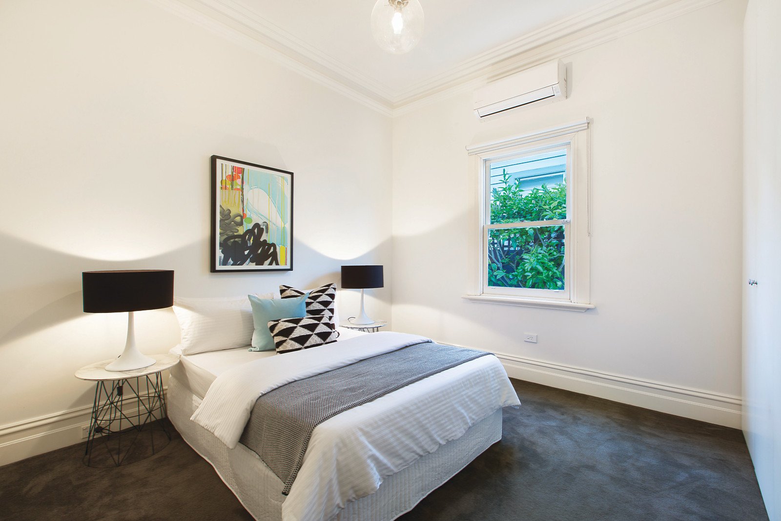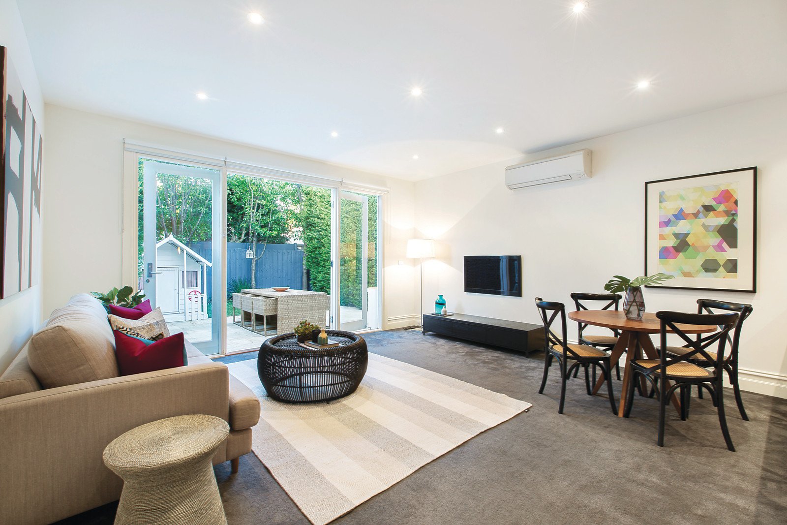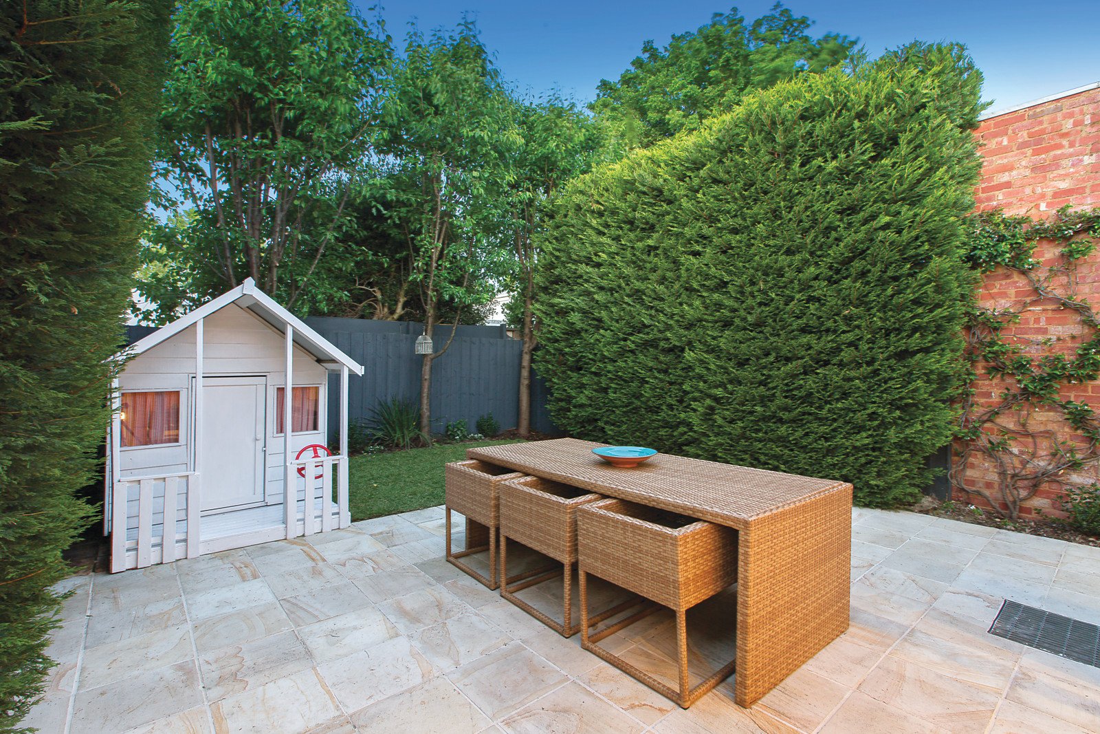 The wide entrance hall introduces three bedrooms, high ceilings and a stylish bathroom. The superbly appointed European kitchen with stone benches and a light-filled, spacious living and dining room open through bi-fold doors to a gorgeous private north-facing garden oasis surrounded by leafy hedges and Manchurian Pears and boasting a large stone entertaining terrace.