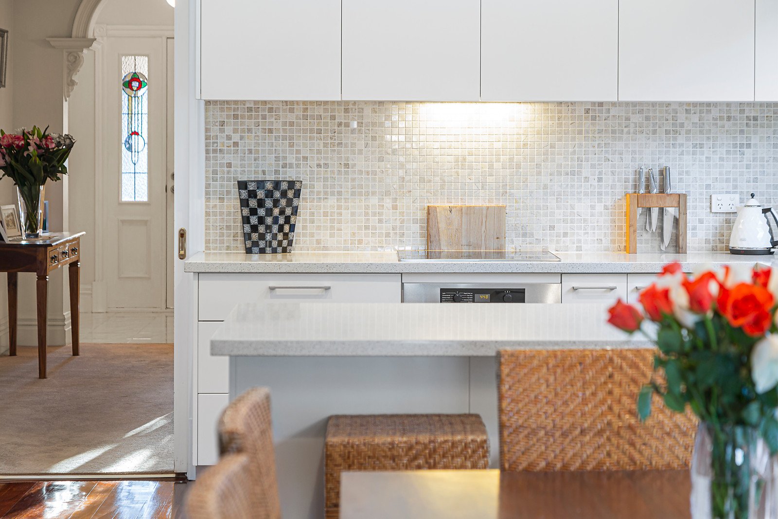 An arched hallway introduces a generous formal sitting and dining room warmed by an open fireplace. Timber floors flow through the premium gourmet kitchen appointed with Miele appliances and stone benches and light-filled dining area. An expansive family living room with an inviting conservatory style alcove opens to a BBQ deck overlooking the private leafy garden and heated pool. The main bedroom with walk in robe and chic en suite is accompanied by two additional bedrooms with built in robes, a study or 4th bedroom and a stylish bathroom.