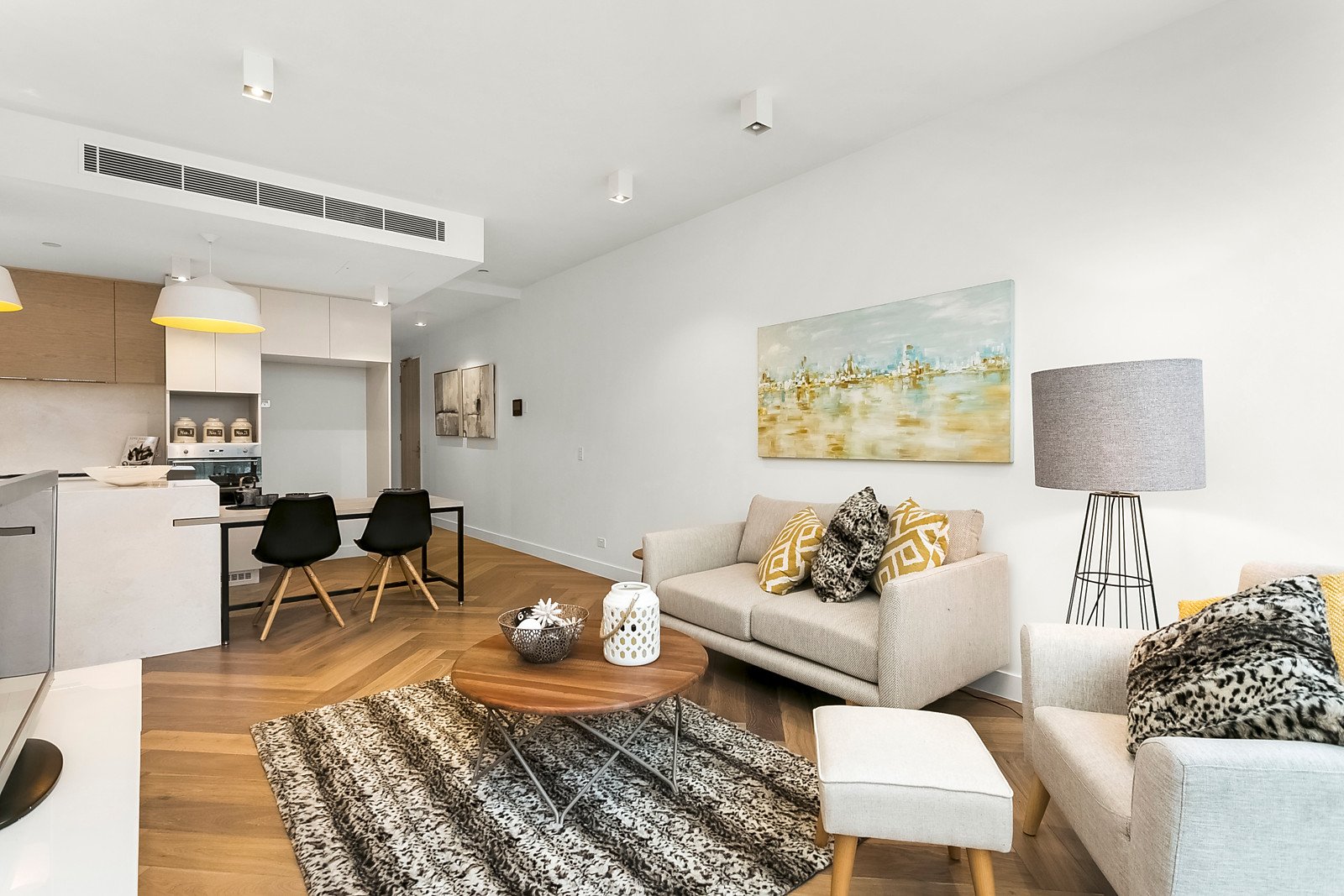 Blessed with an abundance of natural light and with French Oak herringbone laid flooring and stone finishes highlight attractive interiors including an open-plan living and dining domain with sliding doors opening to the balcony overlooking Fritsch Holzer Park. Smeg equipped kitchen with integrated dining table, master bedroom with an ensuite and Juliet balcony plus secure video intercom, Euro laundry, second bathroom with rainfall showerheads, double glazing windows throughout, storage cage and secure basement parking further enhances the overall appeal of this home whilst year round comfort is achieved with reverse cycle a/c in every room. Walk to all modes of public transport, The Well Shopping Complex and Swinburne University.