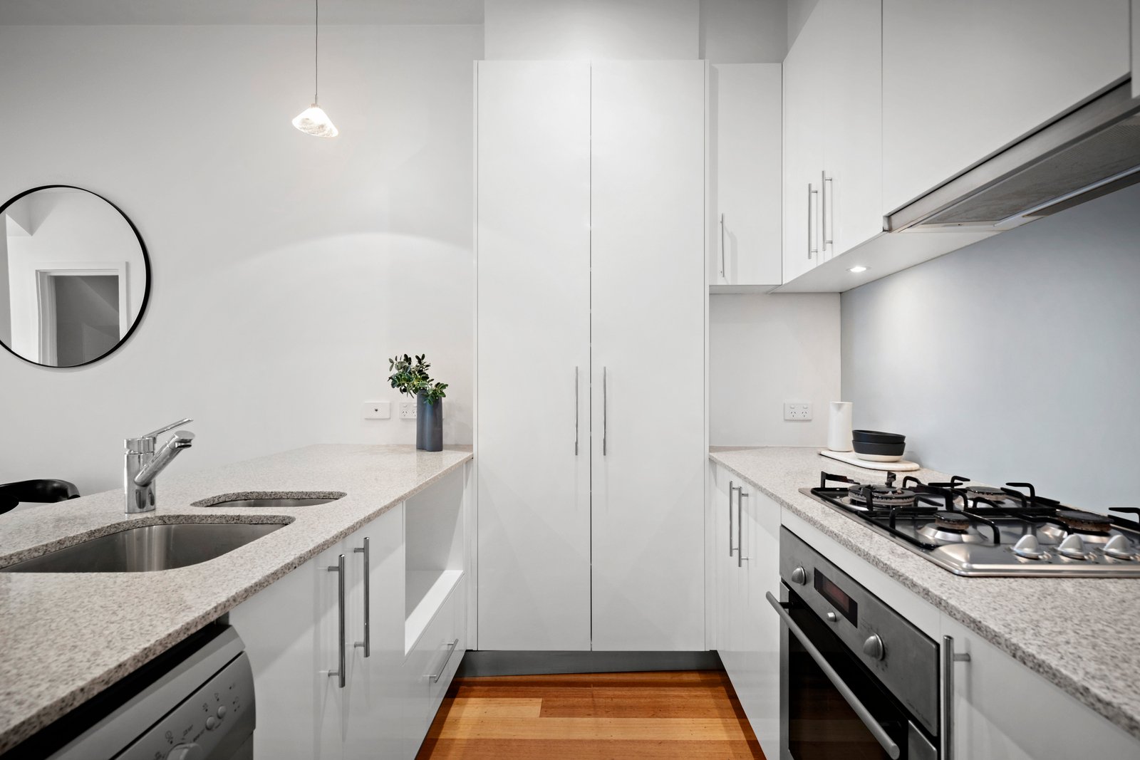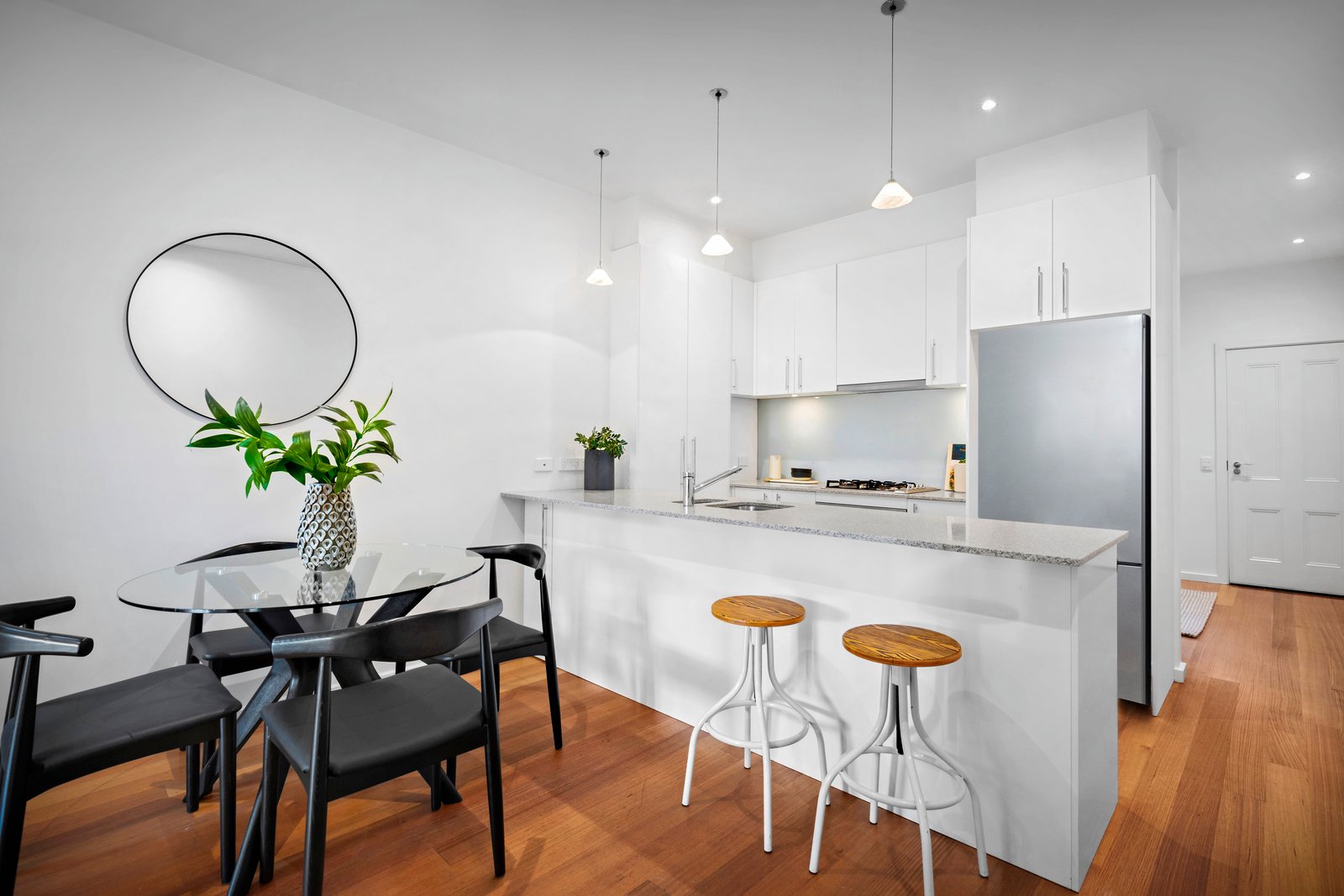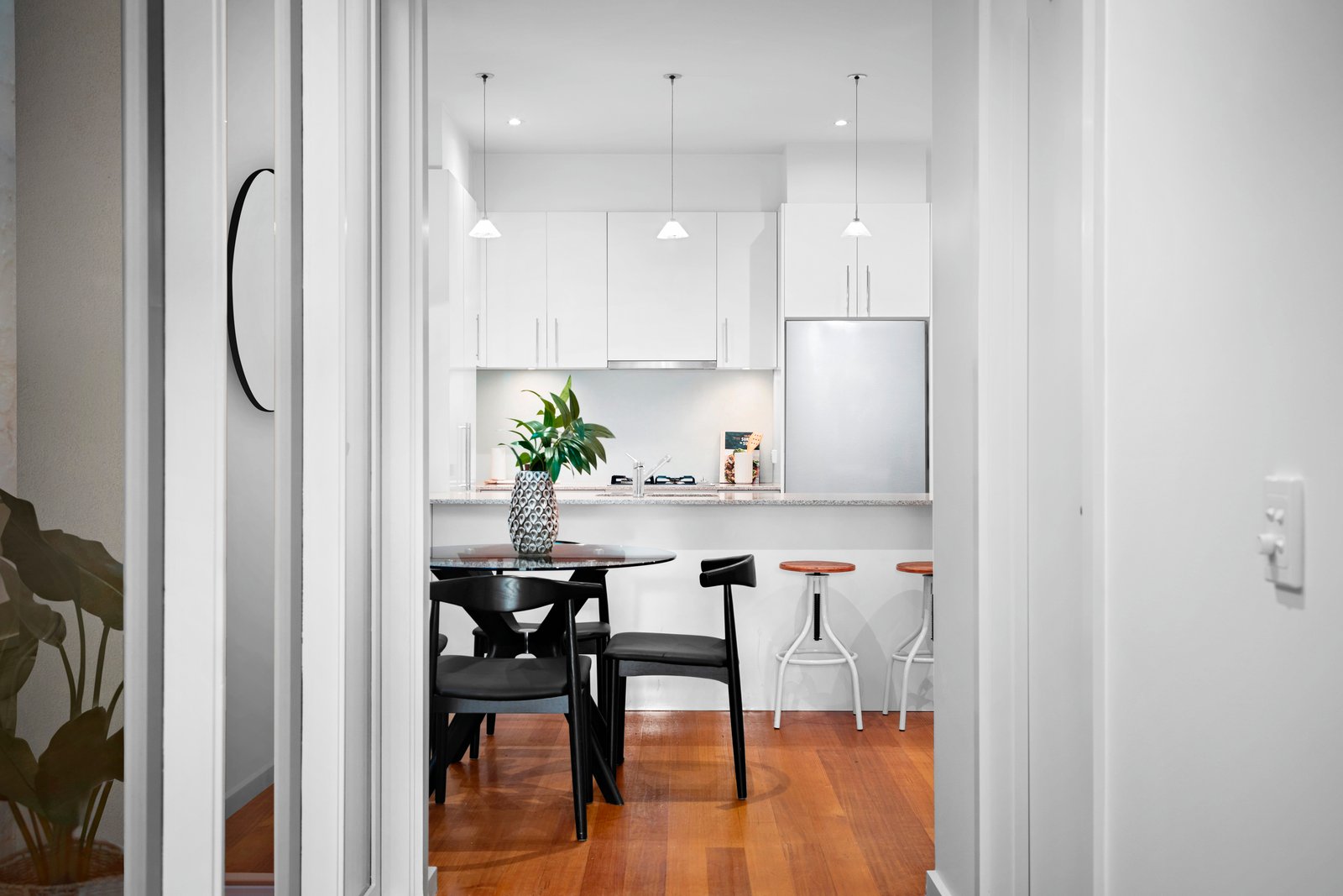 Immediately inviting, the unexpected interior dimensions offer seamless living and brilliant natural light from a northwest aspect, captured through multiple outdoor spaces. The two living areas, anchored by the central granite-bench kitchen and meals domain, enhance the modern and welcoming atmosphere. French doors extend outdoors to the expansive deck for alfresco entertaining, while the light-well courtyard ensures an effortless flow of northern light through the entire home.