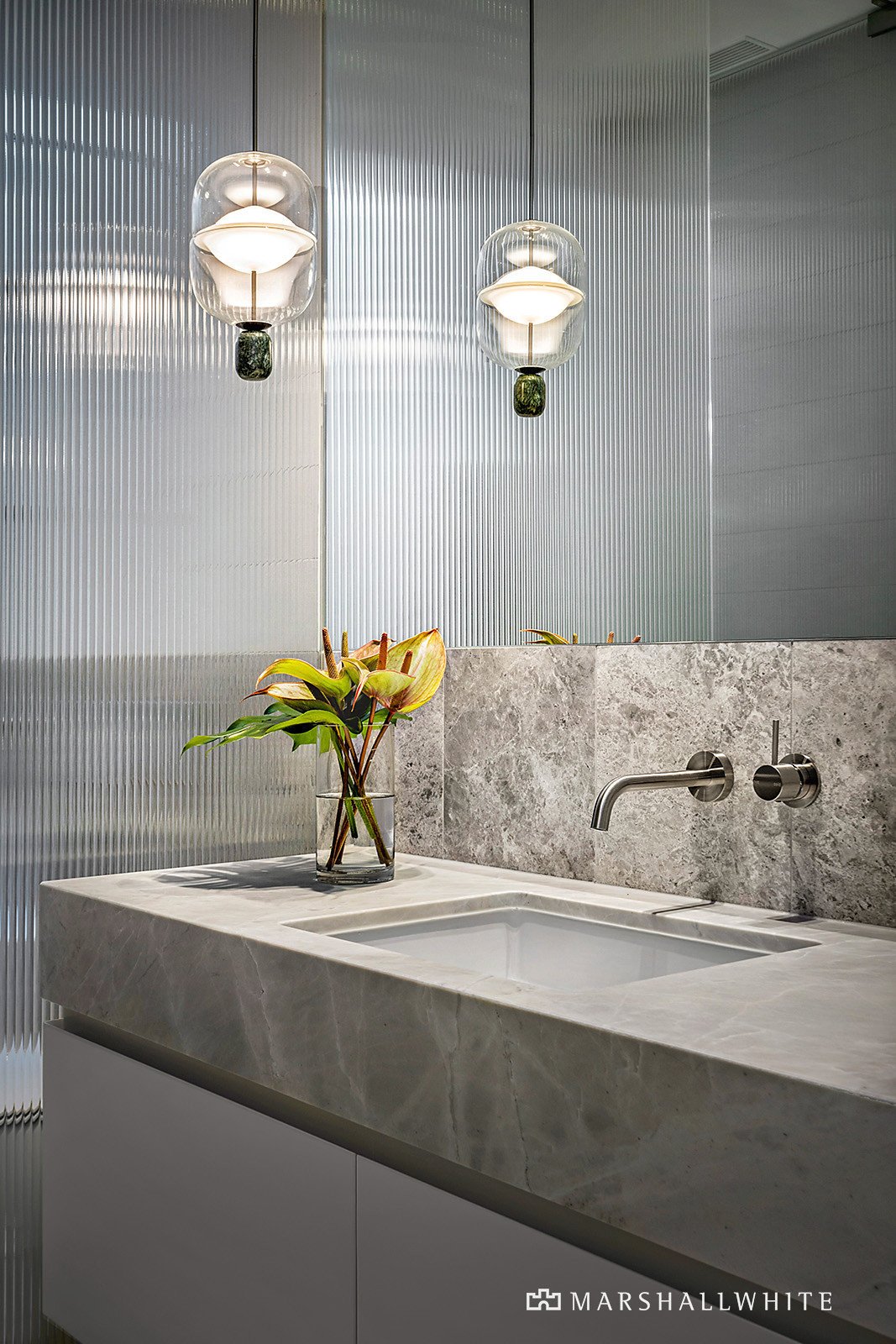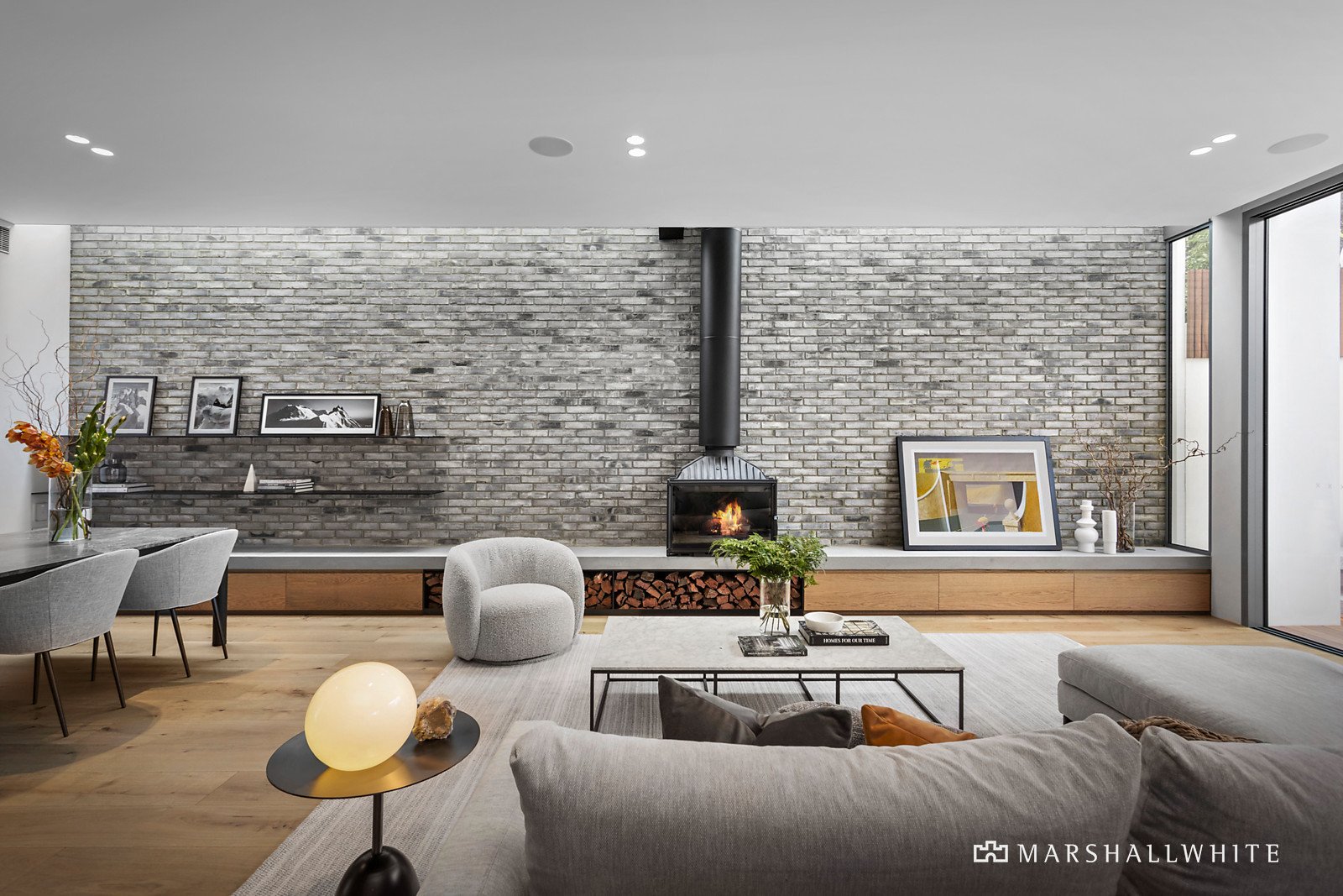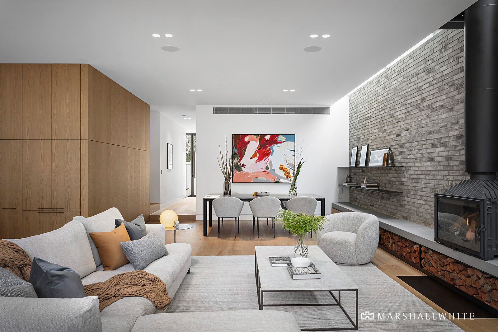 Interior dimensions reveal a cohesive palette of premium finishes including European Oak, Sky White Dolomite and Robertson's brick feature walls. A suspended garden across the entire frontage of the home and a custom designed steel framed door introduces an entrance foyer with bench seat and a refined sitting room with gas fire and bi-fold doors opening to the landscaped forecourt. Spectacular in scale beneath 3m ceilings and with a full wall of Robertson's bricks and a Cheminees Philippe fireplace, the expansive living and dining room is streaming with light through a full-length skylight and floor to ceiling glass stacking sliding doors. Living and entertaining extends out to a private northeast facing Blackbutt decked courtyard with mosaic tiled circular heated salt water plunge pool/spa and built in Artusi BBQ. A sleek work of art, the streamlined state of the art kitchen is appointed with Sky White Dolomite benches, Gaggenau appliances including steam oven and warming drawer, Zip tap, integrated fridge/freezer and 2 Vintec wine fridges. The adjacent laundry is also the perfect butler's pantry. Enjoying a picturesque outlook over Caroline Gardens, the magnificent main bedroom is appointed with European Oak walk-through robe and a deluxe marble en suite with Apaiser bath, heated floor and steam shower. Also upstairs, there are two additional double bedrooms with robes, a fitted home office with European oak desk and a stylish bathroom. A third designer bathroom is downstairs.