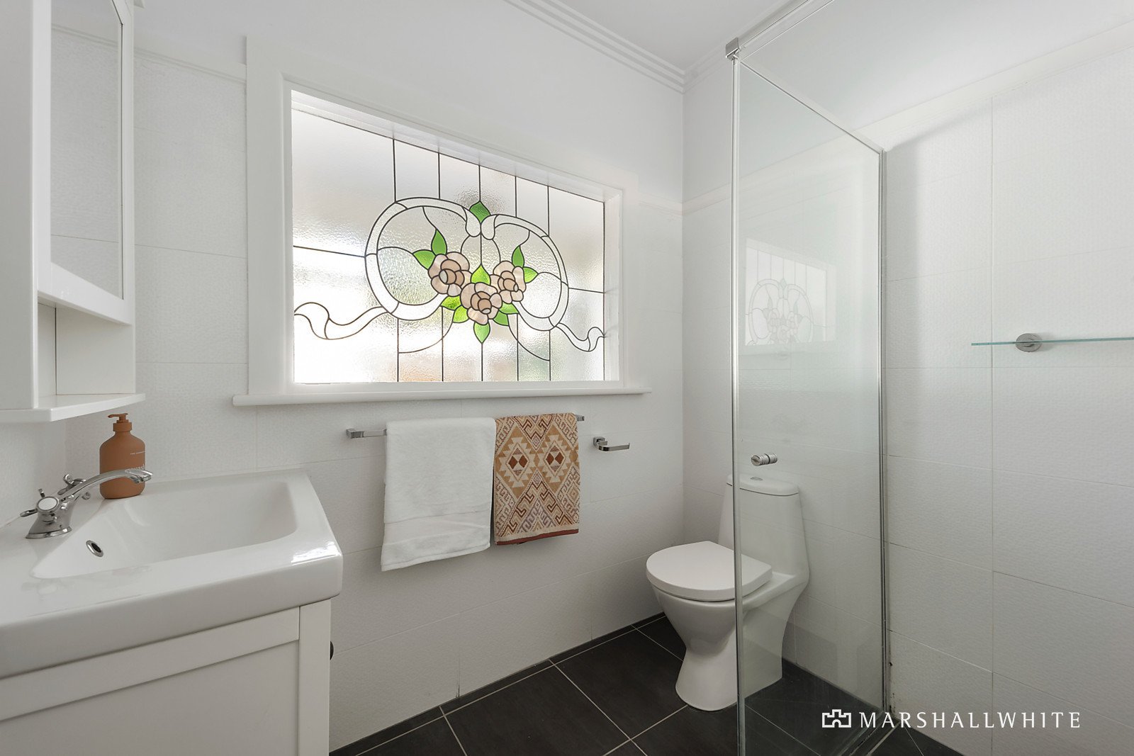 The two bathrooms are each stylishly finished - one with a leadlight feature window and the other with ample laundry space.