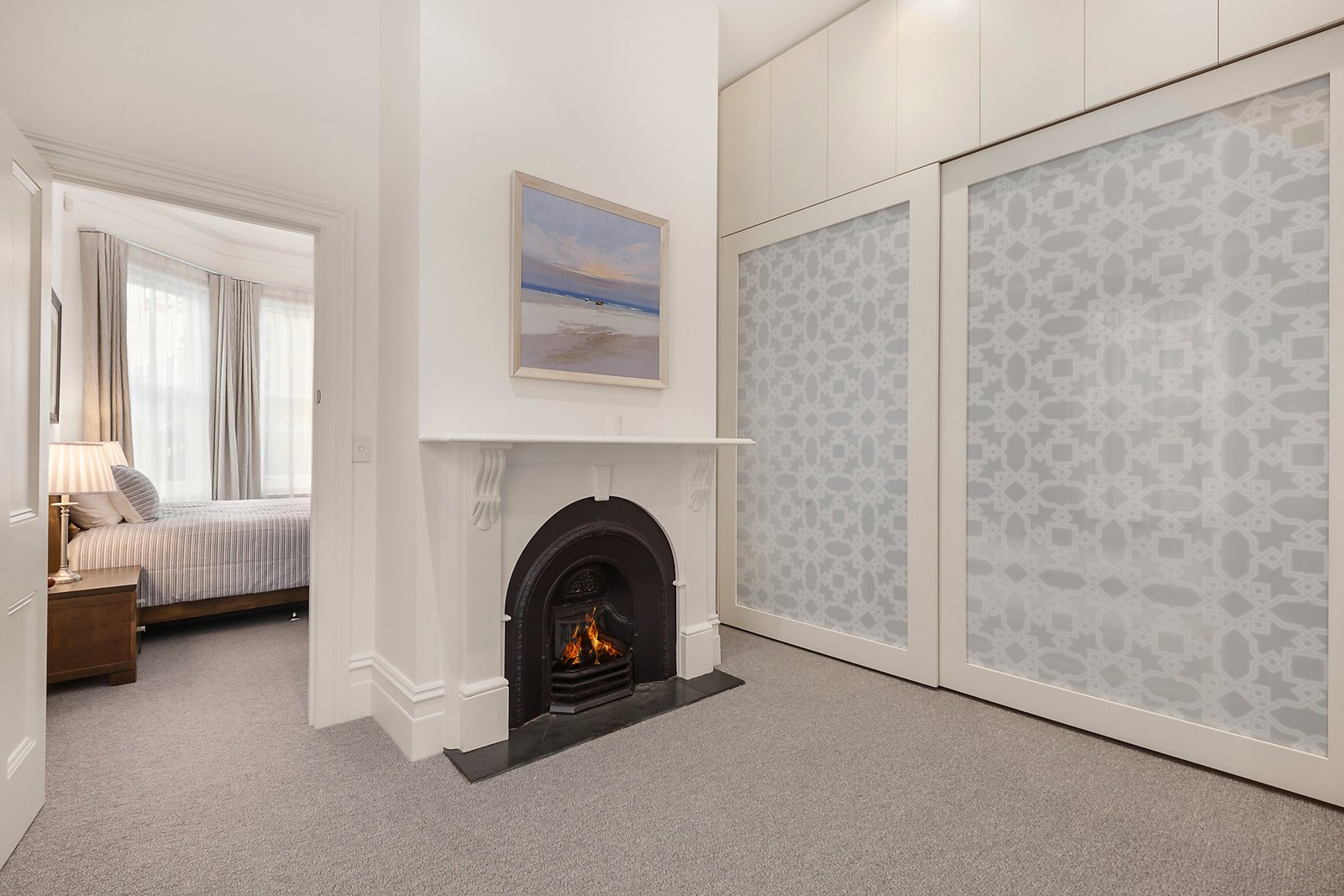 The crisp, all-white interior of generous proportions features satin finish brush box flooring, flanked by a beautiful formal sitting room, main bedroom with dressing room, fully-tiled ensuite and triple bay window; two further bedrooms are zoned upstairs with a pristine family bathroom. A fourth bedroom or study, powder room, and laundry are also downstairs. The rear architectural extension, which is almost invisible from the street, is designed around curves, creating a warm and inclusive kitchen, living and dining area and flows around the deck creating a magnificent indoor/outdoor entertaining area. The living room features a soaring ceiling, peripheral Led lighting, and a polished concrete and sandstone floating fireplace incorporating entertainment units overlooking the state-of-the-art kitchen equipped with a 7metre stone bench plus an island bench, WIP and prestige Smeg and Asko appliances.